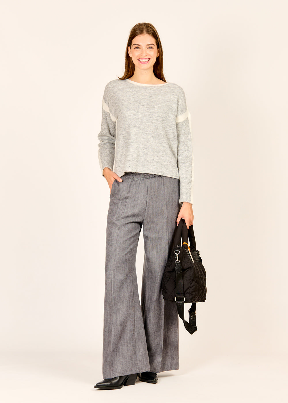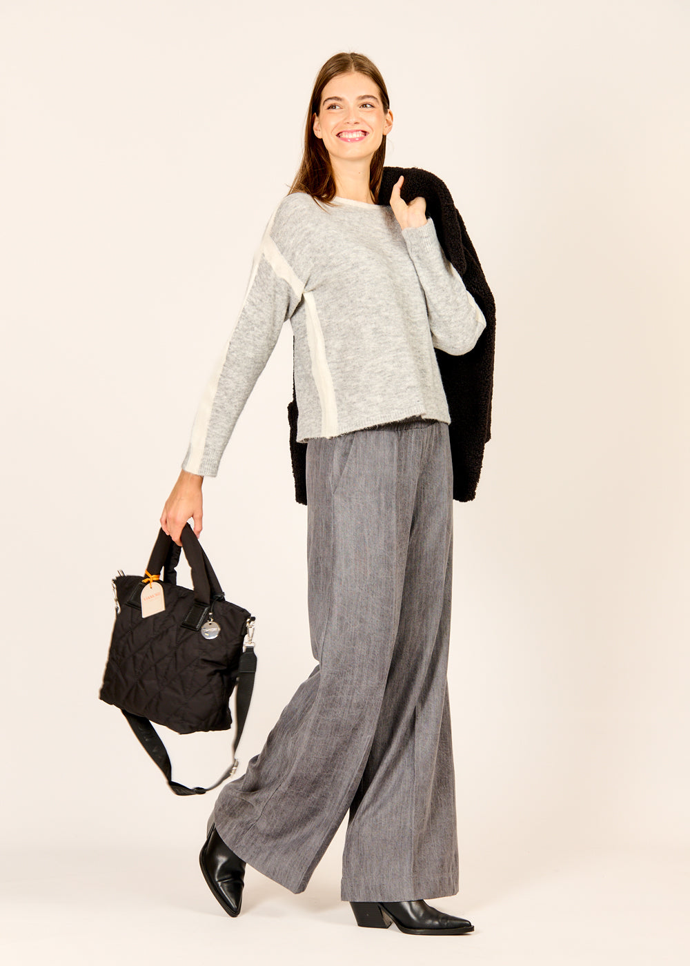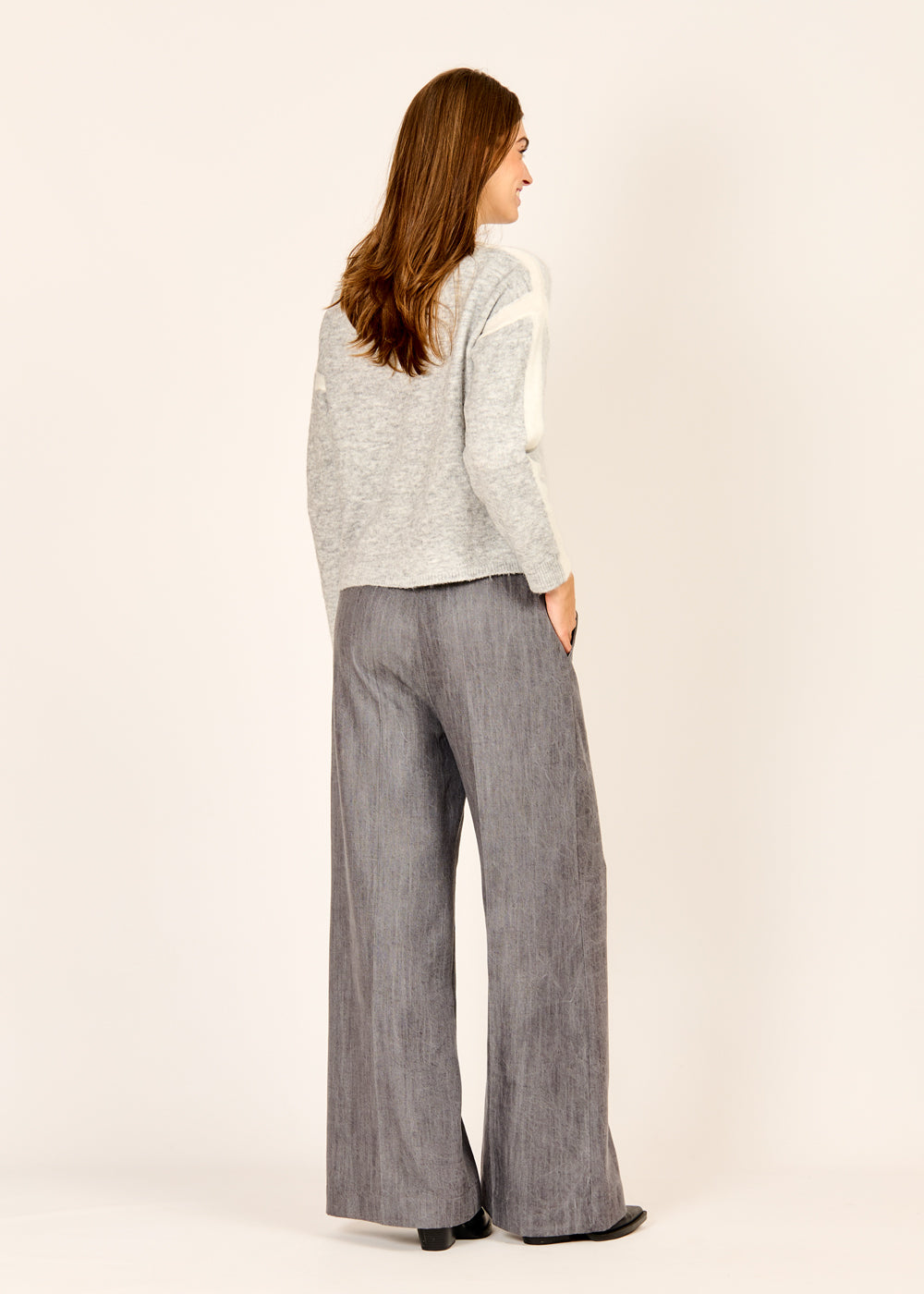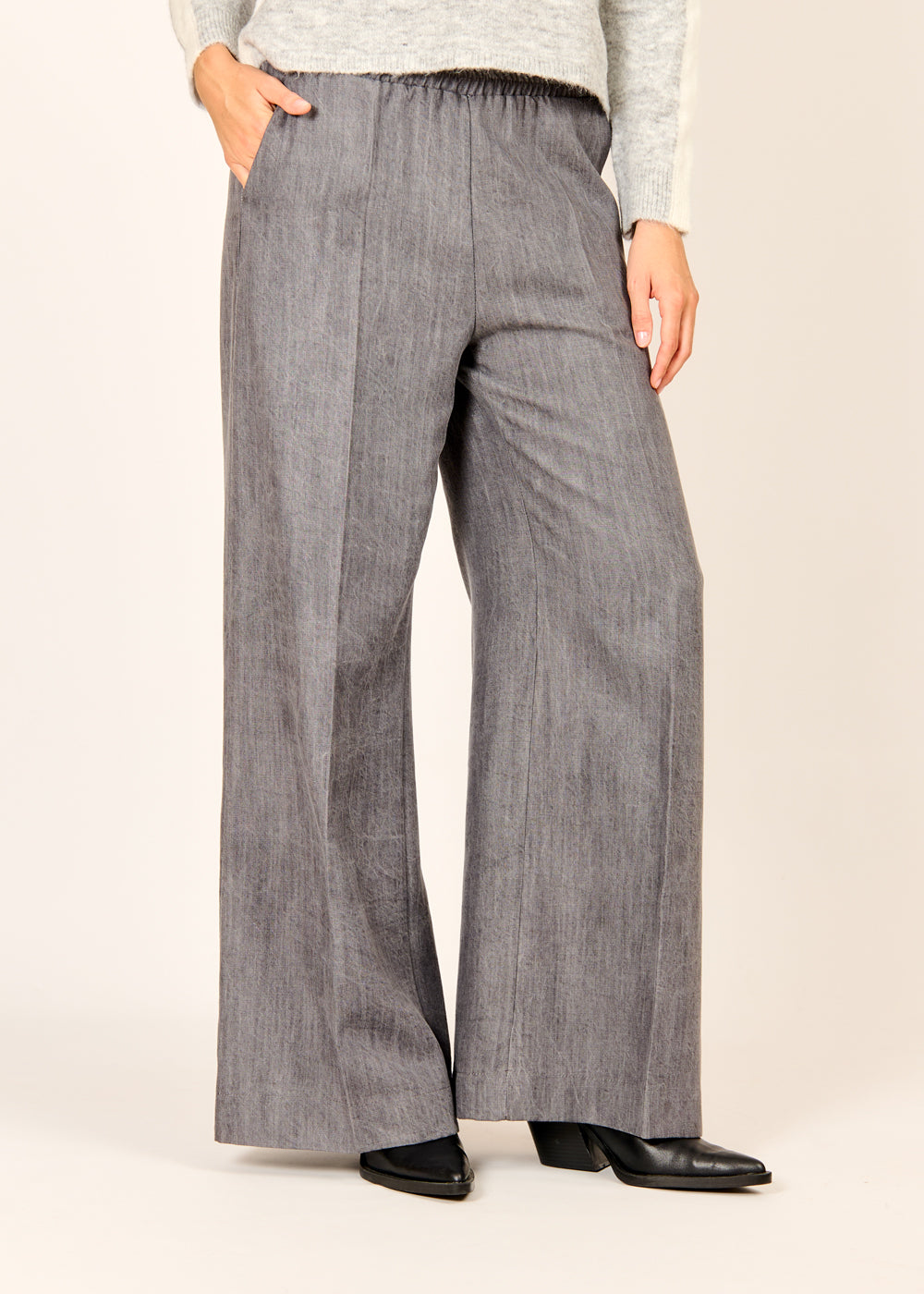 Die weite Hose in stilvollem grigio verbindet moderne Lässigkeit mit zeitloser Eleganz. Ihr fließender Schnitt sorgt für einen femininen Fall und maximalen Tragekomfort. Ob im Büro oder in der Freizeit – dieses Modell ist ein vielseitiges Statement-Piece für jeden Anlass.
