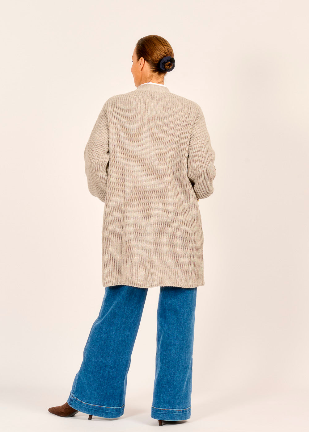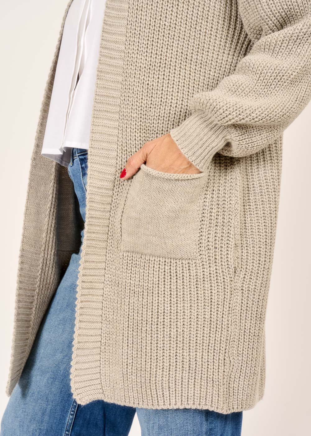 Erlebe lässige Eleganz mit unserem langen Strickmantel in einem edlen Taupe-Ton. Die grobe Strickstruktur und der lange Schnitt machen ihn zum perfekten Layering-Piece. Ob über einem schlichten Hemd oder einem kuscheligen Pullover, dieser Mantel verleiht jedem Look eine entspannte und stilvolle Note.