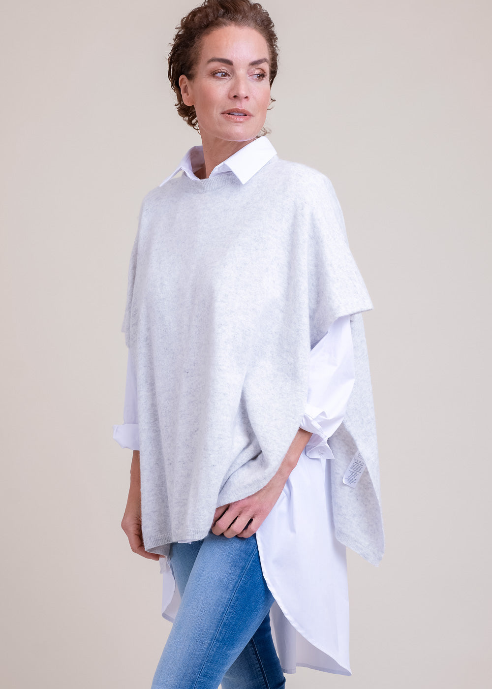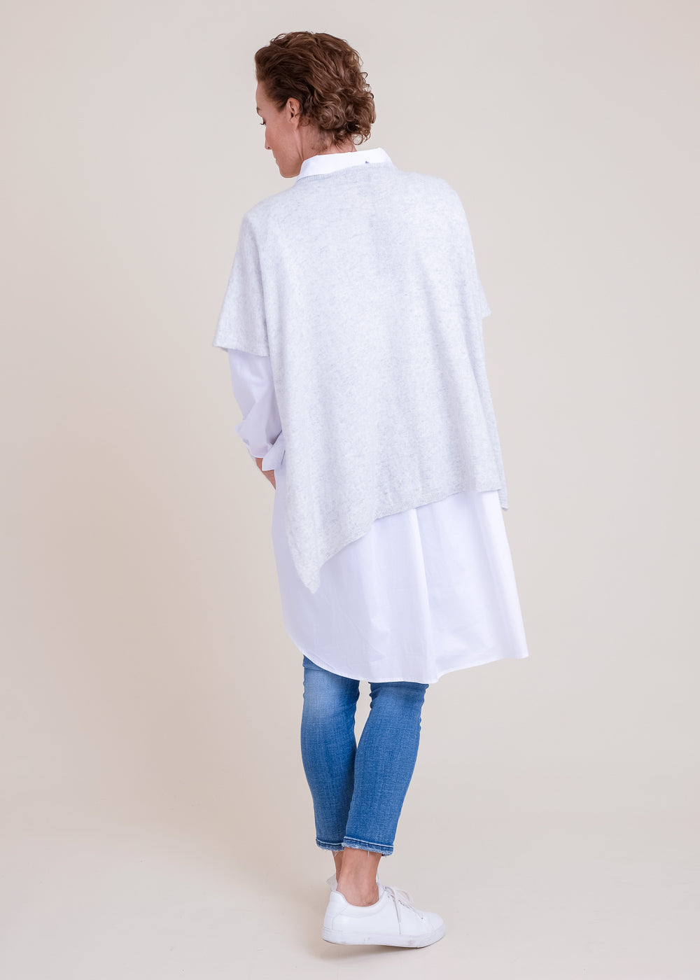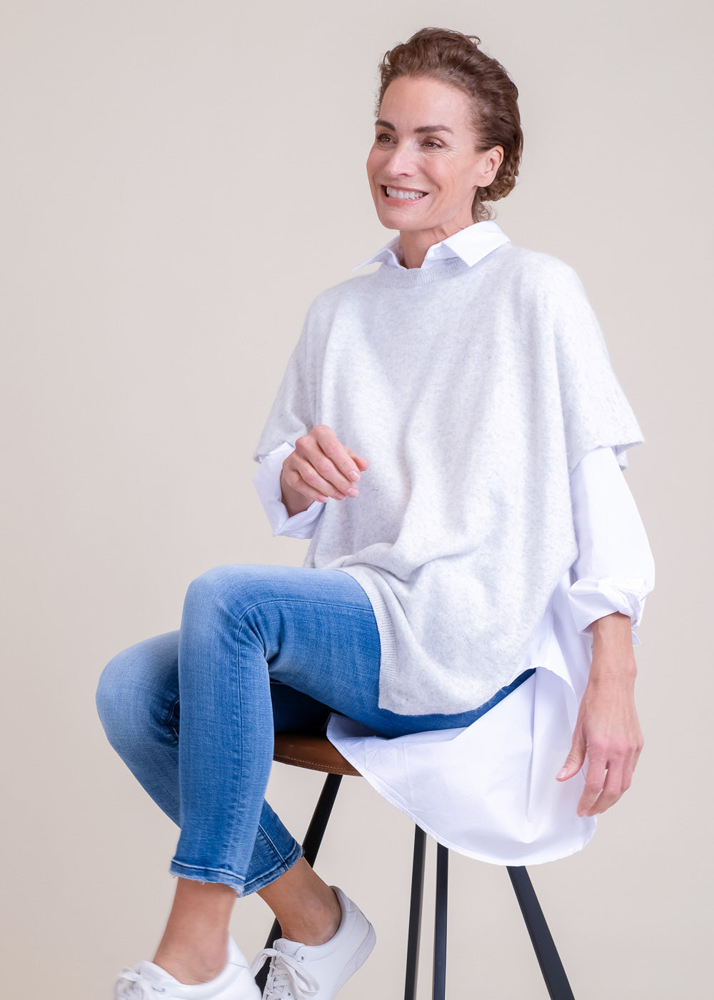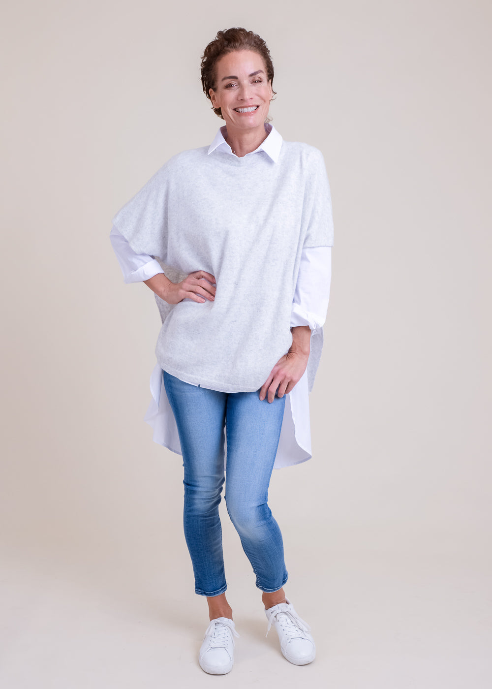 Kastenförmig geschnittener Pullover mit kurzen Ärmeln. Schmales Rippbündchen am Ausschnitt und lange Schlitze in der Seite. Großartiges Garn mit Kaschmiranteil. Länge:68cm.