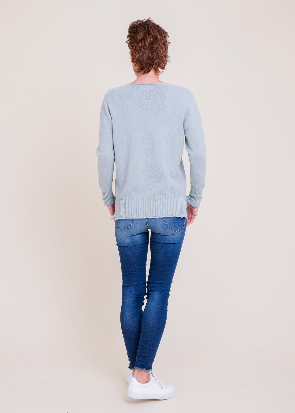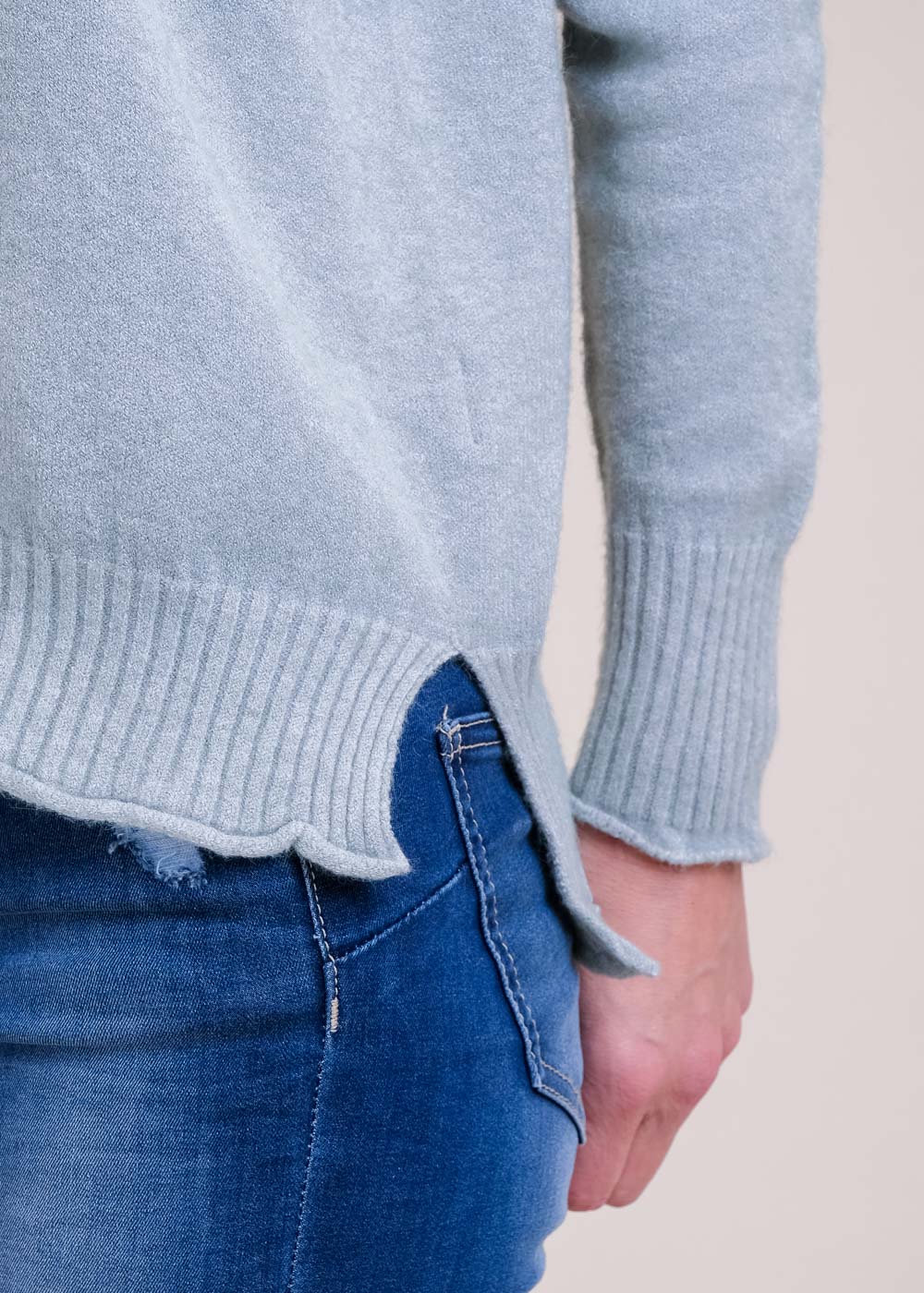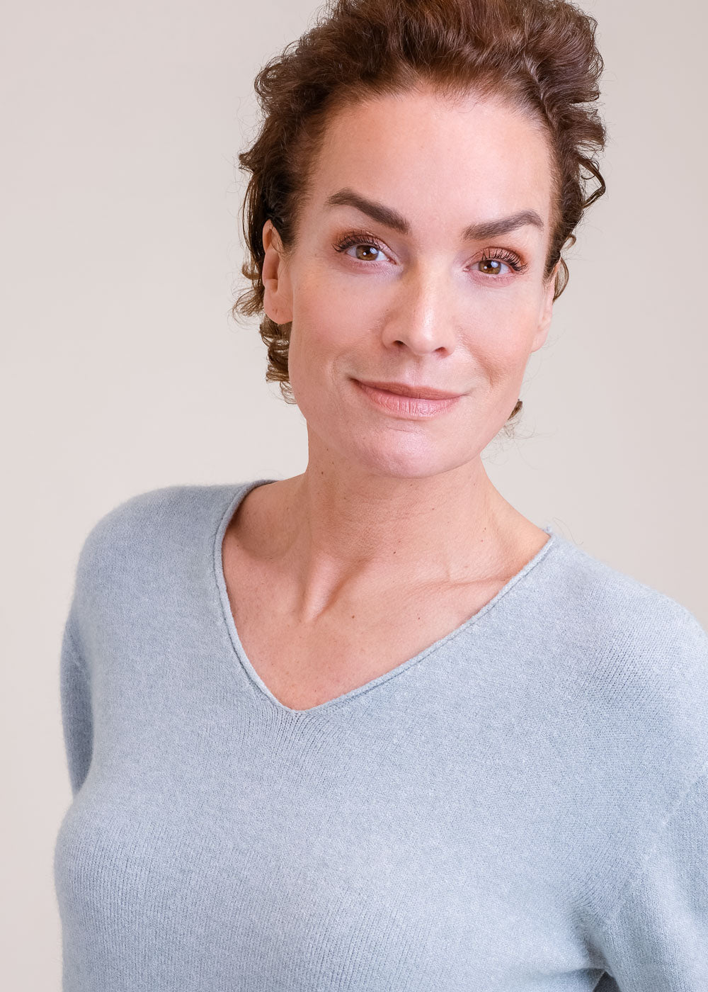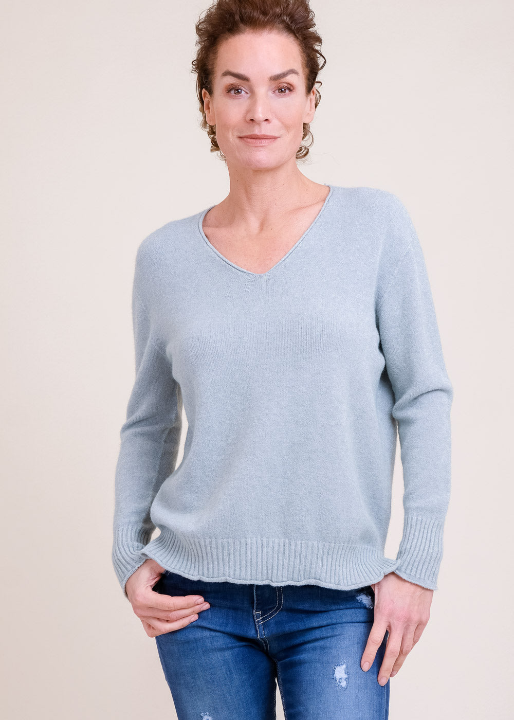 Gemütlicher V-Ausschnitt Pullover aus unserem Bestseller Garn. Vorne kürzer geschnitten als hinten mit seitlichen Saumschlitzen. Rippenbündchen an den Ärmeln und am Saum. Gemütlicher und zeitloser Begleiter. Länge:60cm.