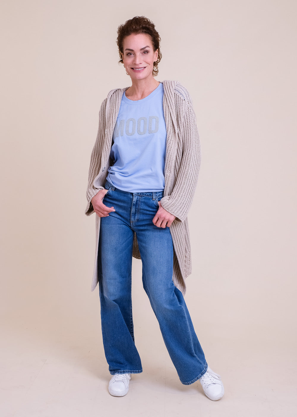 Lang geschnittene Grobstrickjacke aus reiner Baumwolle. Mit Kapuze und Druckknöpfen zum Schließen. Lässt sich großartig kombinieren. Länge:100cm.