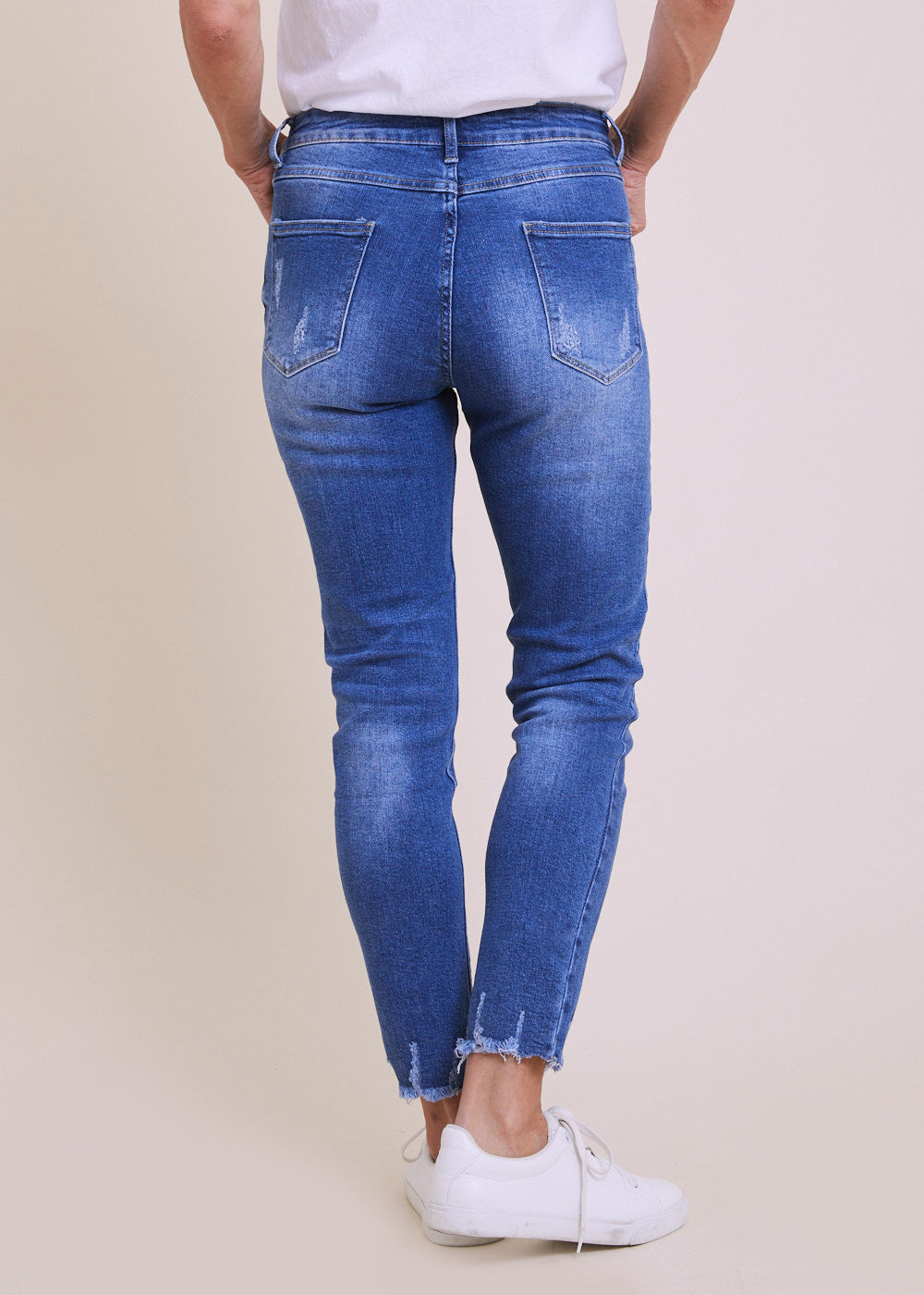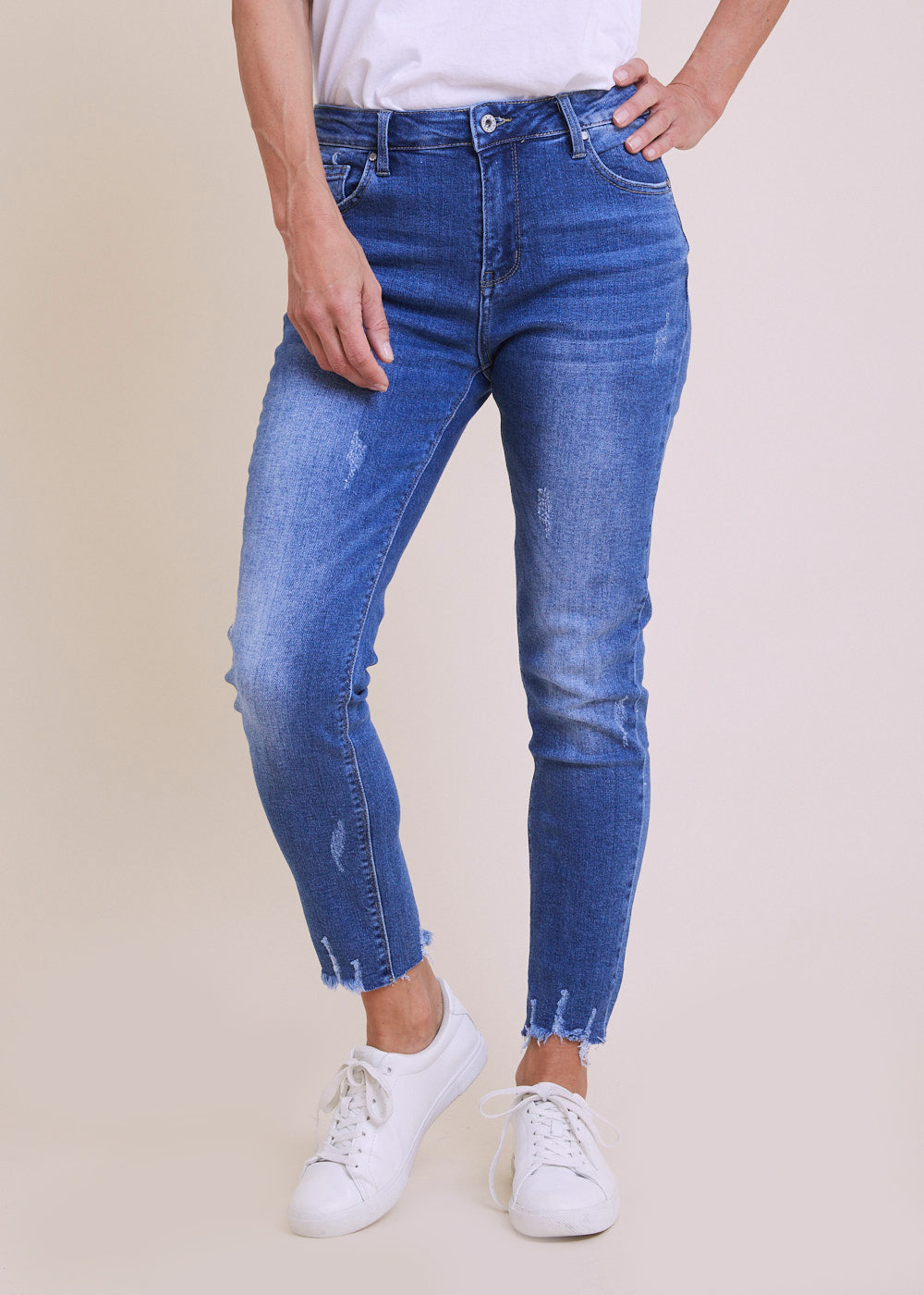 Schmale Röhrenjeans mit desroyed Details. Daher passt sie perfekt zu coolen Styles. Der angenehme Baumwollmix sorgt für einen angenehmen und bequemen Tragekomfort. Durch die offenen Kanten an den Saumabschlüssen, sieht diese Jeans großartig in der Kombination mit Sneakern aus. Die perfekte Alltagsbegleiterin! Länge:91cm.