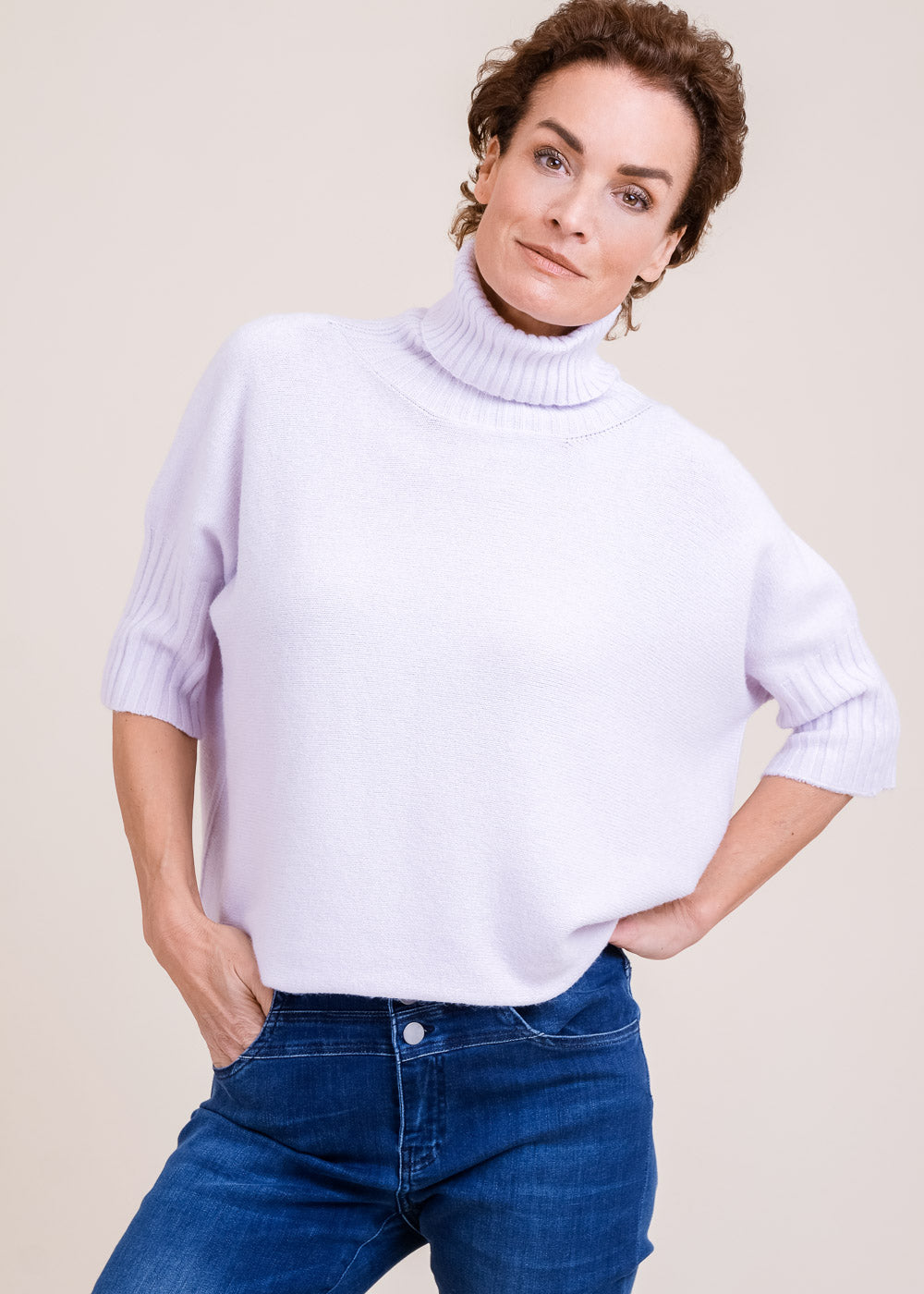 Kurz geschnittener Rollkragen Pullover mit halb Arm. Rippendesign an den Ärmeln sowie am Rollkragen. Aus unserem kuschelweichen Garn. Großartig kombinierbar mit einer höher geschnittenen Hose und einem Blazer. Länge:57cm.