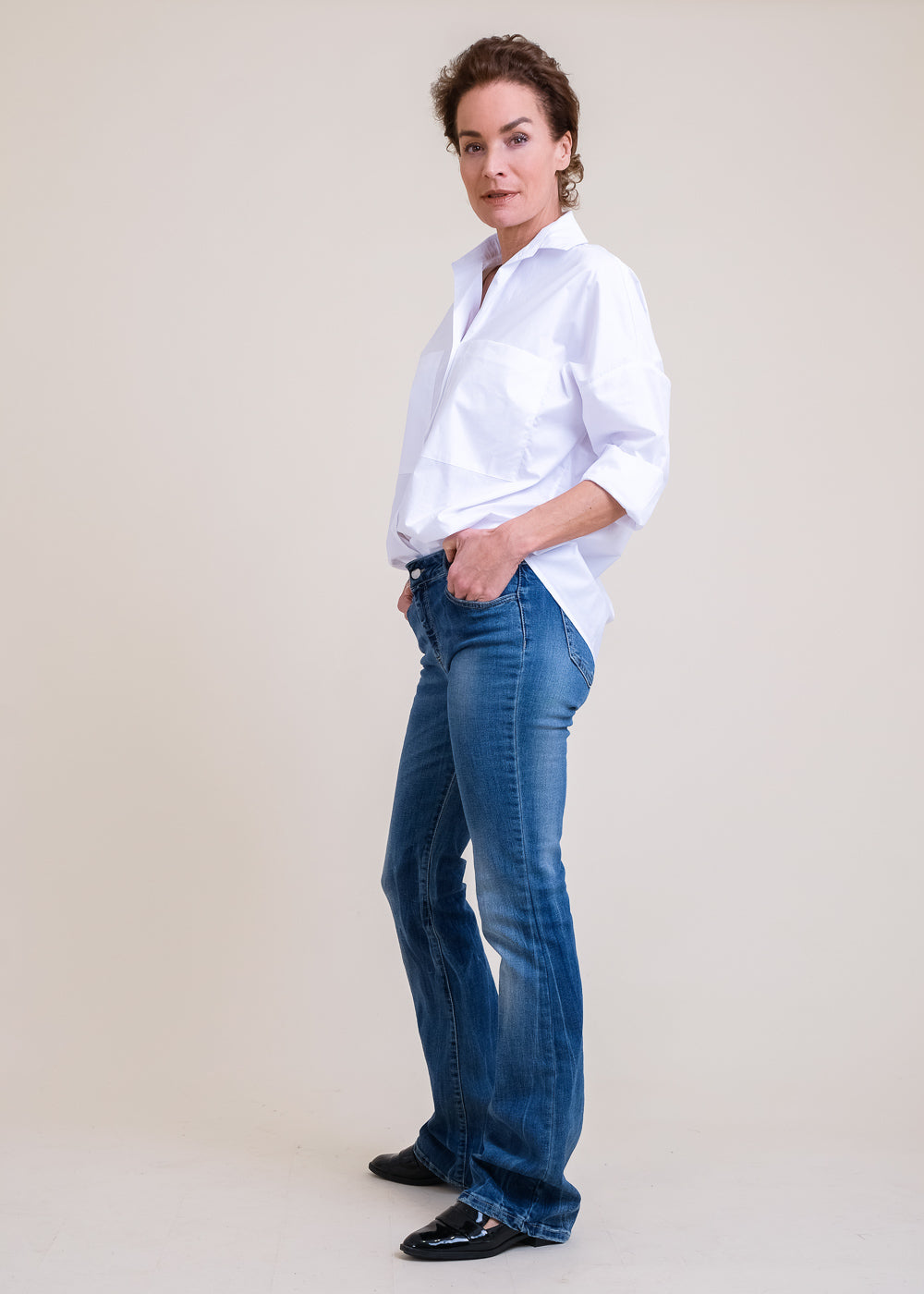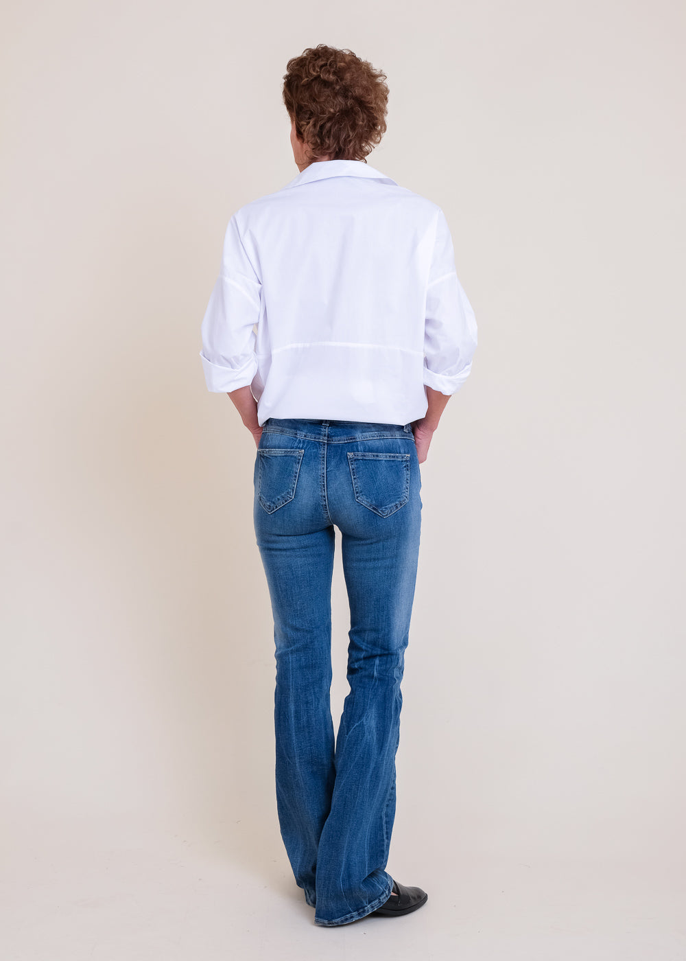 Lang geschnittene Bootcut Jeans in einer leichten Waschung und einem höheren Bund. Die figurbetonte Jeans mit unten weit ausgestelltem Bein passt sich durch ihre elastischen Denimqualität bequem an. Man trägt diese Bootcut-Jeans zu Stiefeln, zu High Heels oder ganz casual einfach zu Sneakern. Länge:111cm.