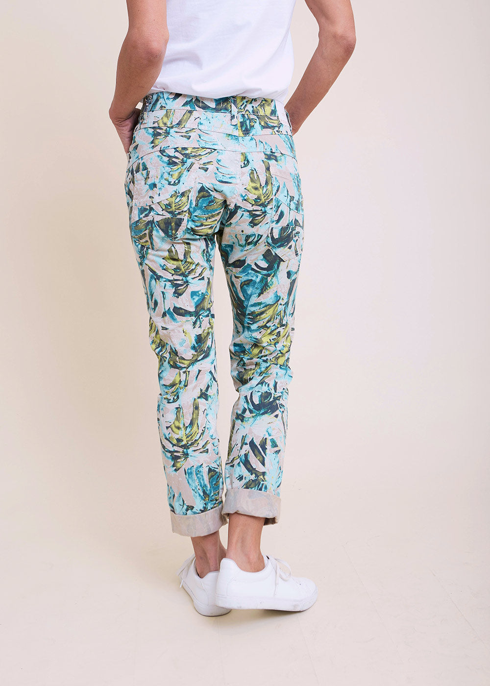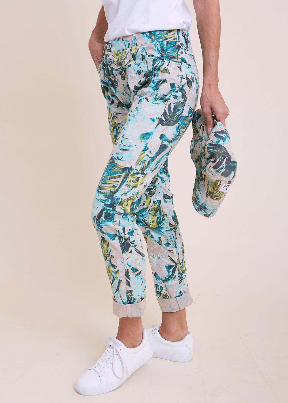 Boyfriend Jeans P78A von Please mit einem Palmendruck Motiv. Sie hat eine besondere Nahtführung für einen schönen Sitz und eine Figurbetonte Passform mit normaler Leibhöhe. Großartig gekrempelt zu einem Sneaker. Mit dem berühmten Herz-Please Metall Label. Ein absoluter Hingucker.