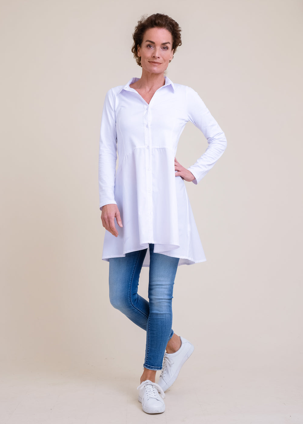Länger geschnittene Bluse mit Hemdkragen und Knopfleiste. Das Design punktet mit der schönen A-Linie. Besonders gemütlich durch seinen Jersey Stoff im Arm Bereich und im Body Bereich. Hinten länger geschnitten als vorne. Länge:88cm.