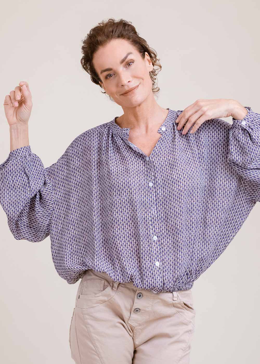 Bluse im Print Design, mit Knopfleiste und Gummizug im Saum, aus reiner Viskose. Überschnittenen Schultern und schmal geschnittenen Manschetten. Ein absoluter Hingucker und perfekt in der Kombination mit Jeans und weißen Sneakern. Länge:60cm.