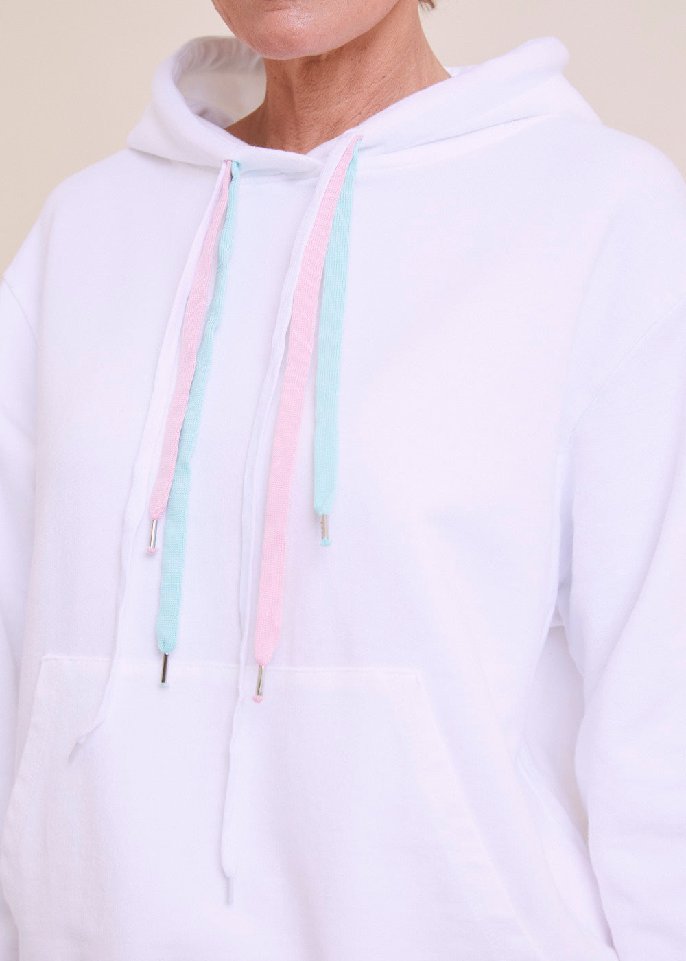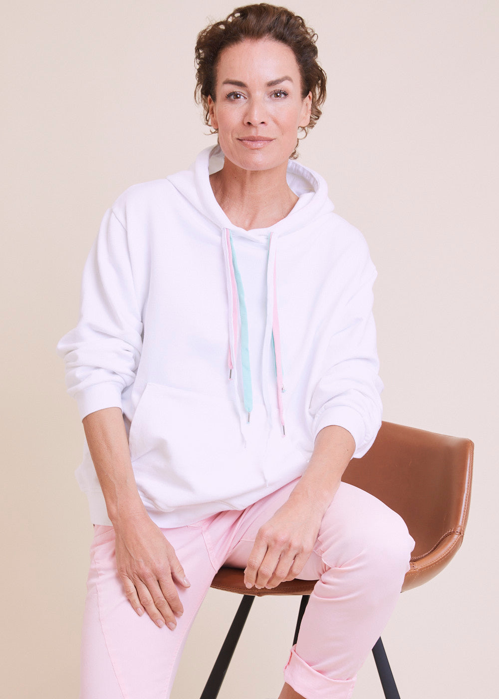Lässig geschnittener Hoodie aus einer Baumwollmischung. Der Hoodie hat eine Jersey gefütterte Kapuze mit Kordelzug und besonderen farbigen Bändern. Kängurutasche, langen Ärmeln und breite Rippenbündchen an den Ärmeln und am Saum. Länge:74cm.