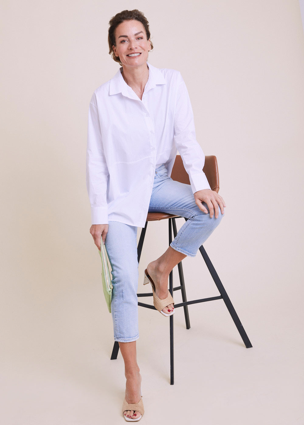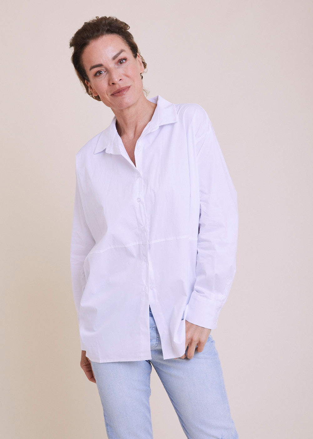 Locker und lässig geschnittene Hemdbluse. Sie hat überschnittene Schultern und lange Ärmel mit Manschetten. Kombiniere diesen Artikel gerne mit Jeans und Sneaker. Länge:70cm.