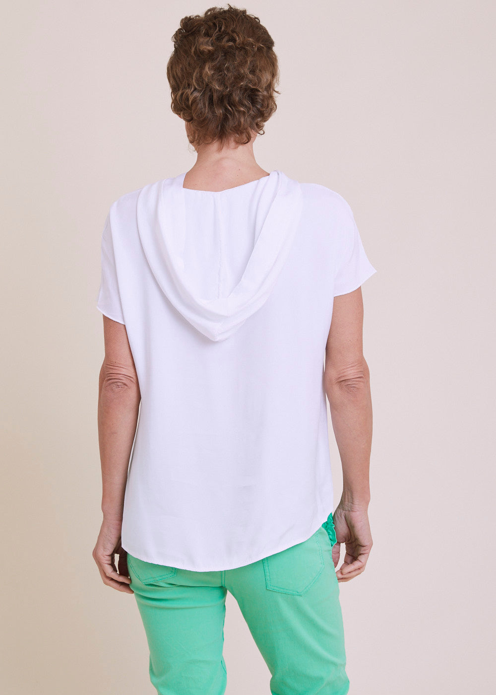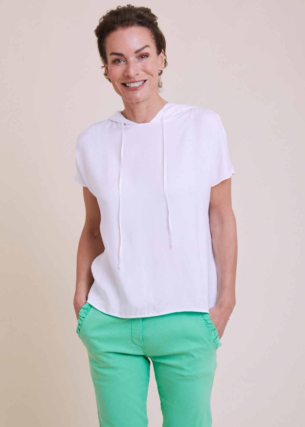 Locker geschnittene Bluse aus einem schönen Viskosemixmaterial. Im sportlichen Hoodie Style überrascht sie mit ihrer Kapuze. Mit kurz geschnittenen Armen und Banddetails.