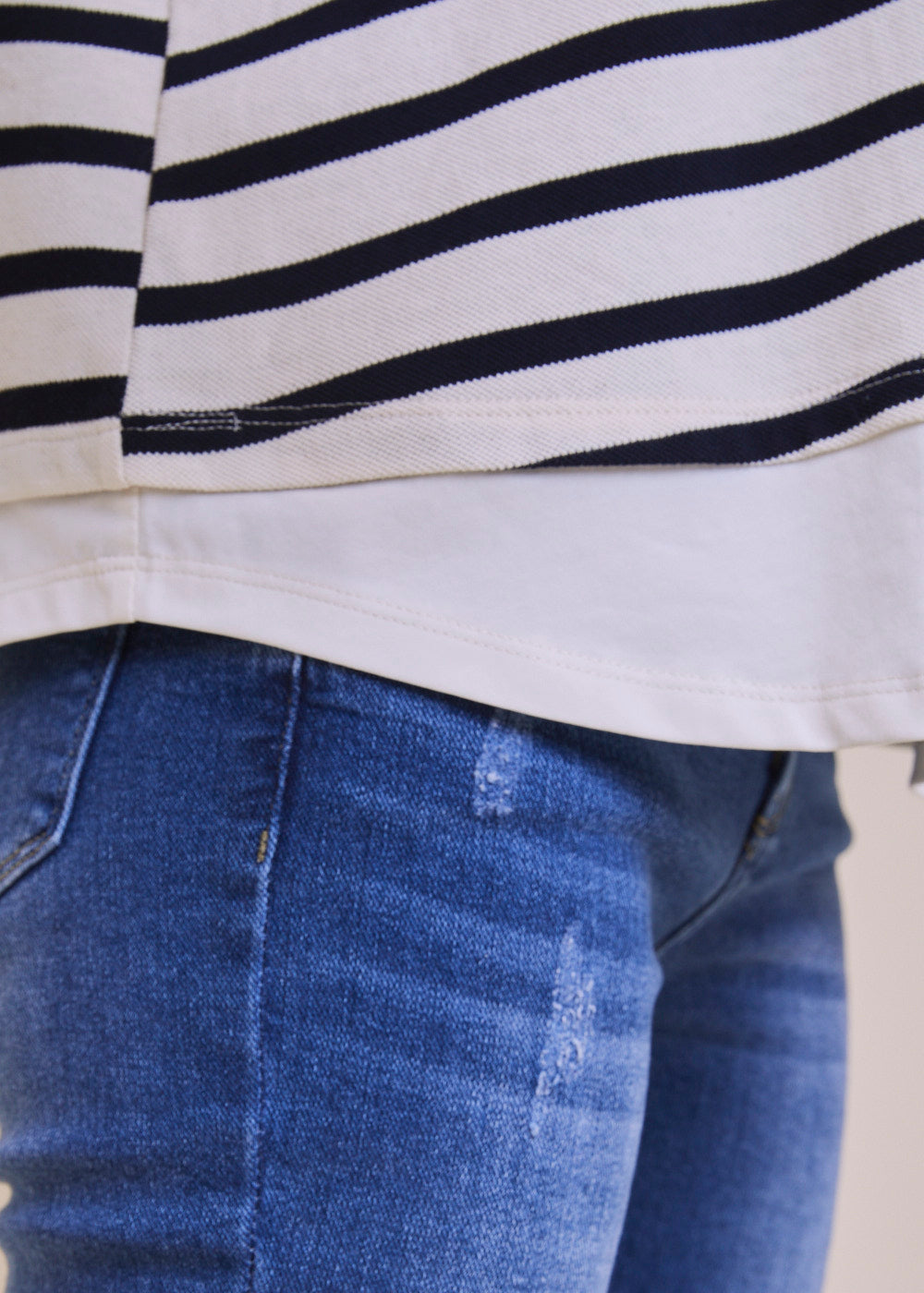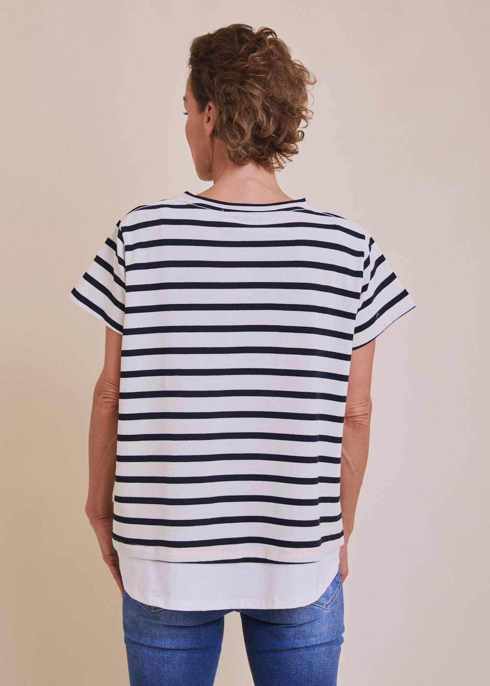 Kurzarmshirt mit Ringeln aus reiner Baumwolle. Es hat einen Rundhalsausschnitt und einen abgerundeten Saum mit einem leicht verlängerten Rückenteil. Perfekt zu Jeans und Sneakern für den sportlichen Look. Länge:70cm.