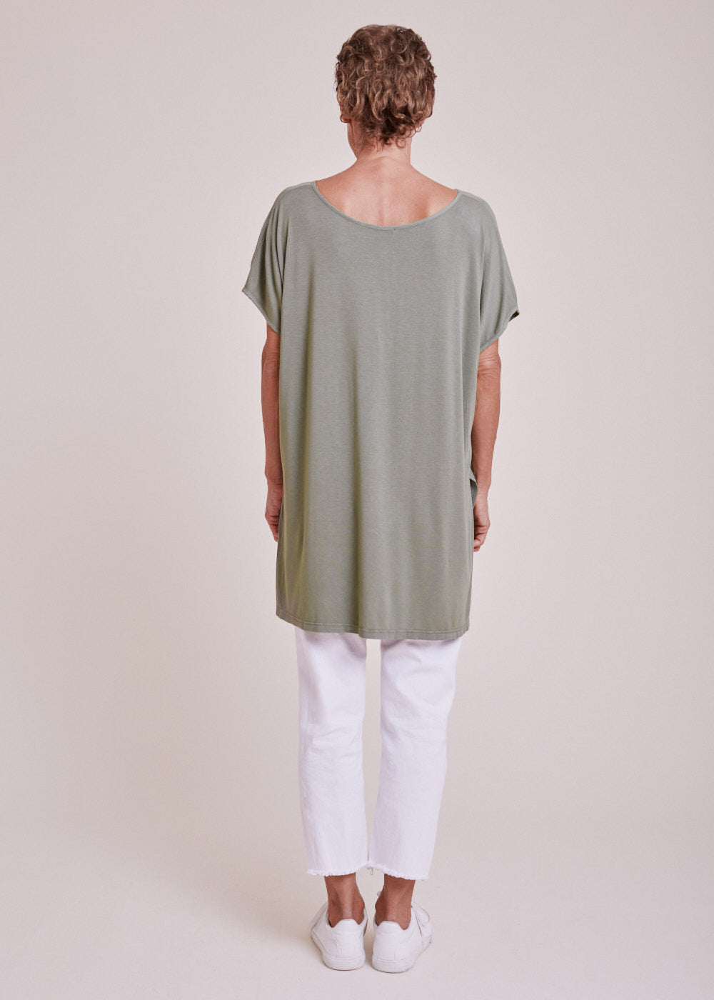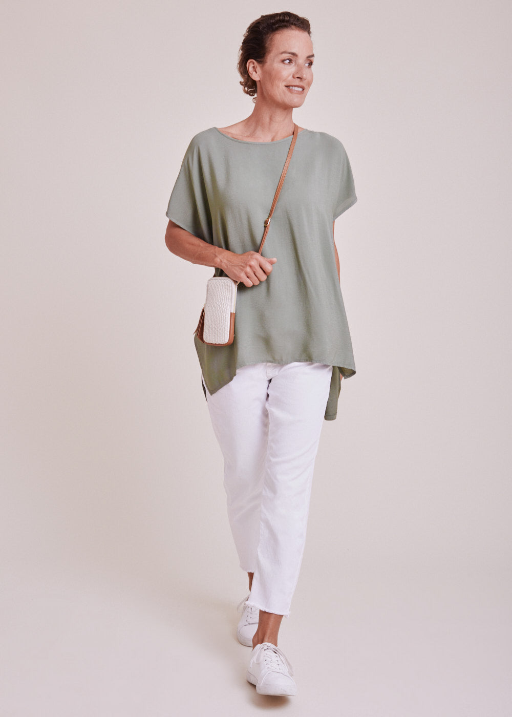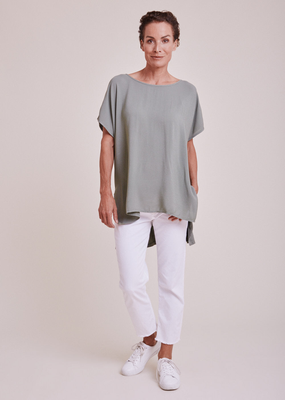Luftige Bluse mit Rundhalsausschnitt aus zwei Materialien. Das Shirt ist asymmetrisch geschnitten und wird nach hinten länger mit seitlichen Schlitzen. Ein wunderbarer Artikel für den Sommer und besonders schön in Kombination mit einer weißen Jeans.