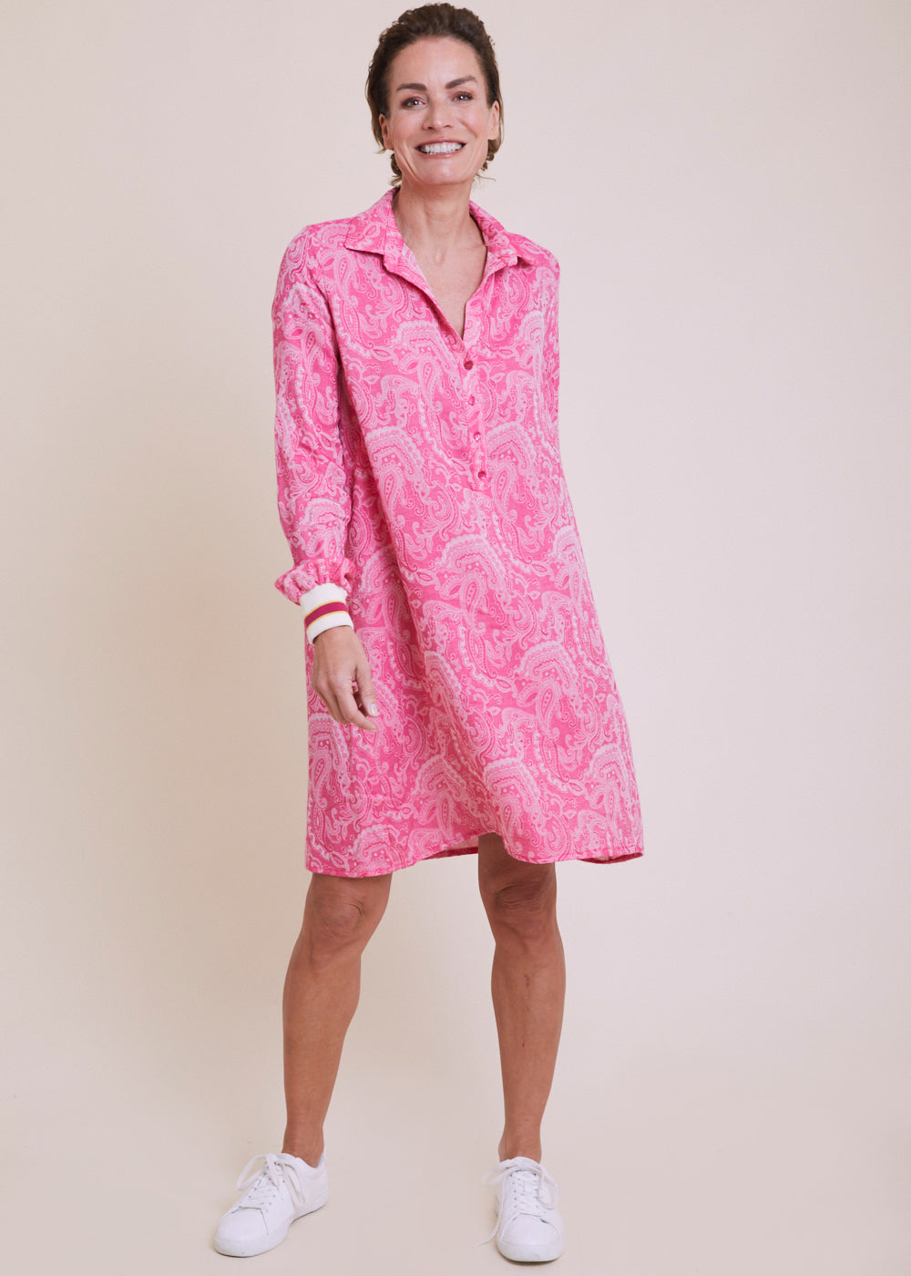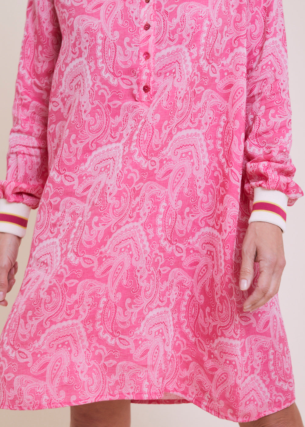 Lässig geschnittenes Kleid mit langen Armen aus einem Baumwoll und Viskosemix. Es hat besondere Rippenbündchen an den Armen, die dem Kleid einen großartigen Casual Touch verleihen. Mit einer Knopfleiste als Detail. Länge:100cm .