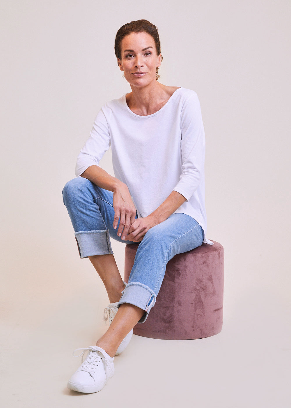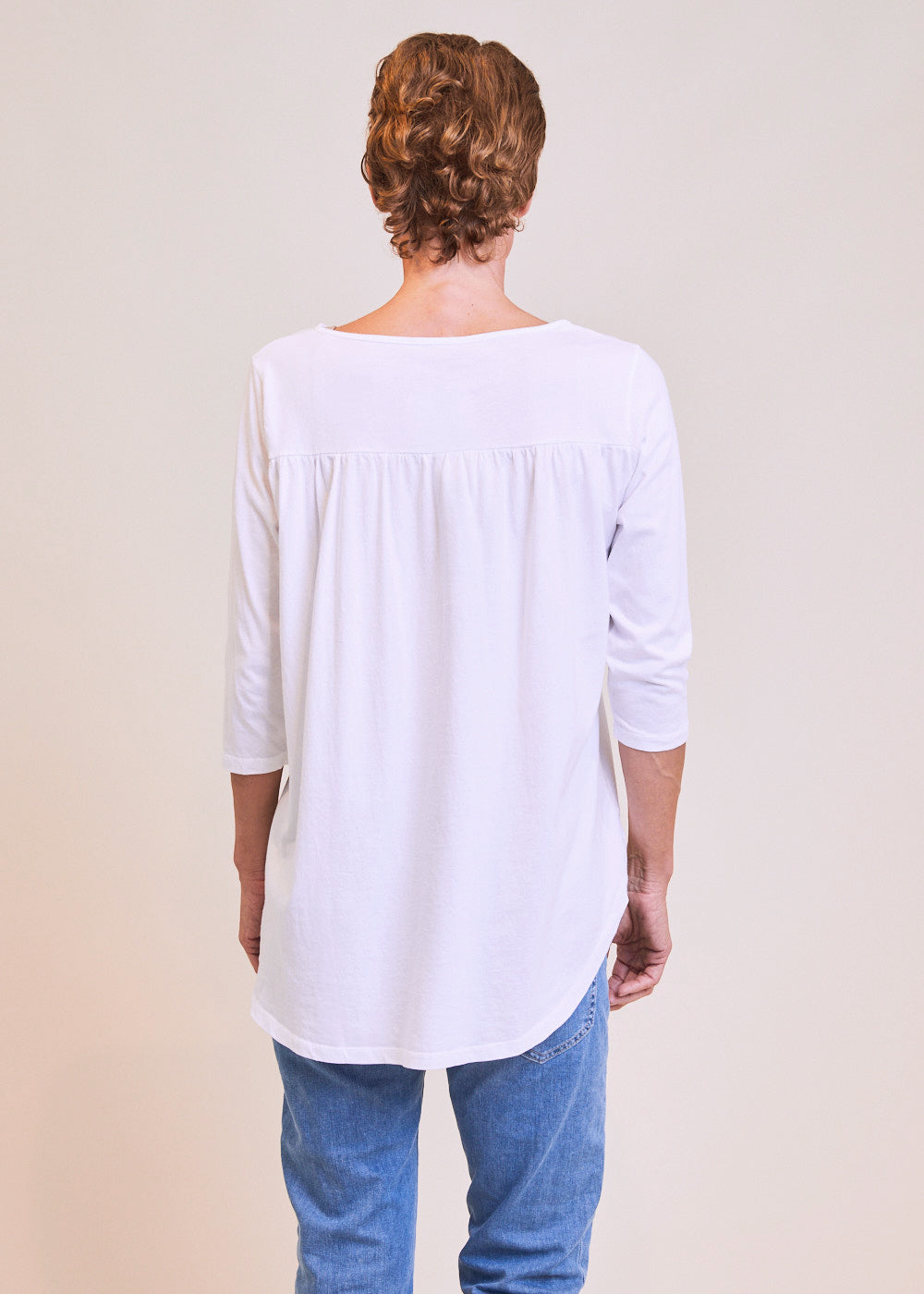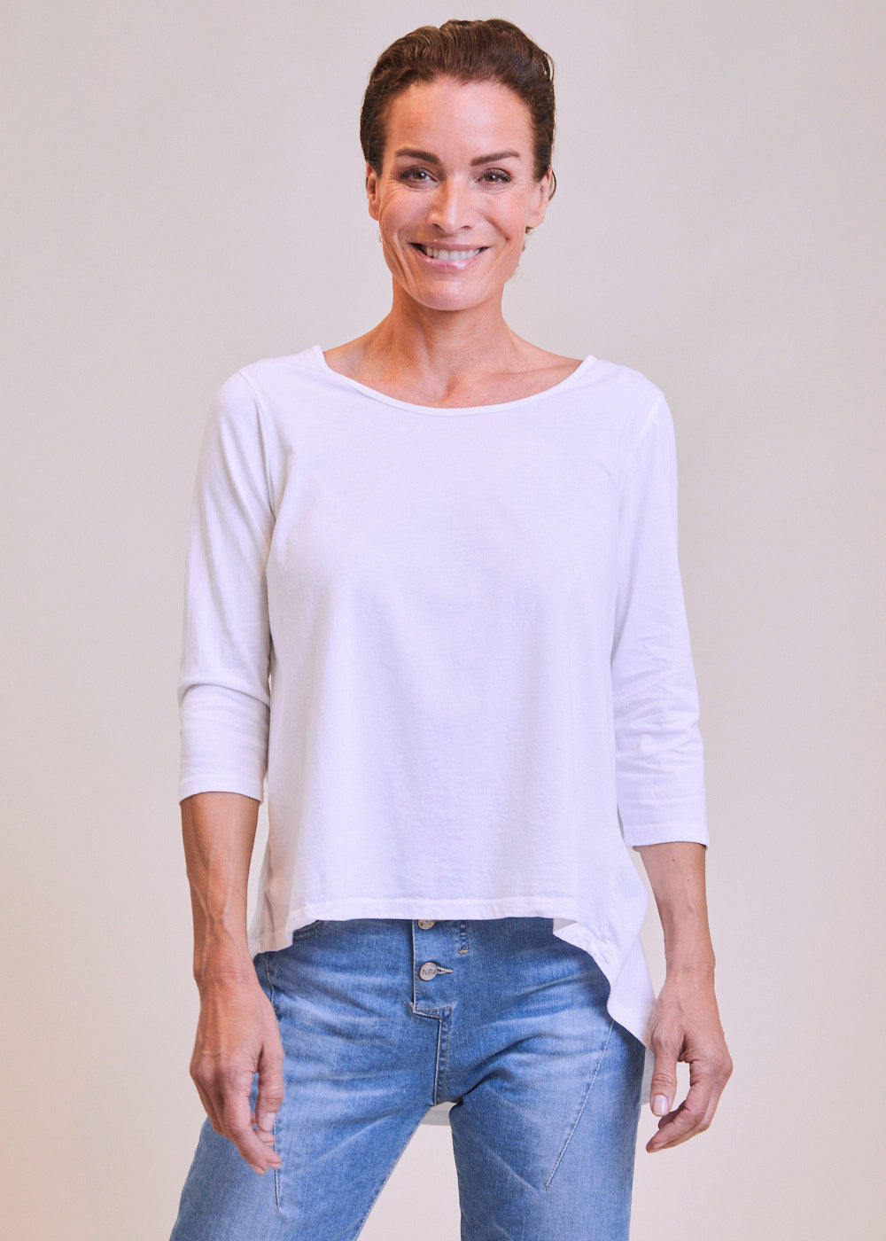 Basic-Shirt mit ¾- Arm aus 100% Baumwolle. Asymmetrischer Schnitt der nach hinten länger wird. Auf der Rückseite hat dieser tolle Kombinationsartikel eine horizontale Naht, die in einer Raffung entlang des Rückens mündet und für spielerische Leichtigkeit sorgt.