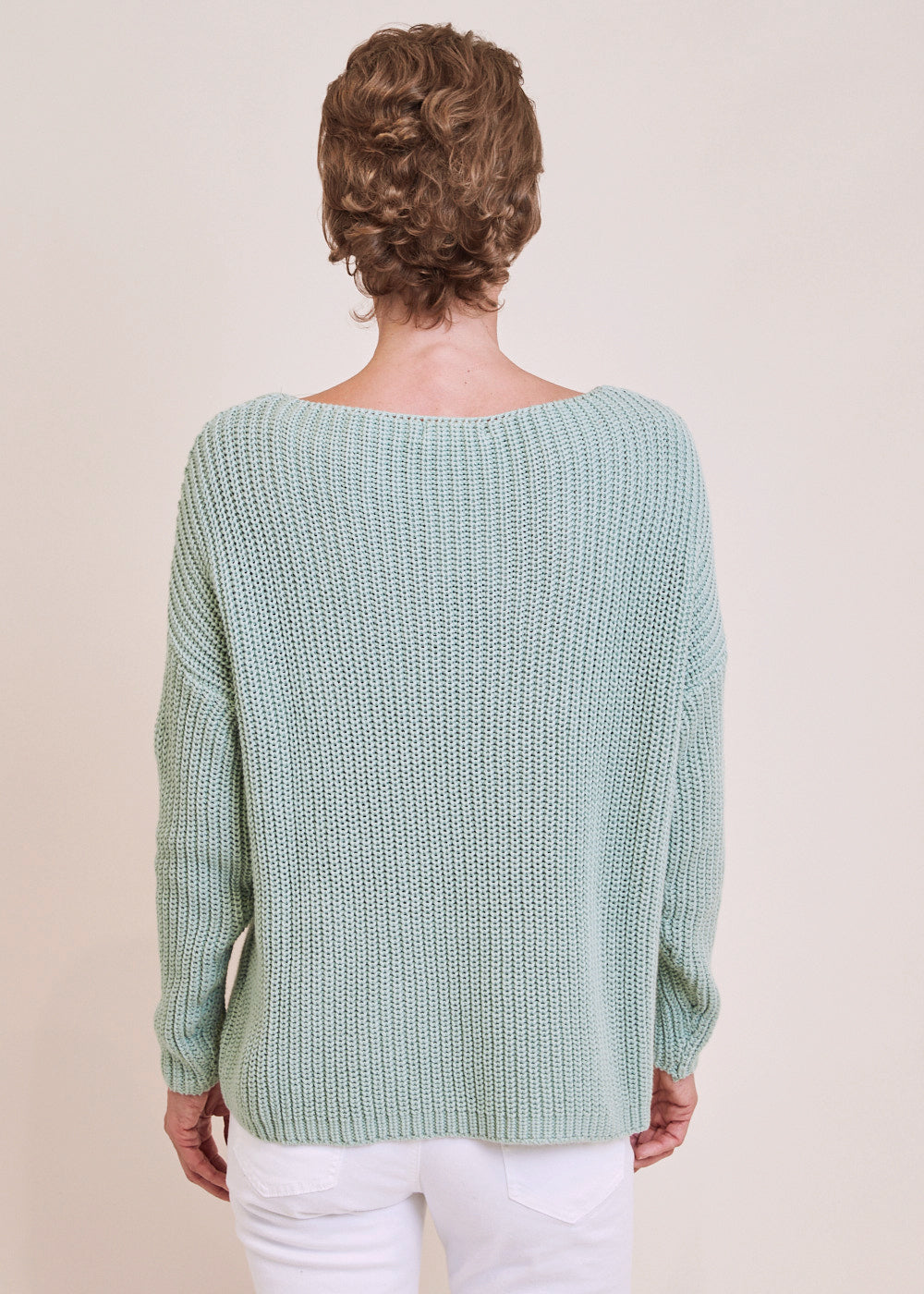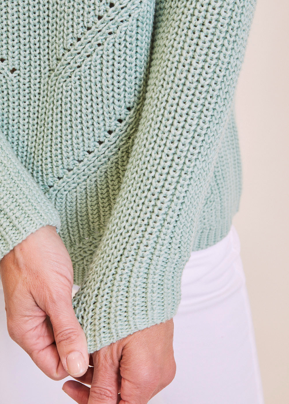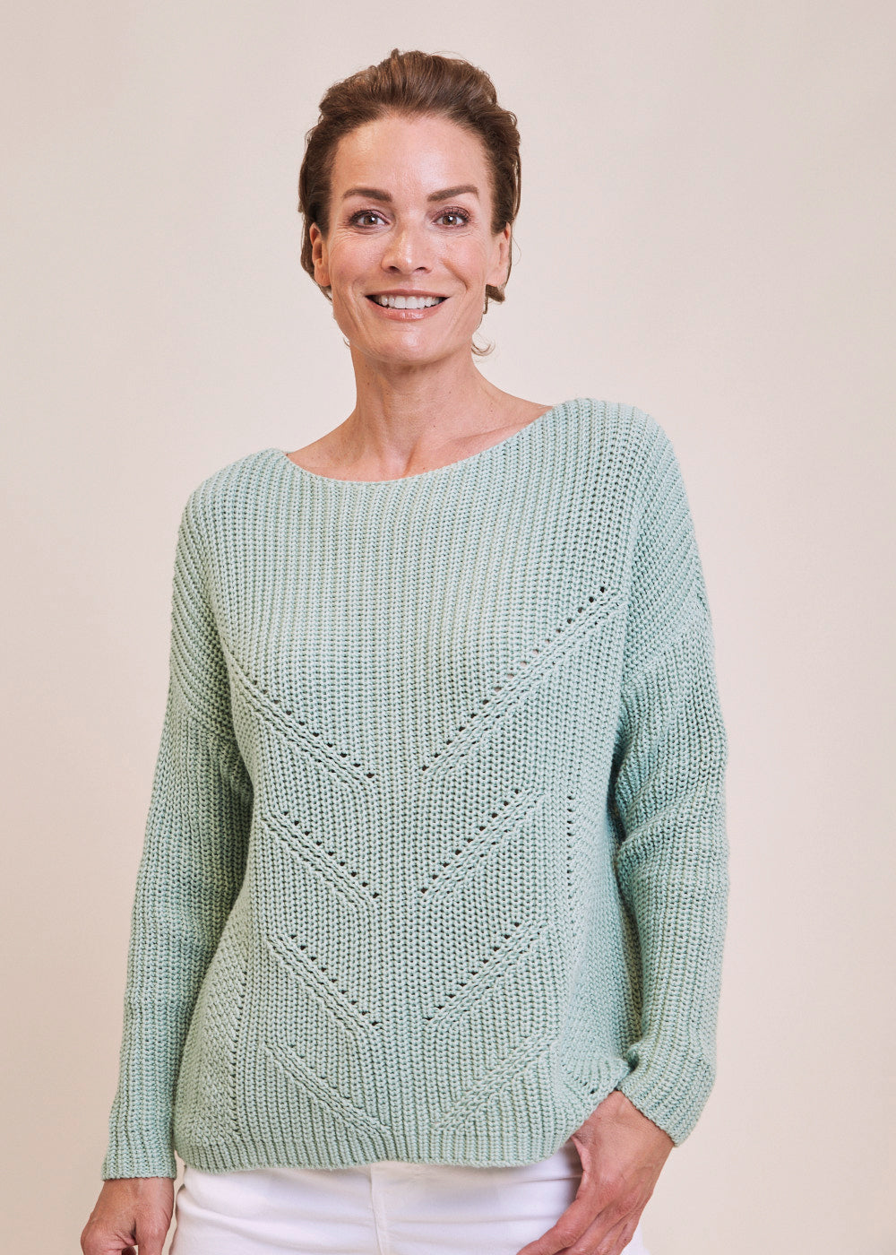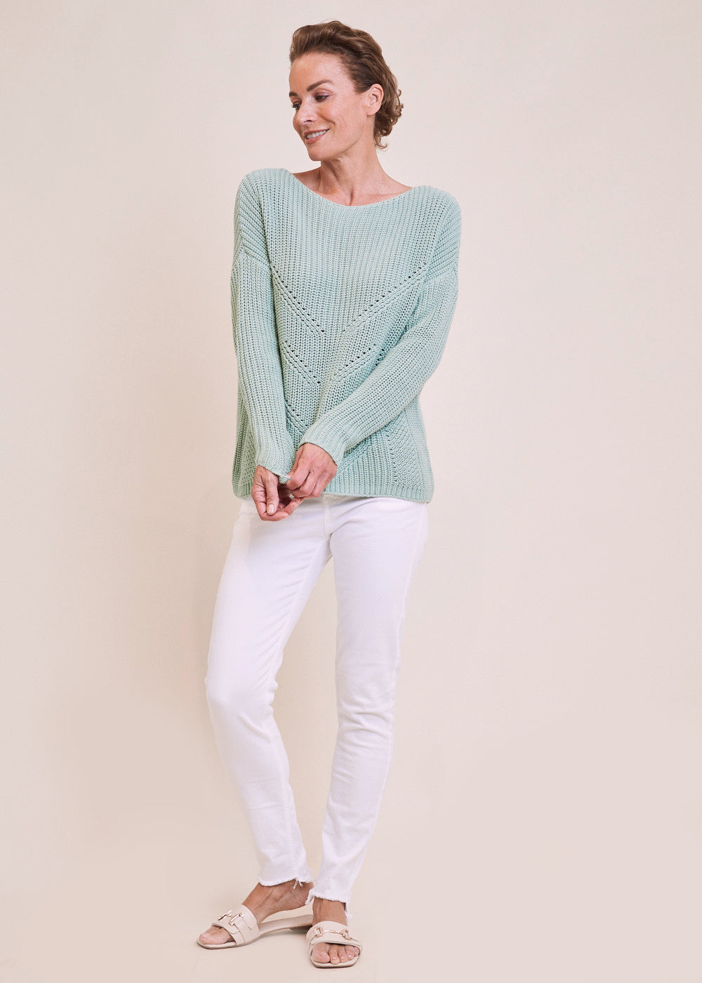 Dieser traumhafte Pullover aus Rippenstrick besticht durch seine extra softe Qualität aus 100% Baumwolle. Das eingestrickte Muster ist in der Mitte zulaufend und fördert eine schlanke Silhouette. Der Pullover besitzt einen Rundhals und kann so auch wunderbar in Kombination mit einer weißen Bluse getragen werden.