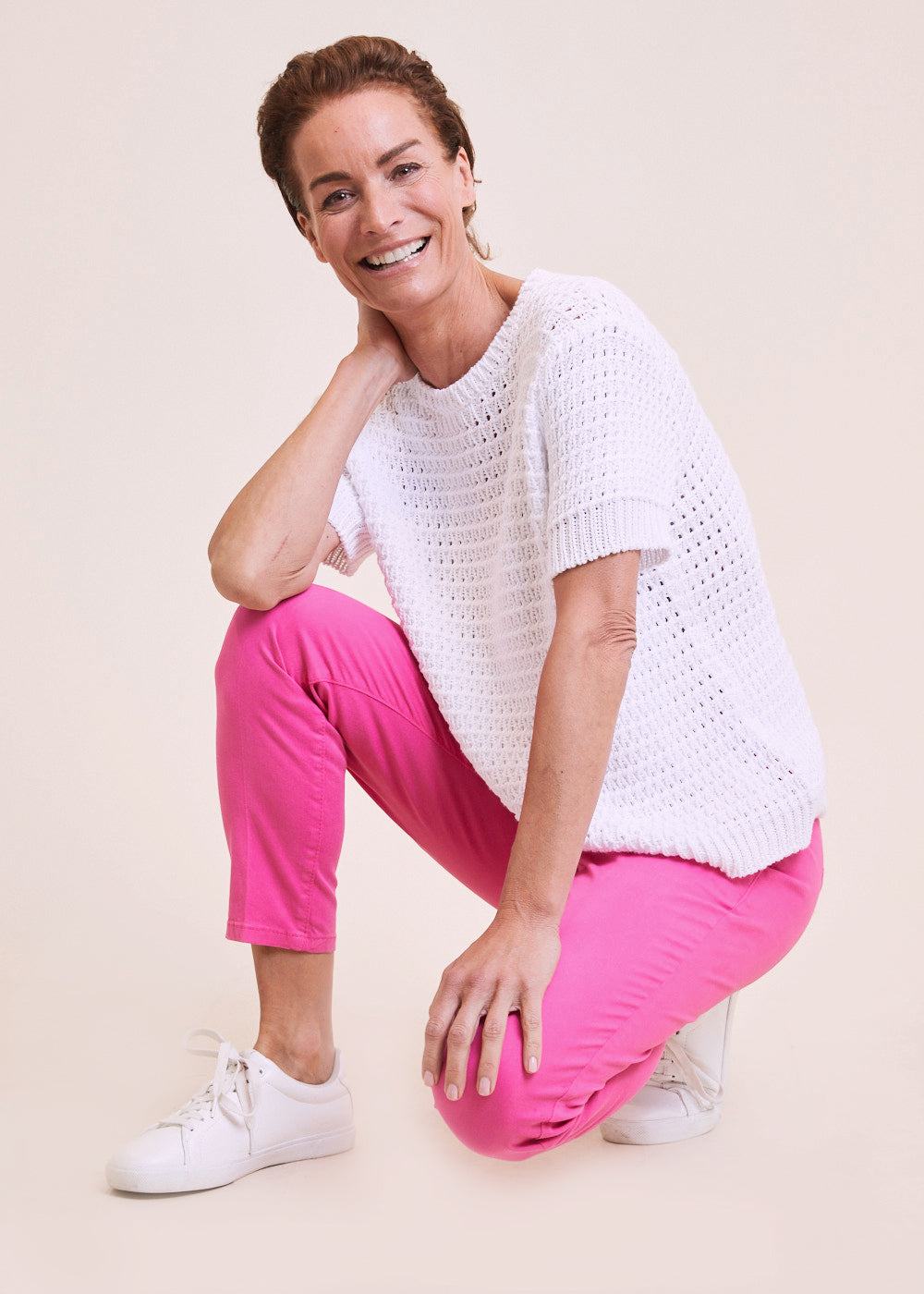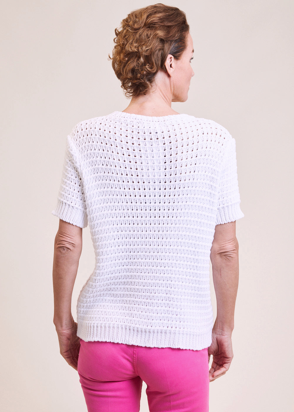 Verspielter Pullover in Häkeloptik in schönem Bianco-Ottico. Die Ärmellänge reicht bis zu den Ellbogen. Der perfekte Kombinationsartikel für die sommerliche Saison. Leicht durchblickend.