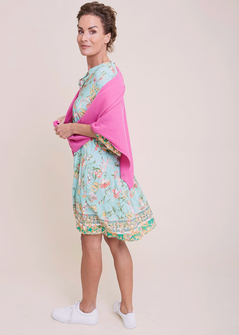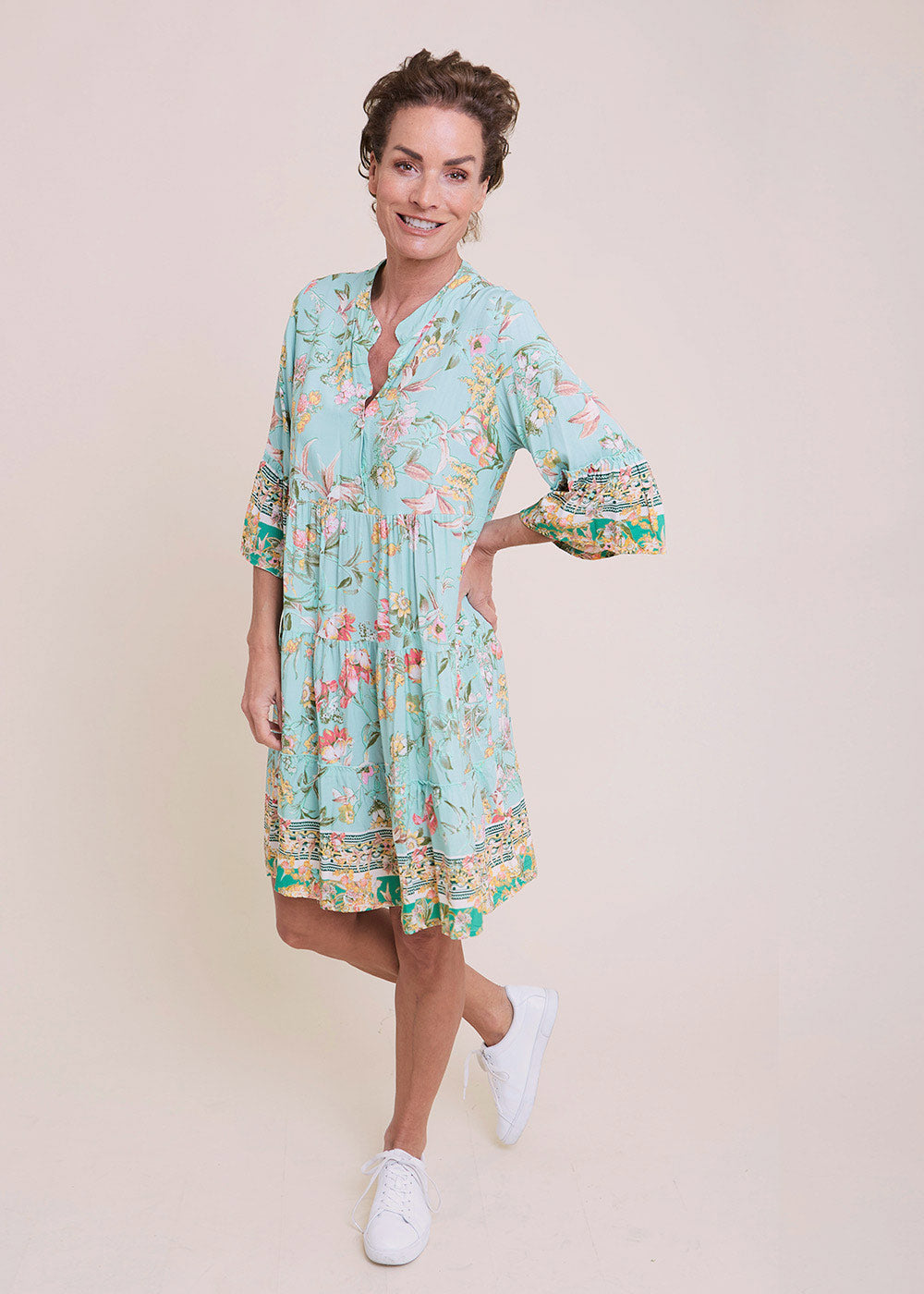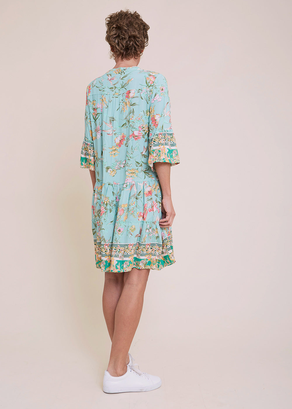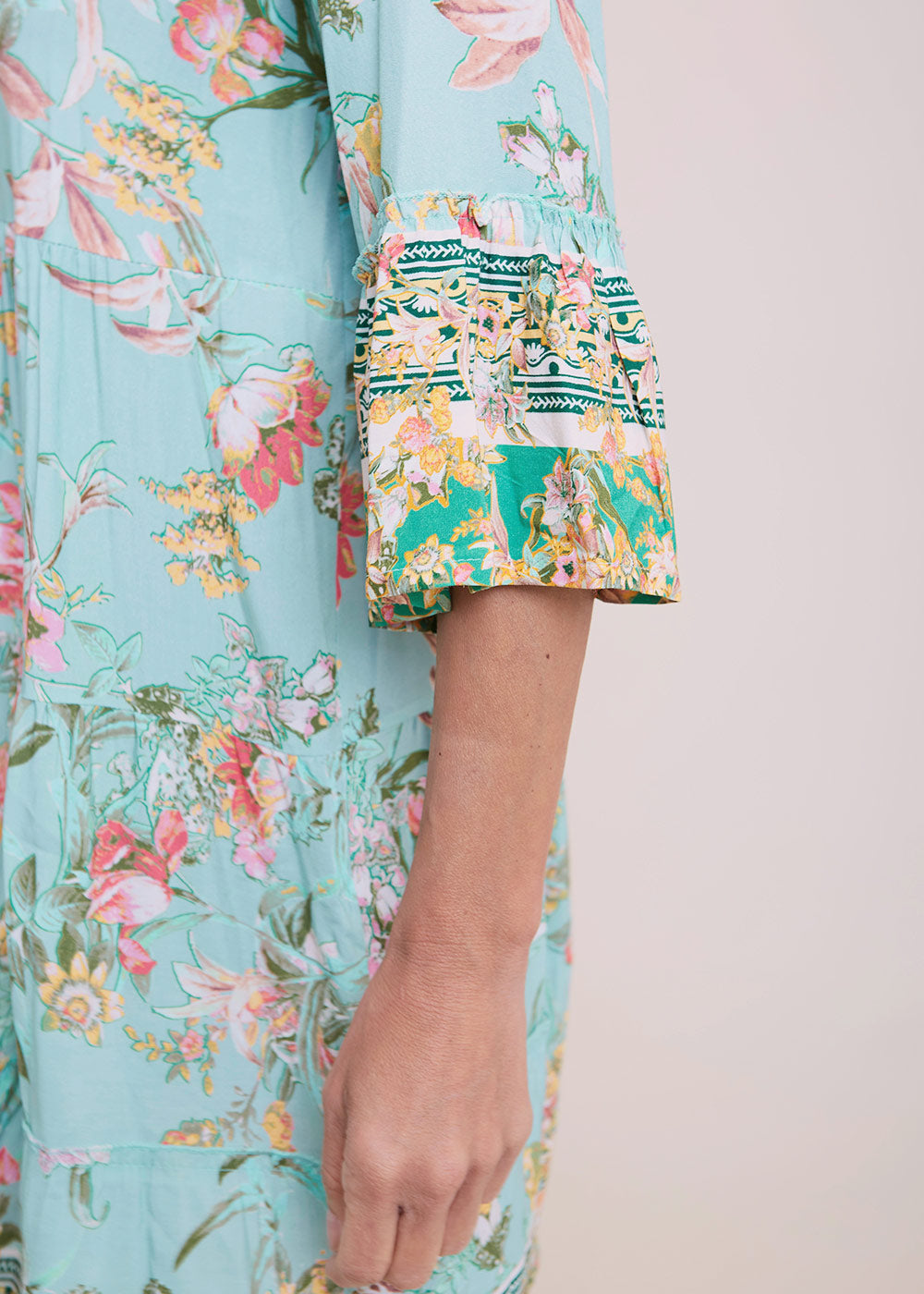 Mit diesem Kleid kann der Sommer kommen! Die gestuften Volants am Rockteil umspielen luftig die Oberschenkel und formen eine schmeichelnde Silhouette. Der V-Ausschnitt des Kleides mündet in einer Knopfleiste. Die 3/4-Ärmel sind leicht ausgestellt. Das Kleid ist mit einem floralen All-Over-Print versehen. Besonders schön, lässt sich das Kleid mit weißen Sneakern kombinieren, um einen lässigen Look zu kreieren.
