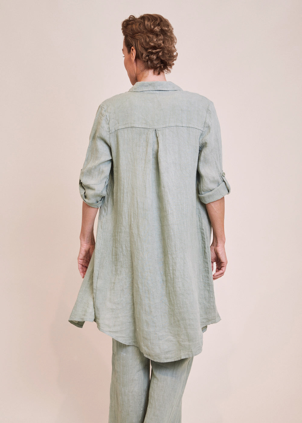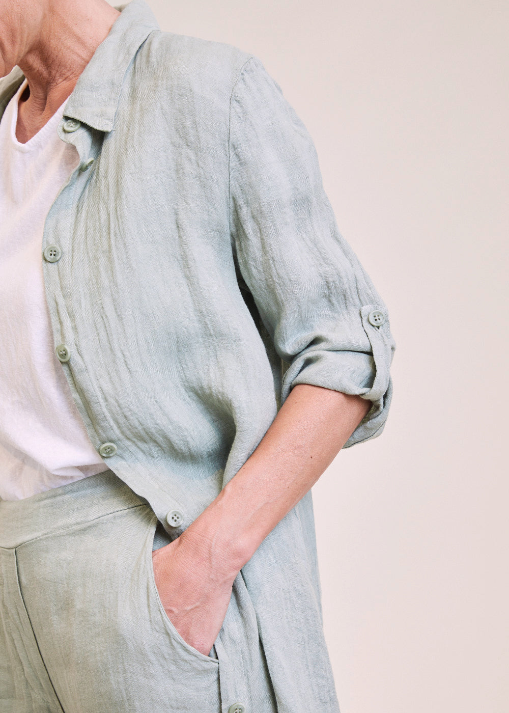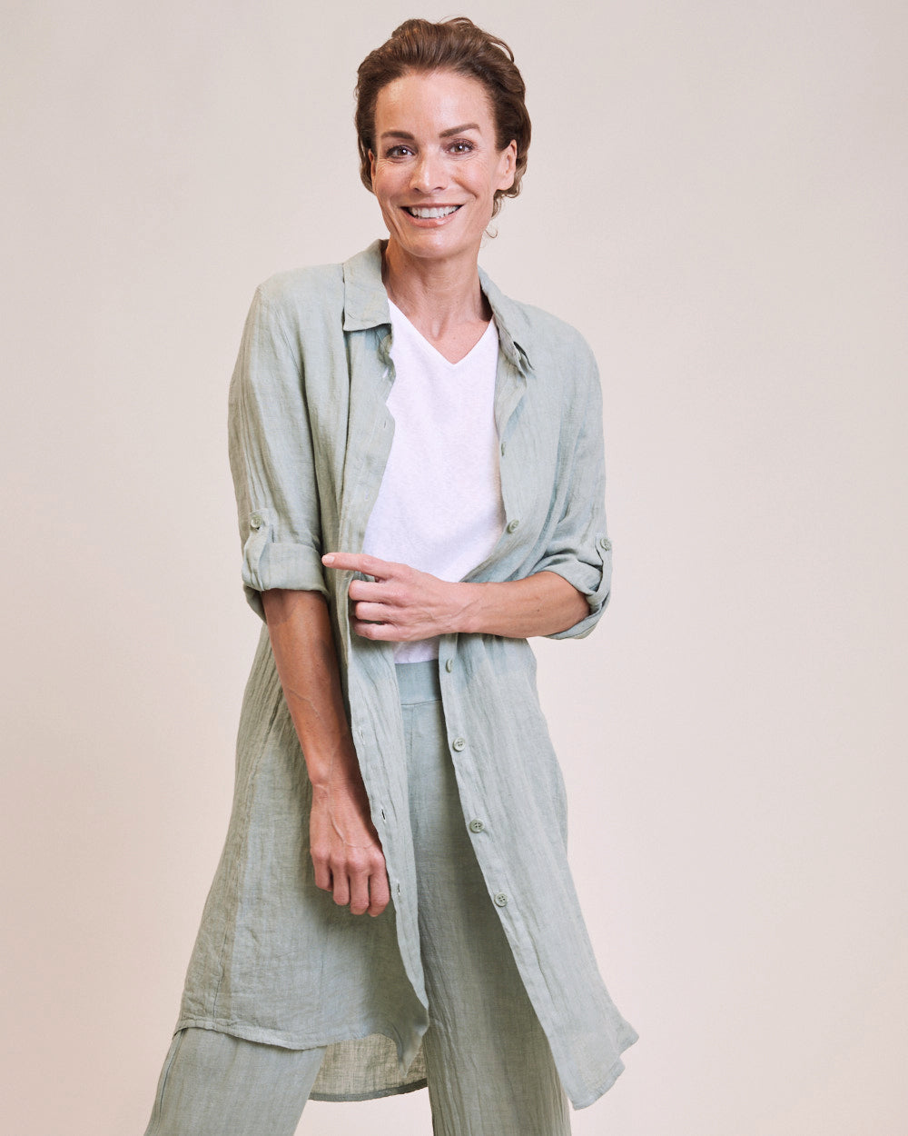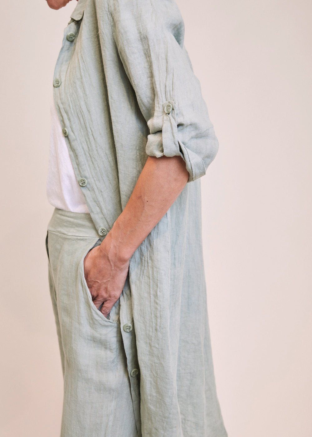 Gerade geschnittener Mantel aus einem reinen Leinenmaterial. Dieses Teil kann sowohl offen als auch geschlossen getragen werden. Mit Reverskragen, durchgehender Knopfleiste und kürzer geschnittenen Armen.