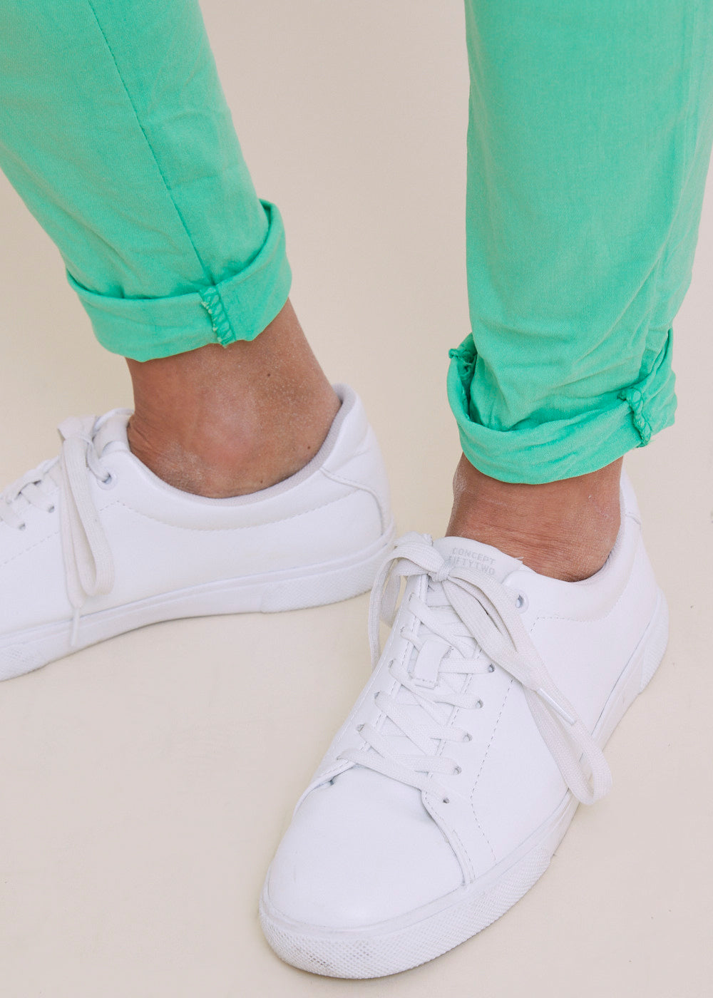 Unser Bestseller! Hose aus Viskose und Elasthan-Anteil. Dadurch sitzt sie super bequem und lässt sich prima zu Allem kombinieren. Gummizug im Bund, Tunnelzug mit Band und seitliche Eingriffstaschen. Länge:98 cm.