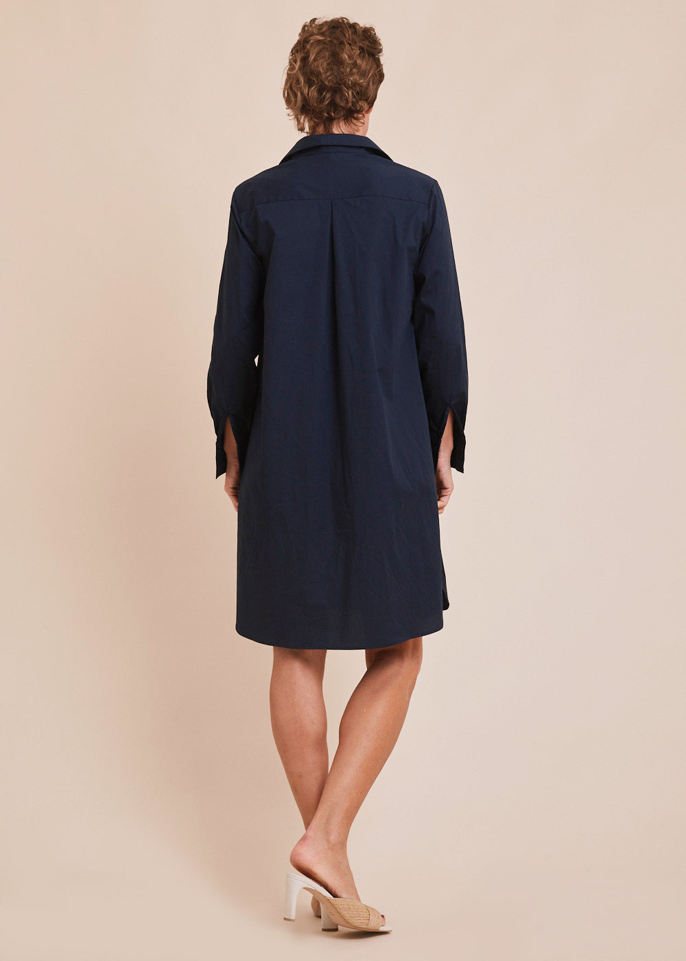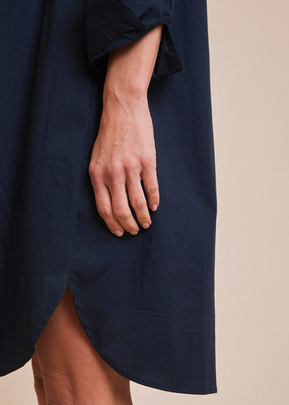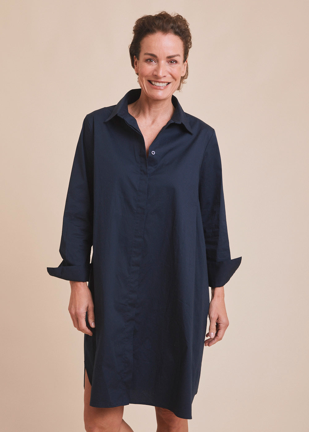 Oversized geschnittenes Hemdblusenkleid mit langen Armen. Dieses Blusenkleid aus Baumwolle mit Stretch Anteil hat eine offene Knopfleiste vorne und zusätzliches Volumen durch seine Rückenfalte. Der lässig fallende Schnitt eignet sich perfekt für legere Alltags-Looks. Egal ob mit Sneakern oder Sandalen, das Kleid ist ein absoluter Hingucker.