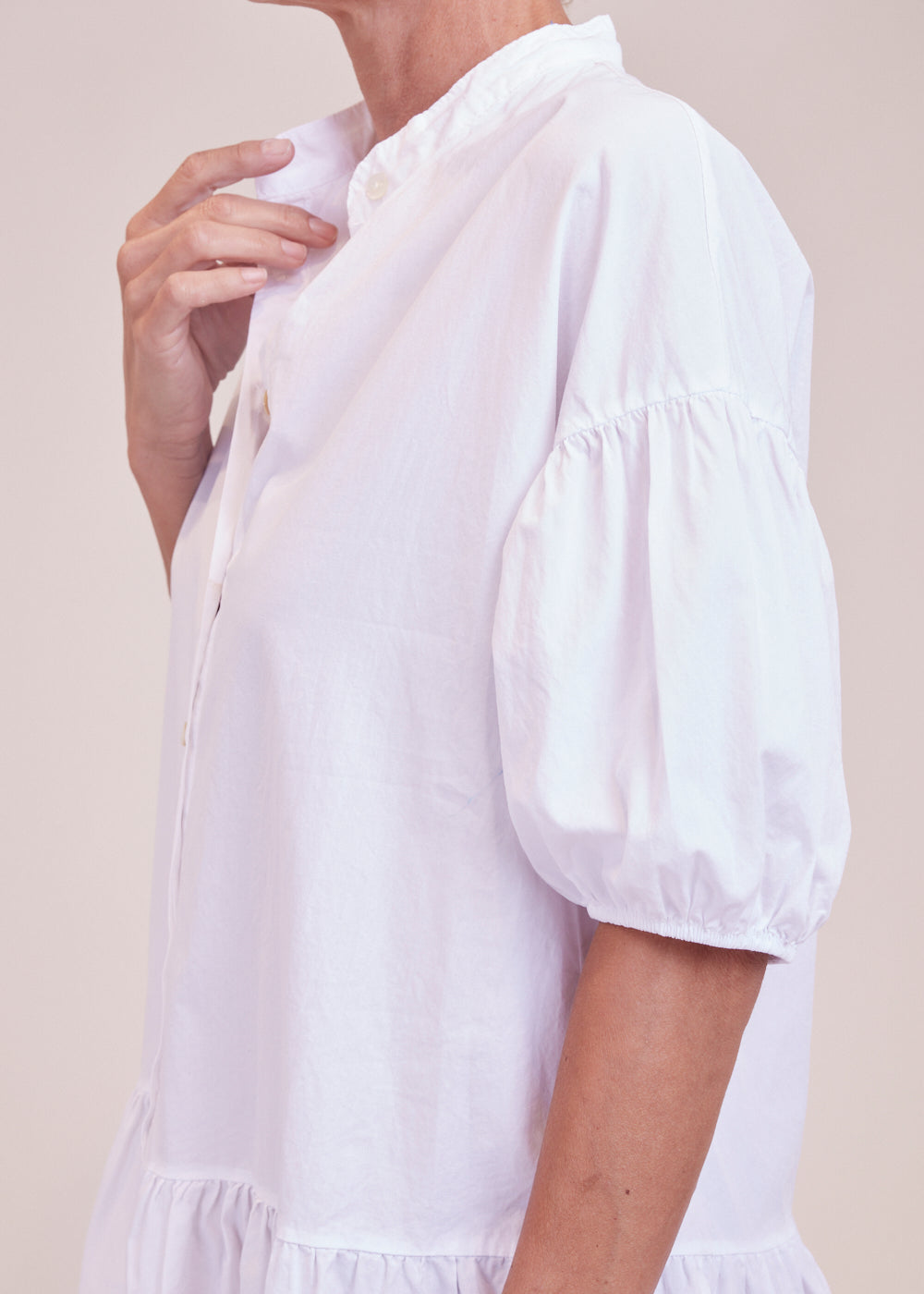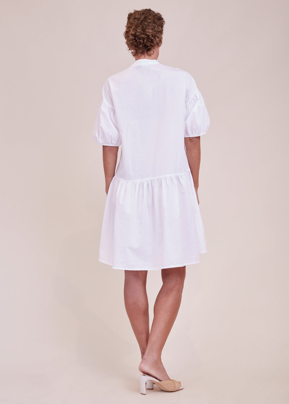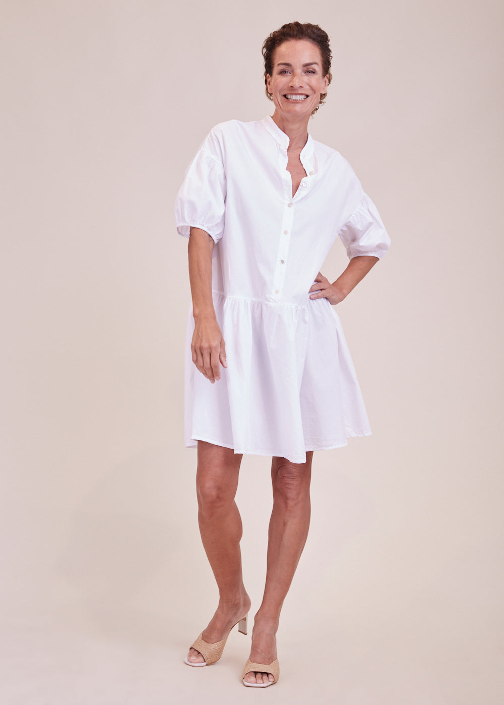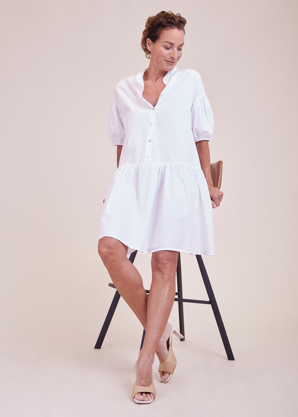 Verspieltes Sommerkleid im Popeline-Style. Das Kleid endet kurz über dem Knie. Die Schultern sind leicht überschnitten und münden in einem Puffärmel. Der Rockteil ist ausgestellt und durch eine Naht auf Hüfthöhe versehen. Der V-Ausschnitt besitzt eine kleine Knopfleiste und einen angedeuteten Stehkragen.