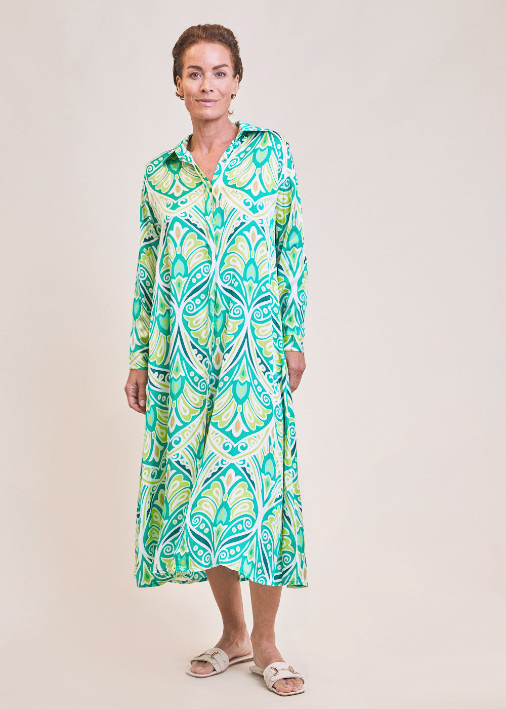 Wundervolles Midikleid mit durchgezogener Knopfleiste und Hemdkragen. Das Kleid hat lange Ärmel, die mit einem Knopf verschließbar sind. Der All-Over Paisleyprint erstrahlt in frischen Frühlingsfarben und überzeugt durch seine Leuchtkraft. Die Schultern sind leicht überschnitten.