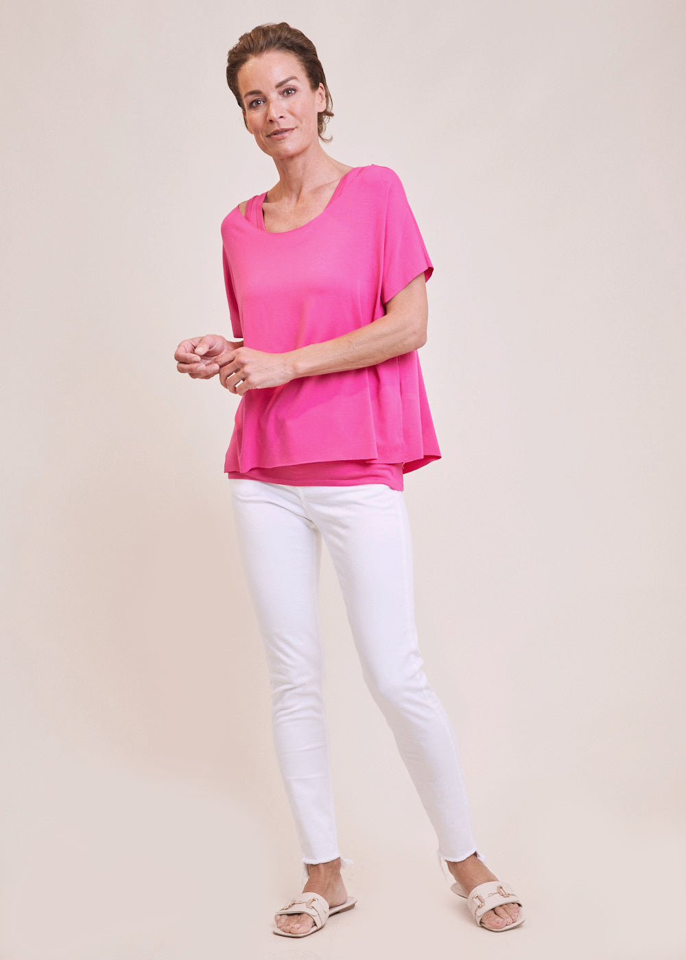 Unser Shirt-Set in strahlendem Fuchsia ist nicht nur ein toller Kombinationsartikel, sondern verleiht deinem auch Outfit auch einen sportiven, modernen Touch. Das Set, bestehend aus einem Top und einem Obershirt, schmiegt sich fließend um deinen Oberkörper und sorgt für ein angenehmes Tragegefühl auf der Haut.