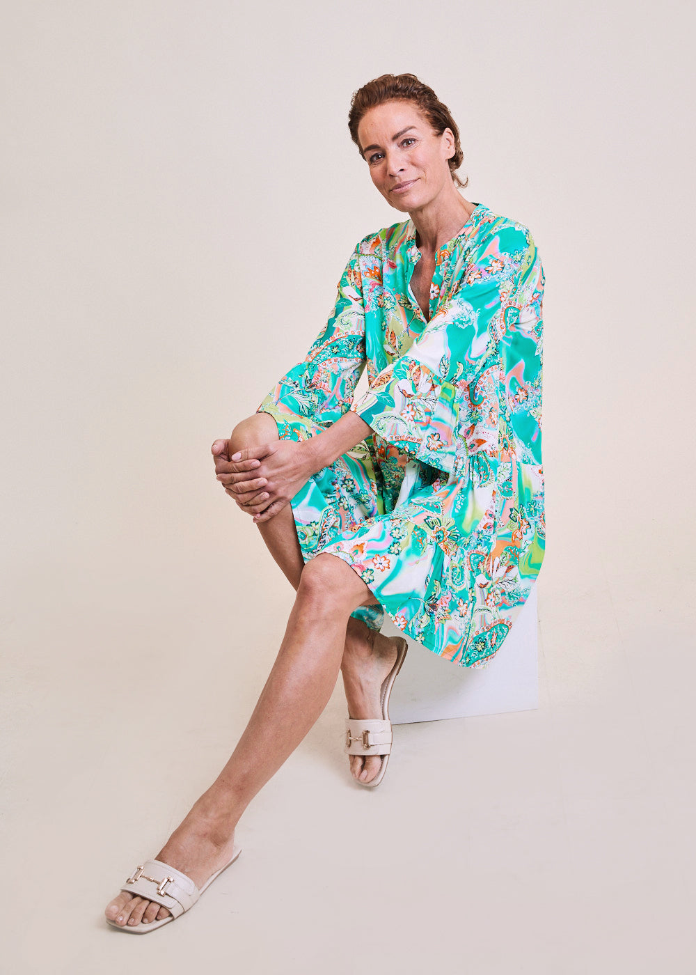 Sommerliches Kleid mit All-Over-Print. Das Kleid endet über dem Knie und läuft A-Linien-förmig aus. Rockteil und Ärmel bestehen aus Volants. Das Kleid hat eine durchgezogene Knopfleiste, die nach Belieben gestylt werden kann.