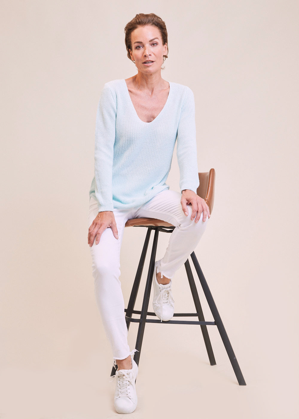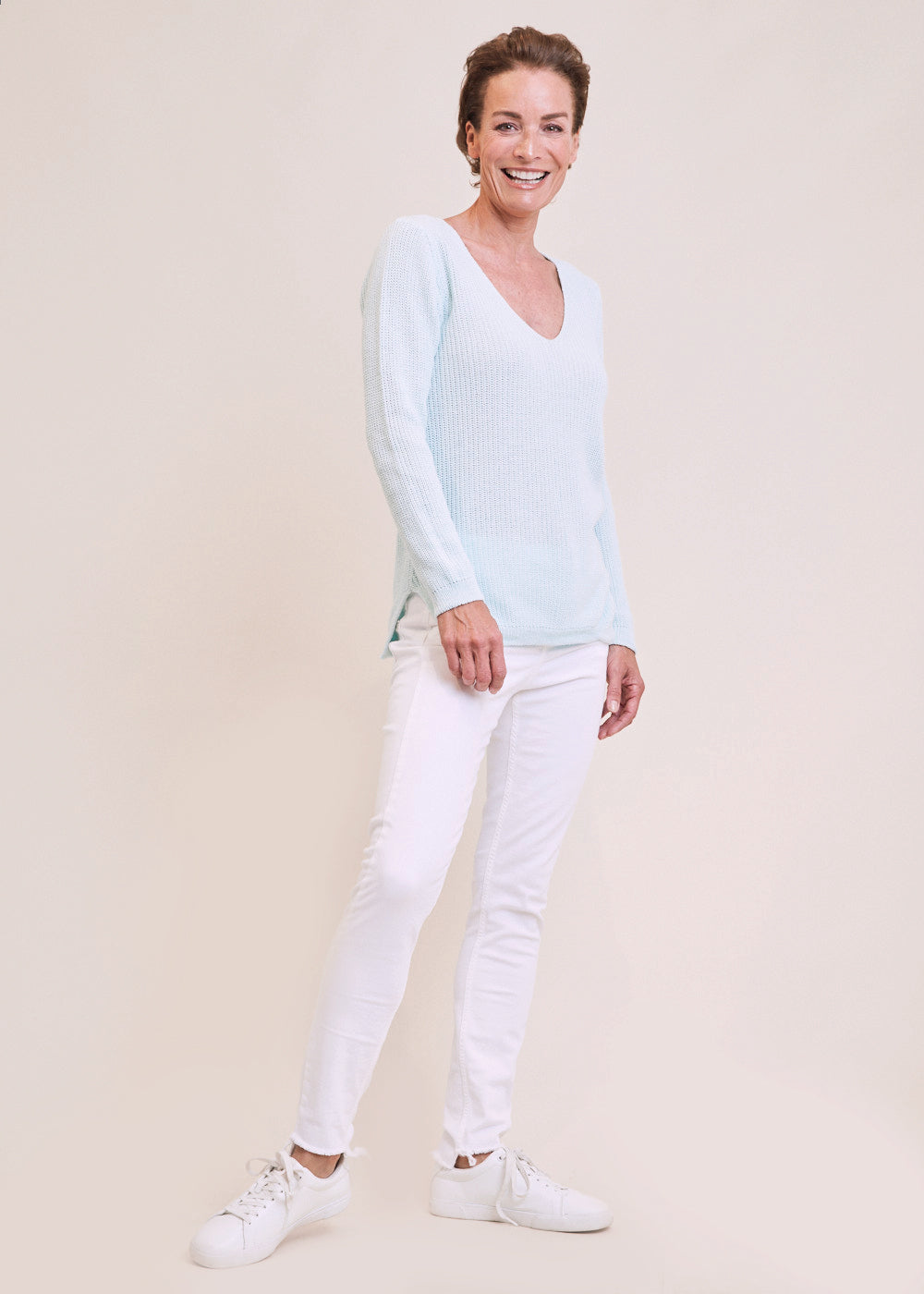 V-Neck Pullover aus einem Baumwollmix. Ein luftig leichter Pullover mit langen Armen und seitlichen Schlitzen. Perfekt für die kühleren Sommertage. Er hat ein Rippenbündchen an den Armen und am Saum.