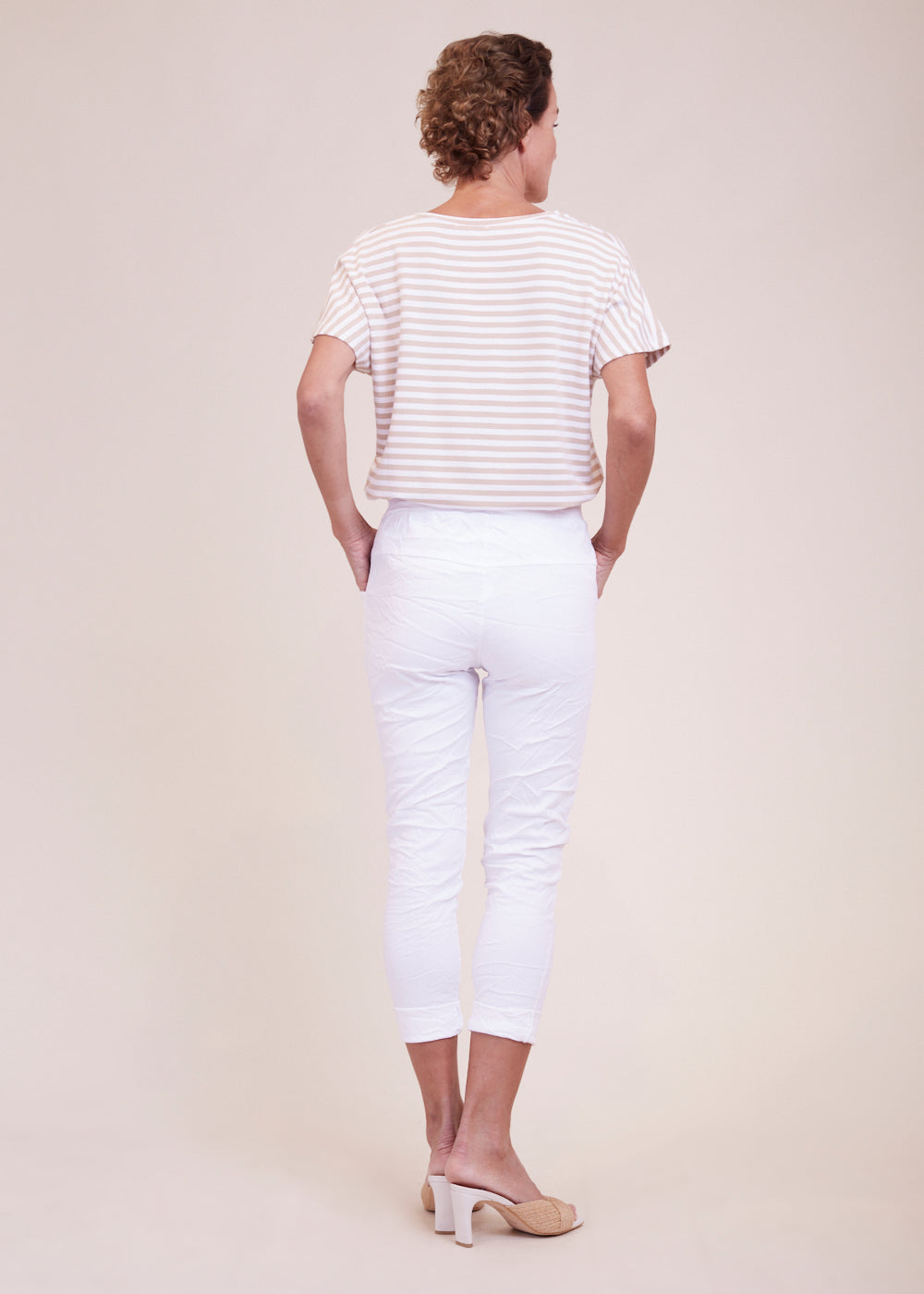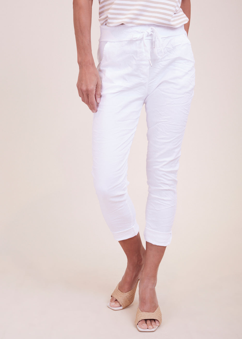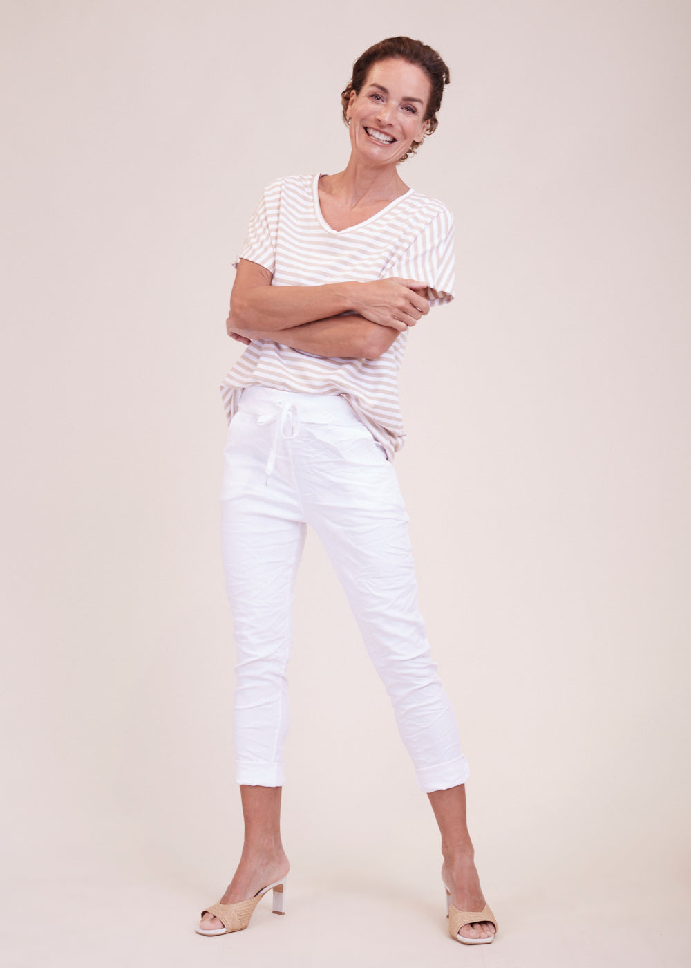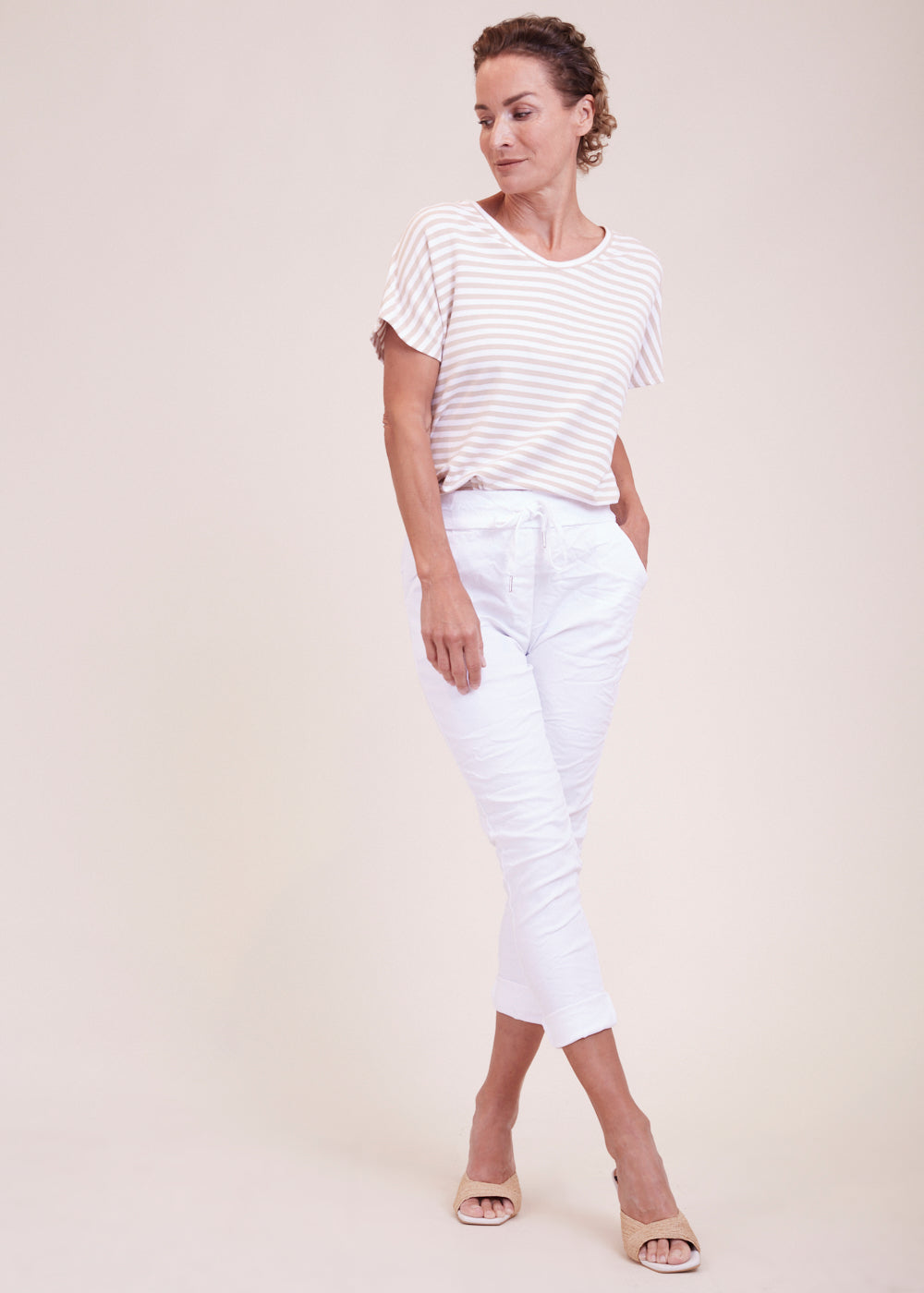 Unser Bestseller! Hose aus Viskose und Elasthan-Anteil. Dadurch sitzt sie super bequem und lässt sich prima zu Allem kombinieren. Gummizug im Bund, Tunnelzug mit Band und seitliche Eingriffstaschen. Die Hose fällt etwas größer aus.