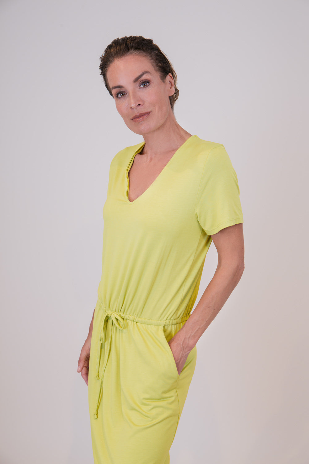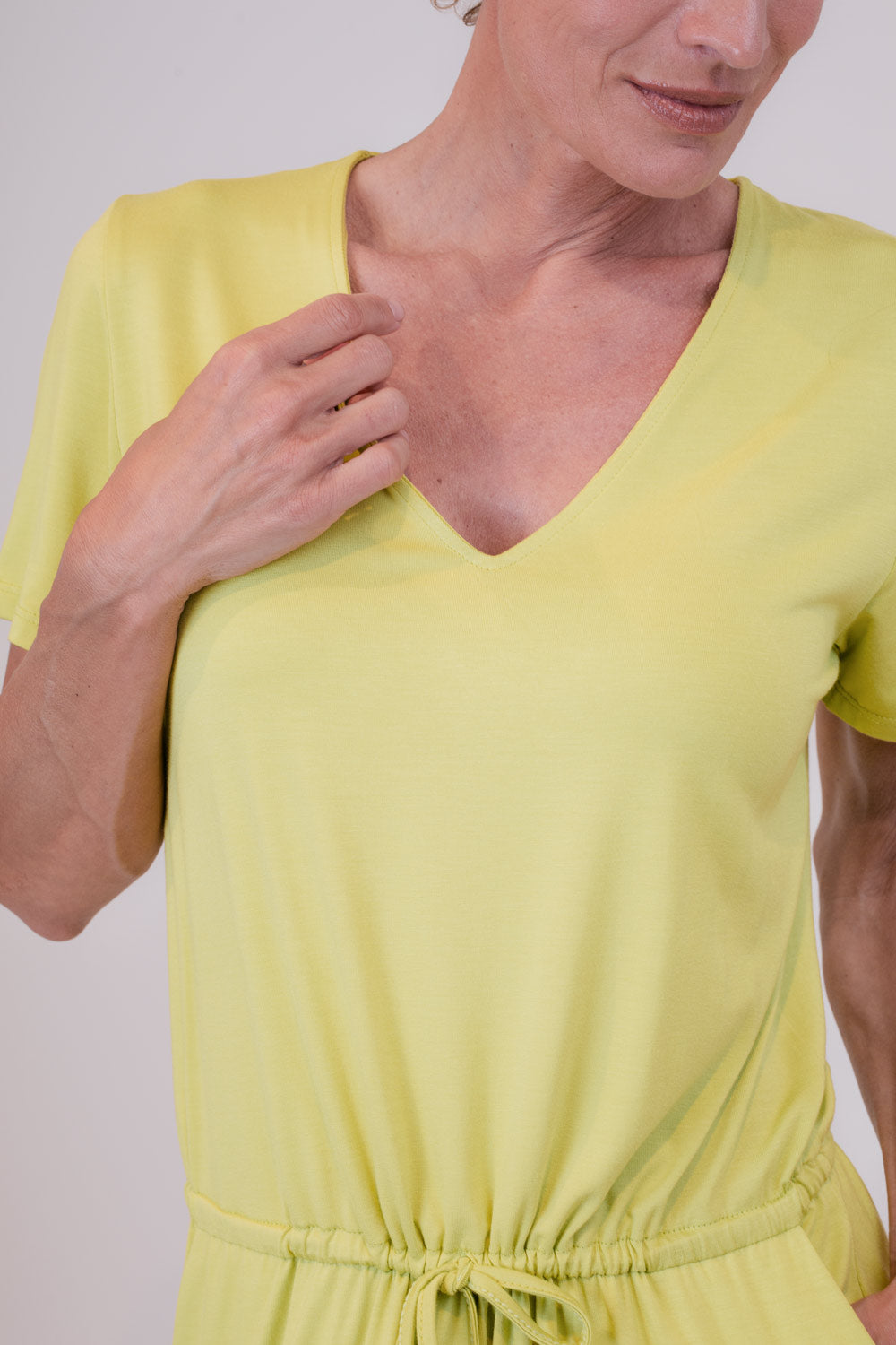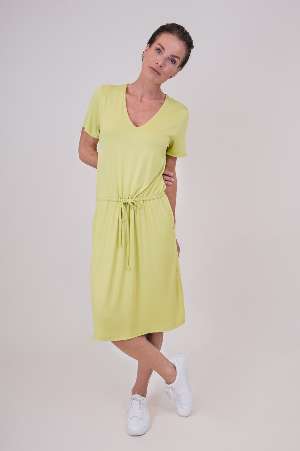 Luftiges Jerseykleid mit kurzen Ärmeln und Rundhalsausschnitt in der Trendfarbe Lime. Das Kleid hat einen geraden Schnitt und einen Tunnelzug auf Höhe der Hüfte. Der perfekte Sommerartikel für einen entspannten Alltag.
