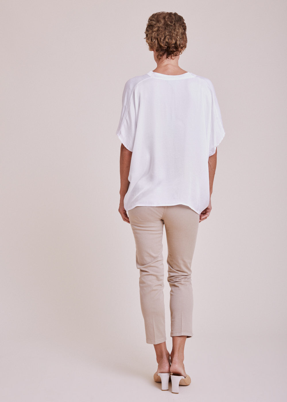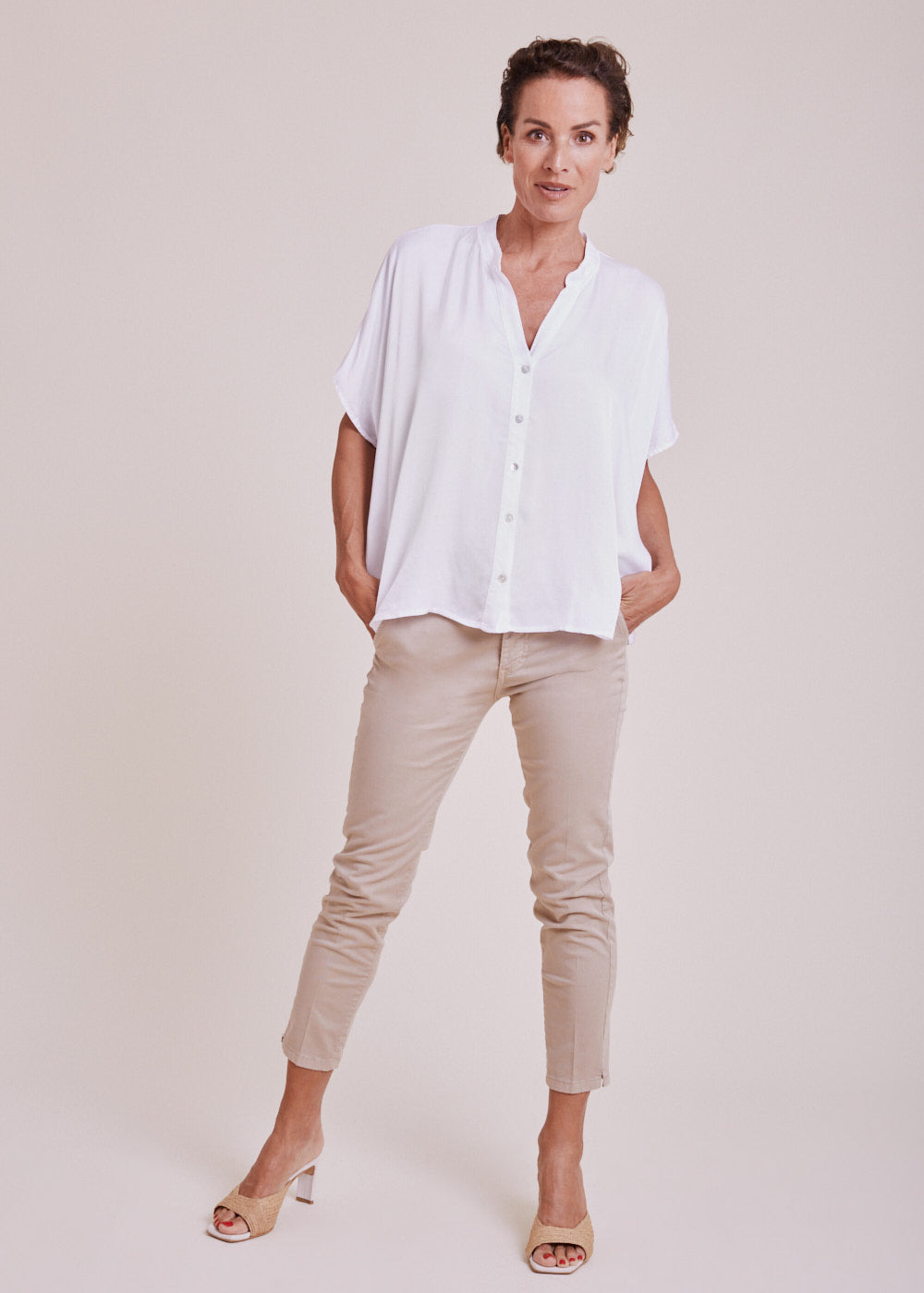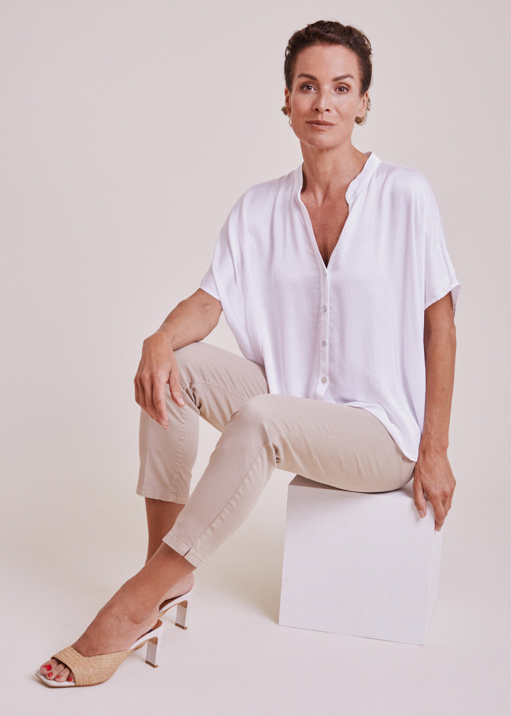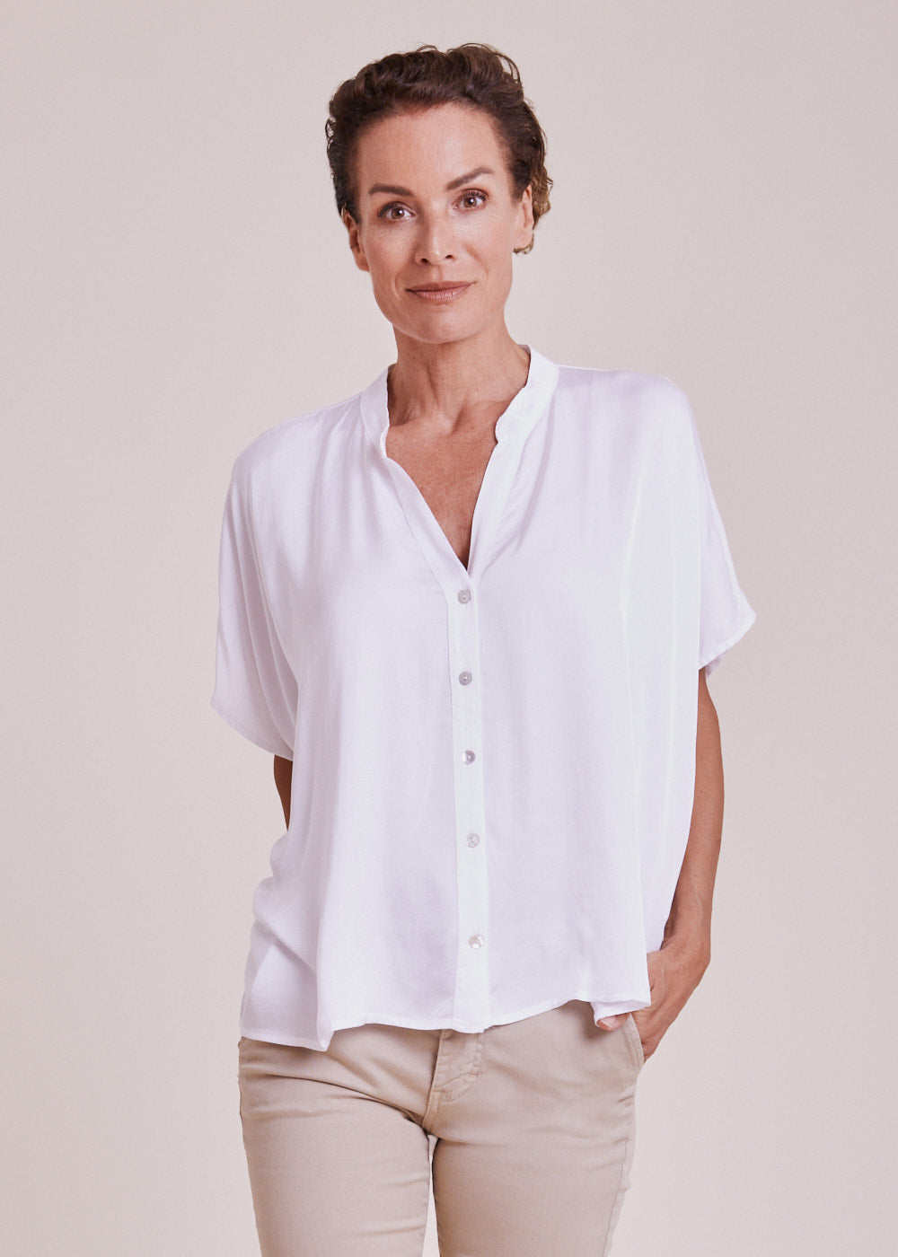 Ein hervorragender Kombinationsartikel für den Sommer: Leichte Tunika im schönen Bianco-Ottico mit überschnittenen Schultern und durchgezogener Knopfleiste. Das Material hat einen natürlichen Glanz, der die Hochwertigkeit der Tunika zusätzlich aufwertet.