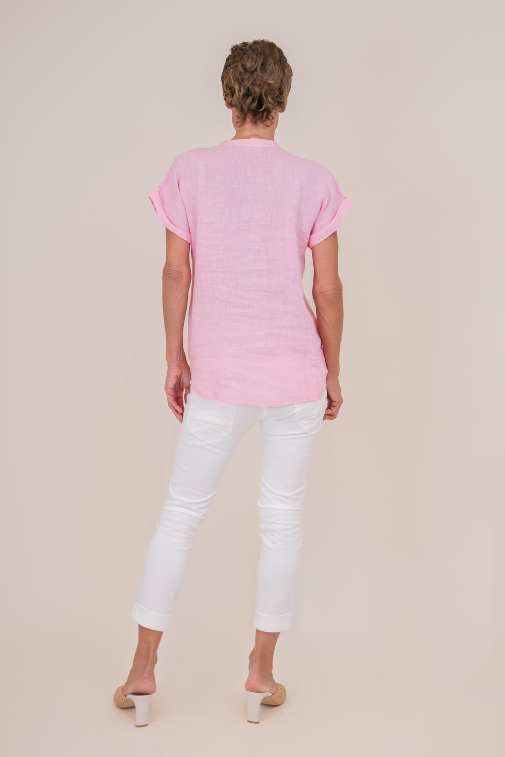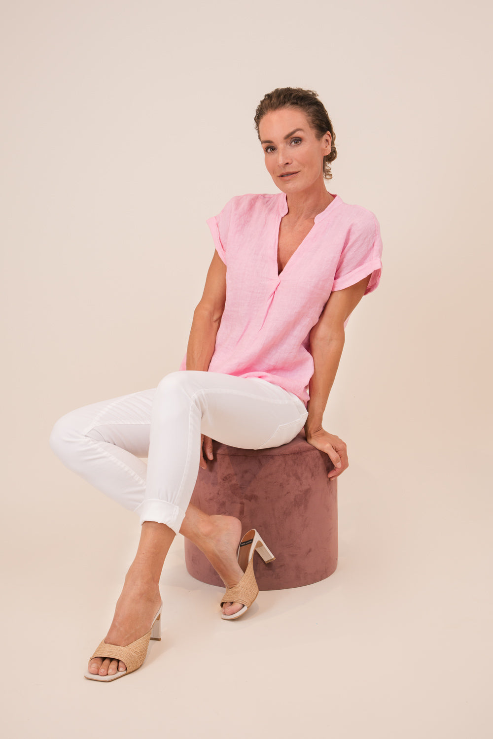 Tolle Sommerbluse aus 100% Leinen. Die Bluse hat kurze Ärmel, die am Bund einmal umgeschlagen sind und einen V-Ausschnitt, der in einer Schmuckfalte endet. Der angedeutete Stehkragen und die gerade Passform sorgen für einen entspannten und modernen Look.