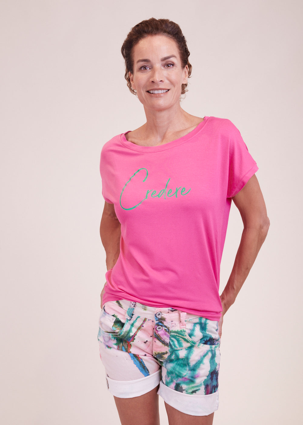 Bequemes T-Shirt mit Rundhalsausschnitt in knalligem Pink für den Sommer. Das Shirt hat einen grünen Print auf Brusthöhe. Der Stoff des Shirts ist fließend und schmiegt sich an den Oberkörper an.