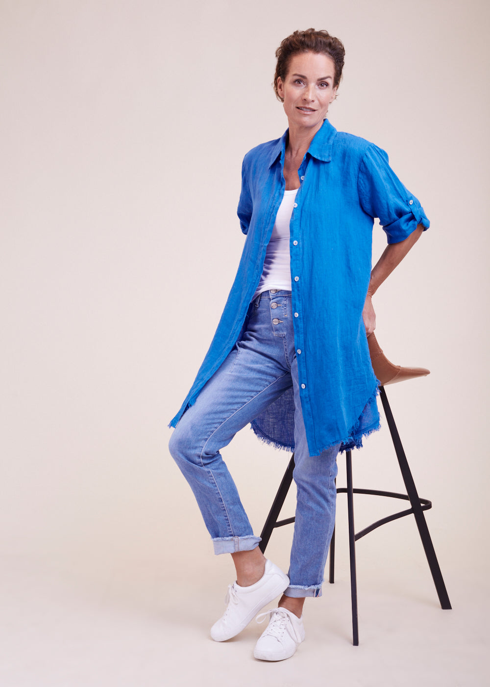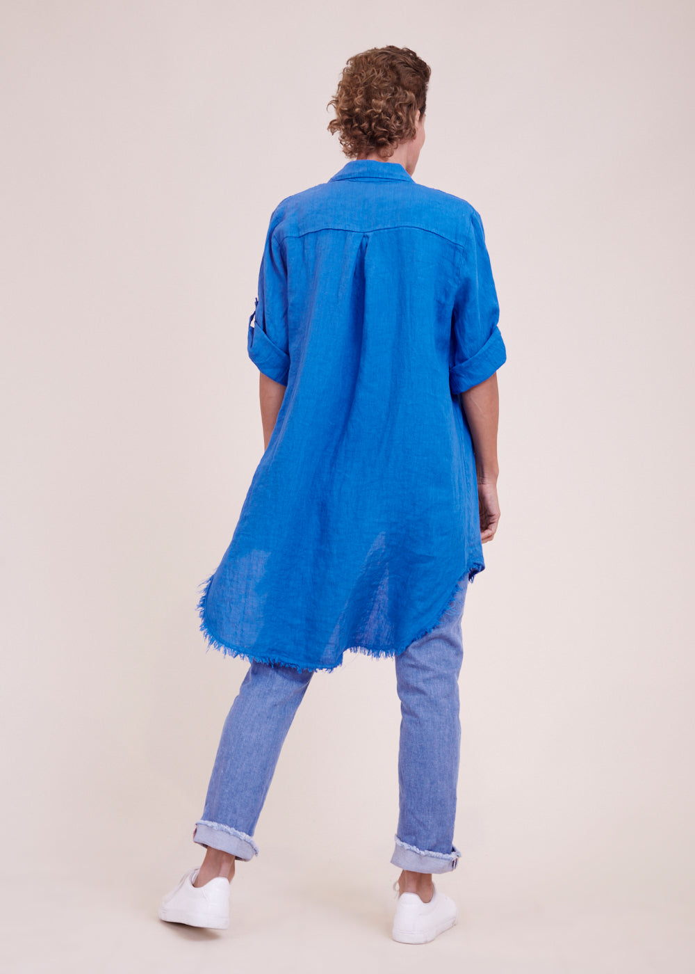 Legeres Over-Size Hemd aus 100% Leinen. Das Hemd hat eine durchgezogene Knopfleiste und einen Hemdblusenkragen. Aufgesetzte Taschen auf Brusthöhe. Der asymmetrische Schnitt und der offene Saum machen diesen Artikel zu einem echten Trendteil, das zusätzlich durch seine leuchtende Farbkraft besticht.