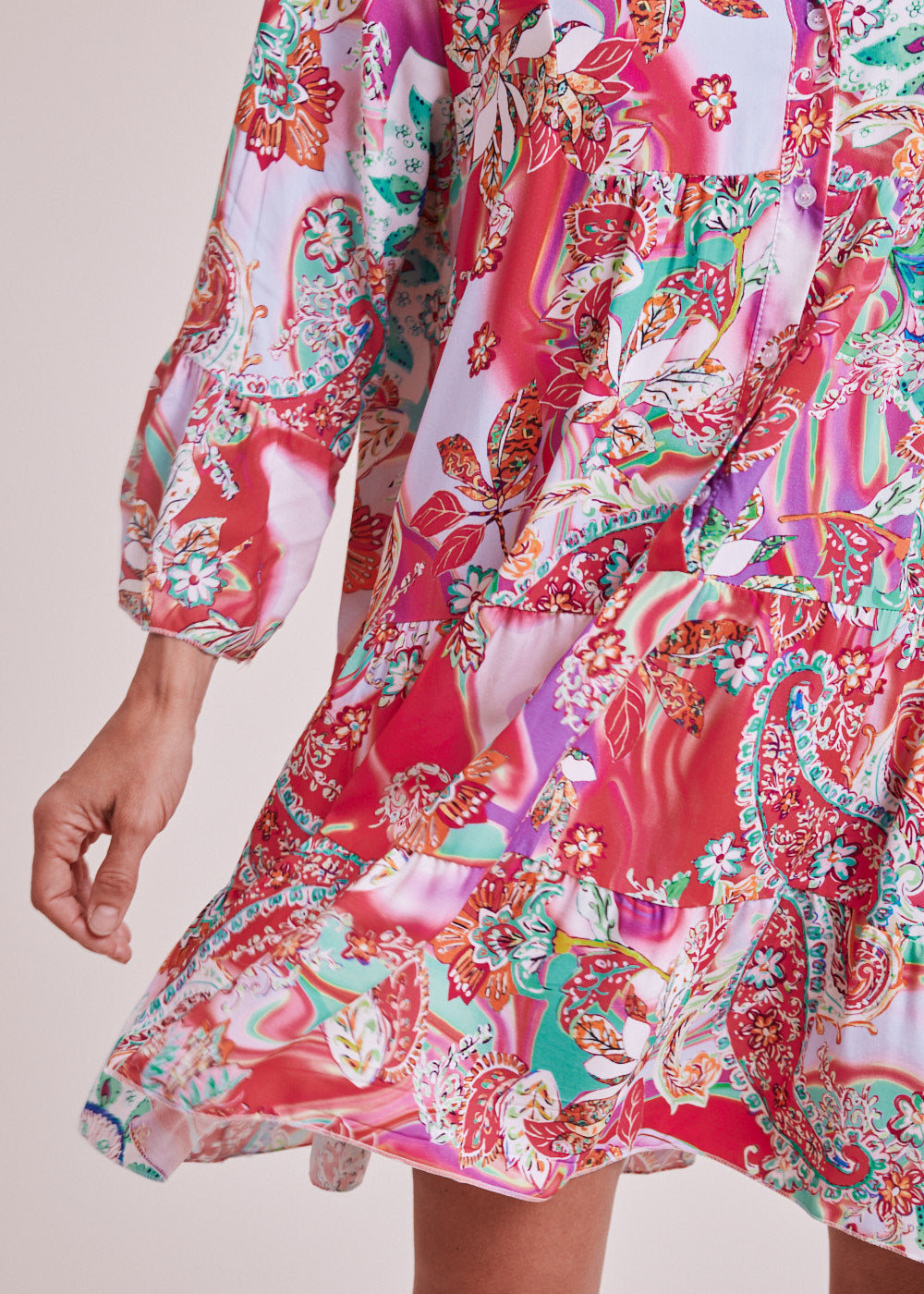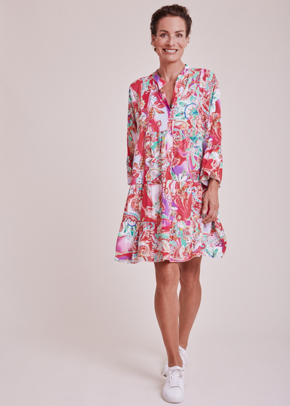 Sommerliches Kleid mit All-Over-Print. Das Kleid endet über dem Knie und läuft A-Linien-förmig aus. Der Rockteil besteht aus Volants. Die 3/4-Ärmel sind ballonförmig. Das Kleid hat eine Knopfleiste, die nach Belieben gestylt werden kann.