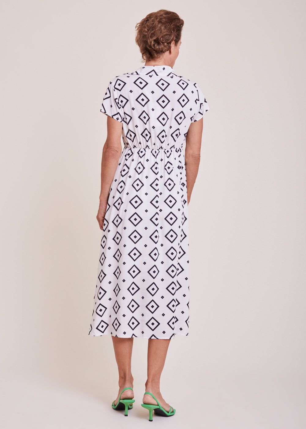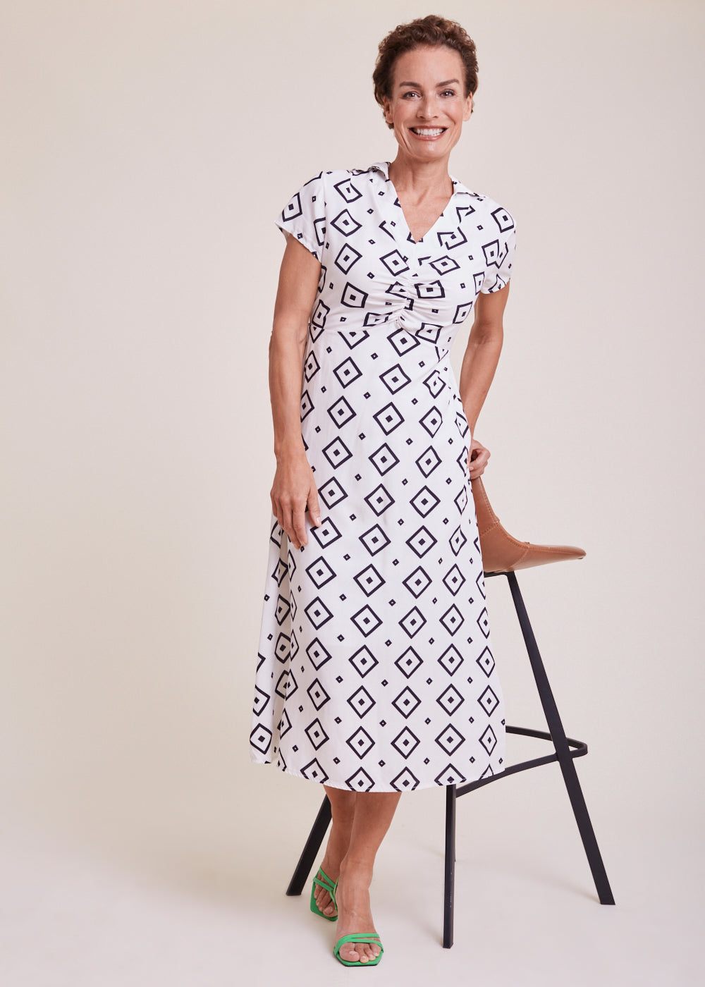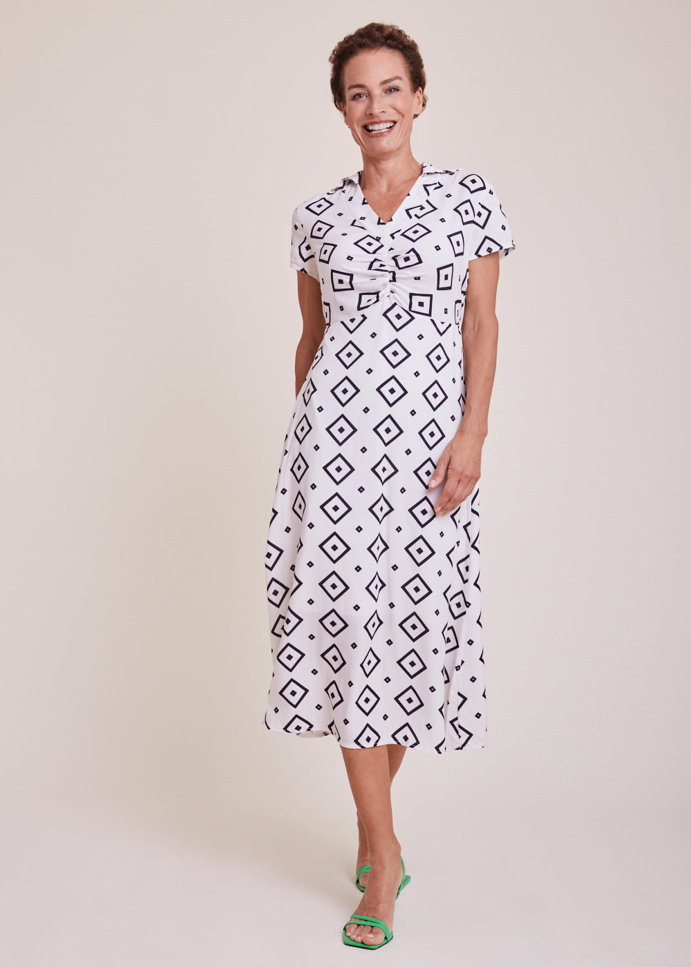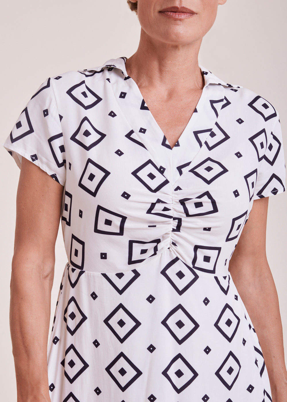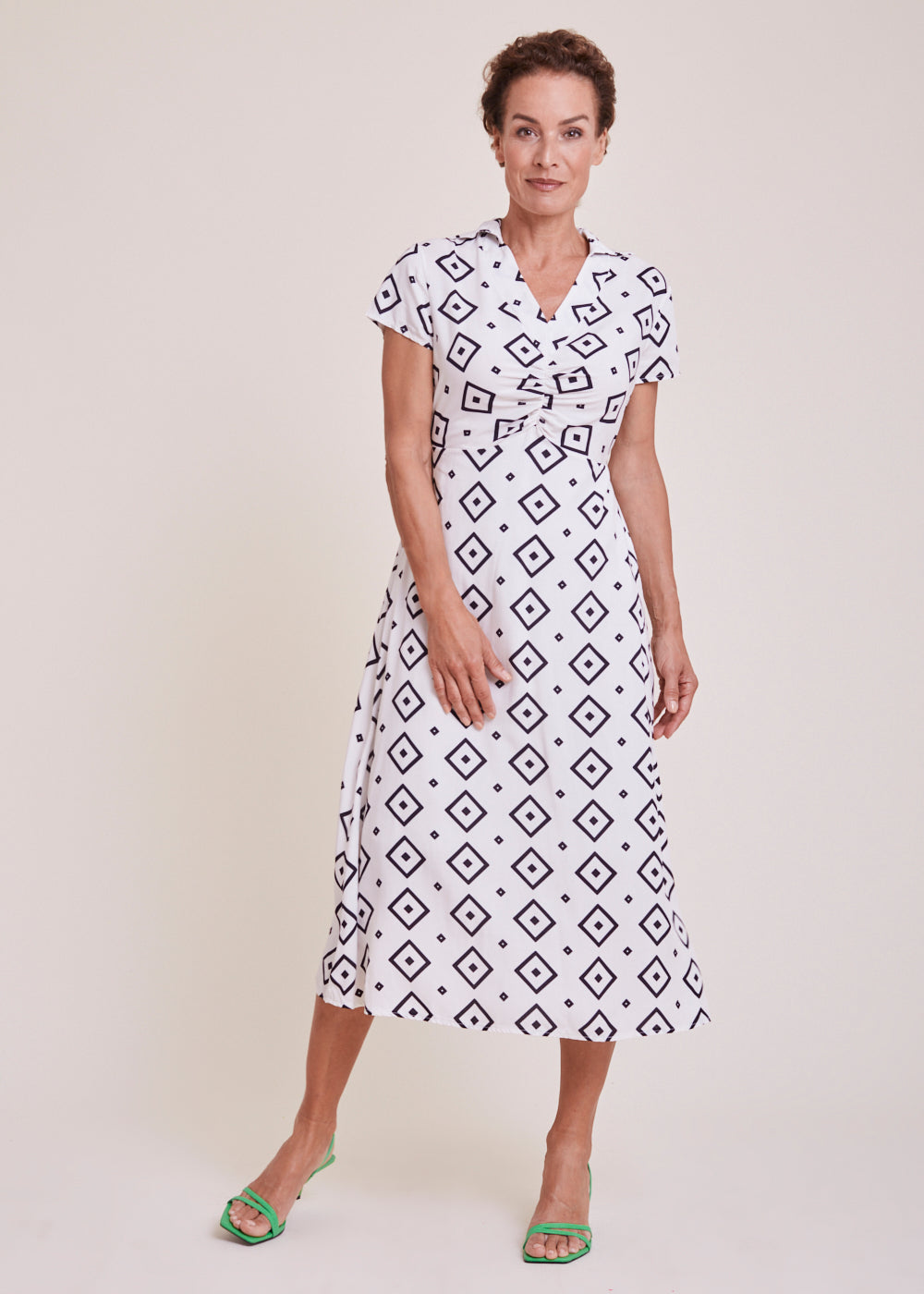 Sommerliches Midi-Kleid in All-Over-Print. Das Kleid hat kurze Ärmel und eine Raffung an der Brust, die für eine feminine Silhouette sorgt. Der Stoff des Kleides fließt A-Linien-förmig herab.