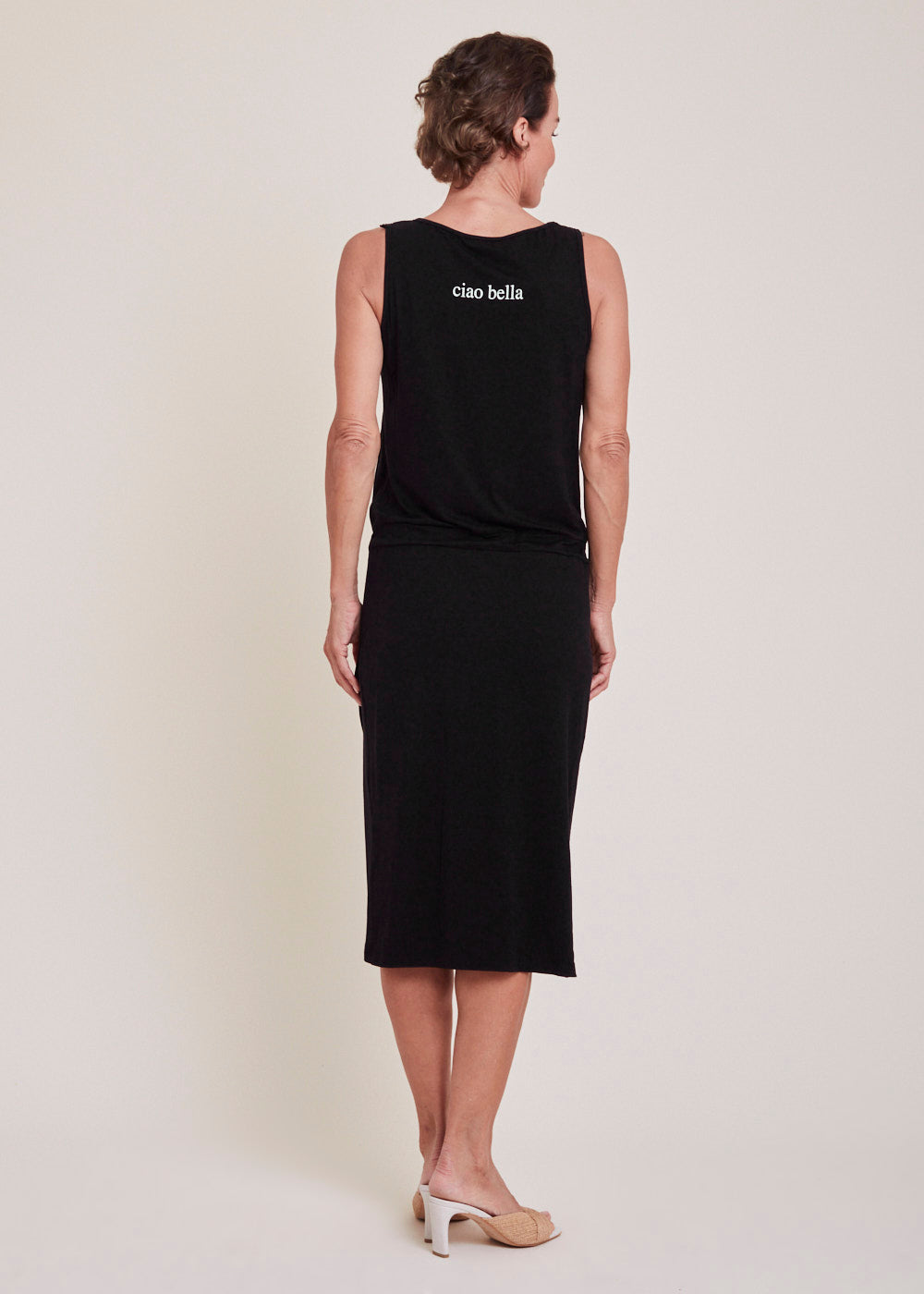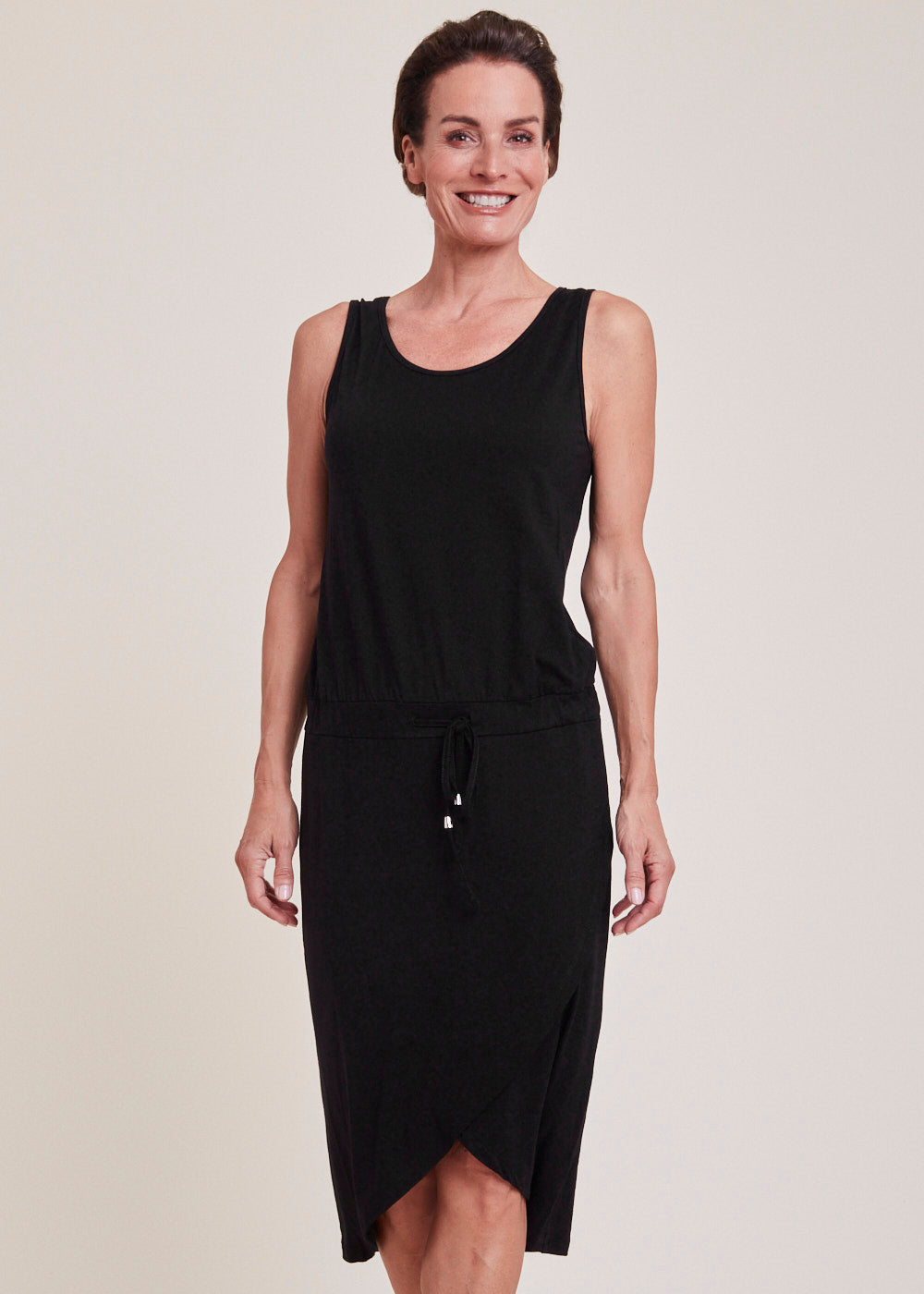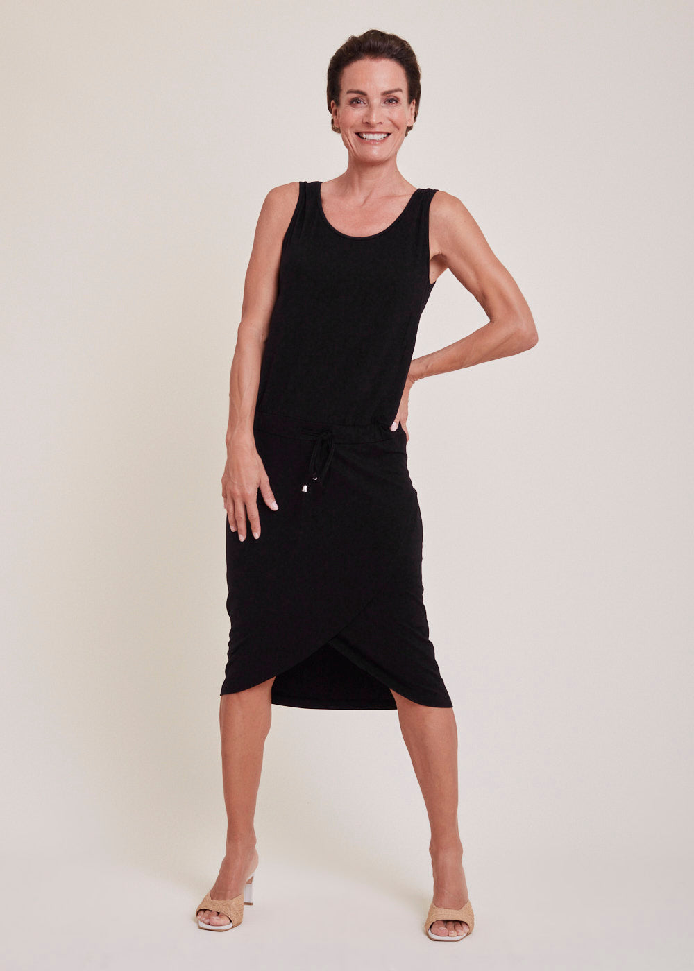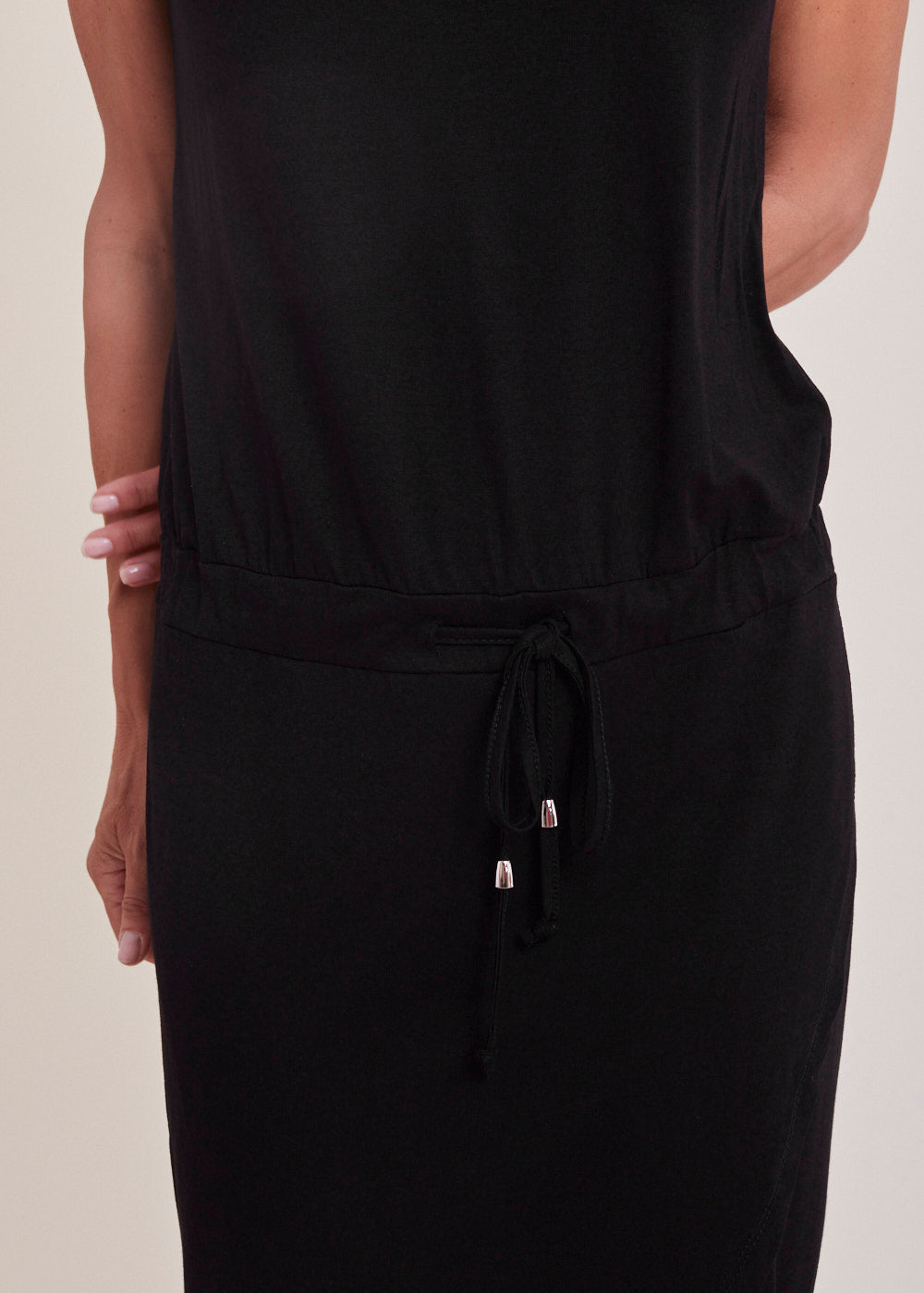 Bequemes, ärmelloses Kleid aus Jersey in Wickeloptik. Das Kleid hat einen Rundhalsausschnitt und einen Gummizug auf Leistenhöhe. Auf dem Rücken überzeugt das Kleid mit einem kleinen italienischen Print. Perfekt für einen Ausflug zur Strandbar!