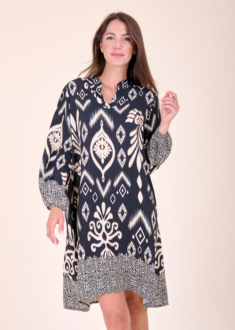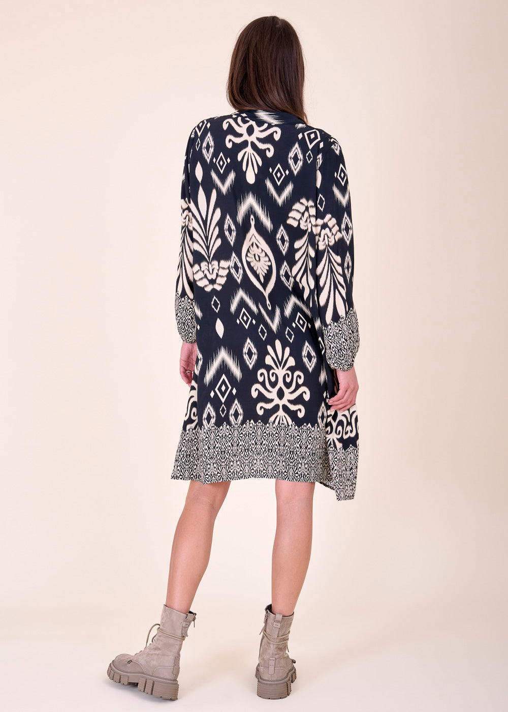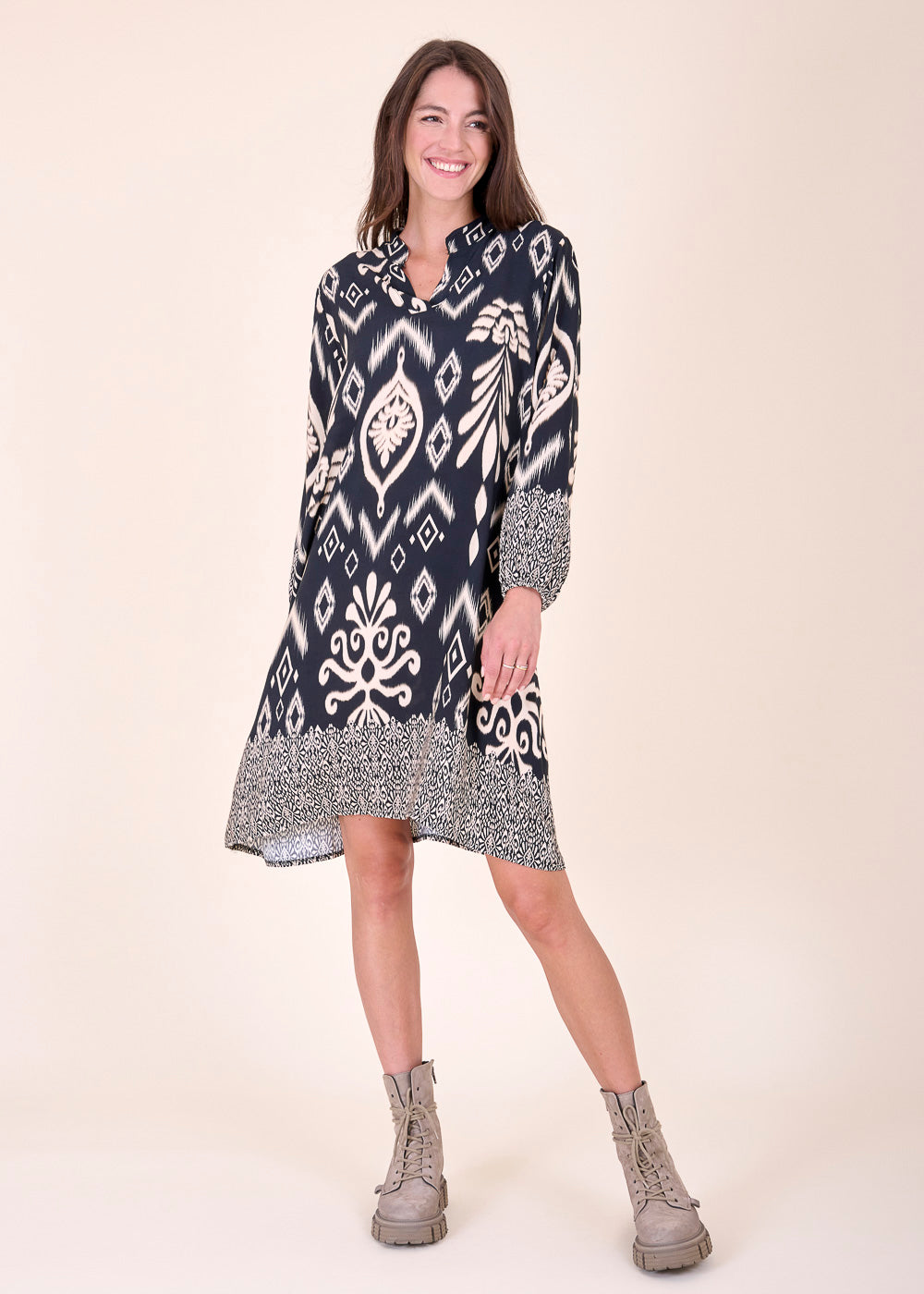 Dieses Kleid erstrahlt in gedeckten Farben und einem All-Over-Print-Muster. Der Volant-Rock sorgt für ein luftig-leichtes Tragegefühl. Das Kleid besitzt einen V-Ausschnitt und einen angedeuteten Kragen. Ein absoluter Hingucker.