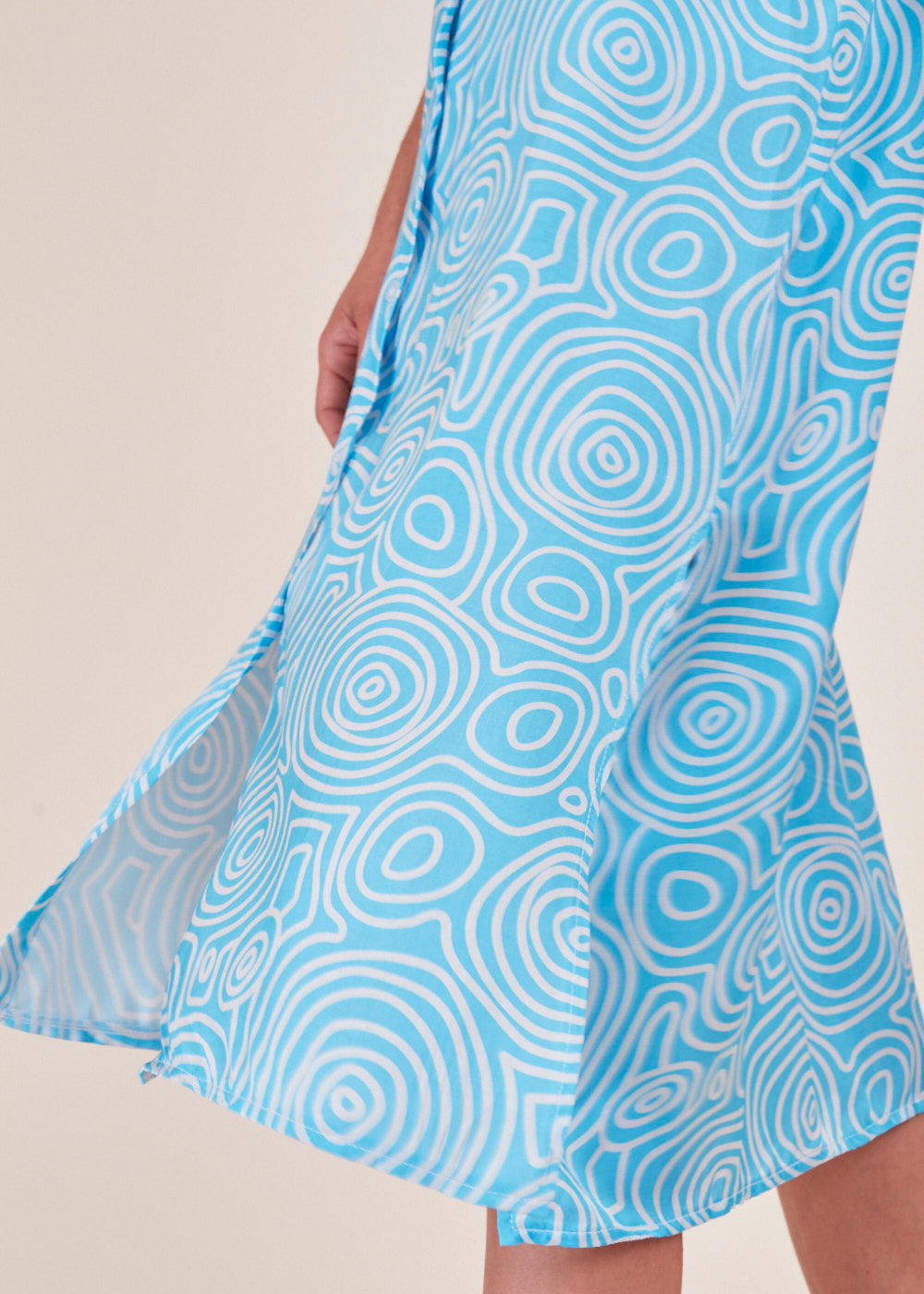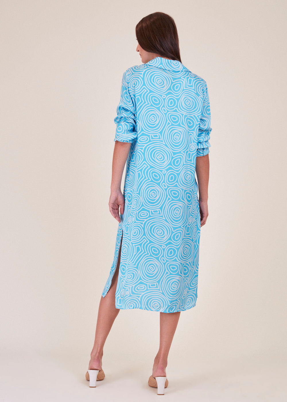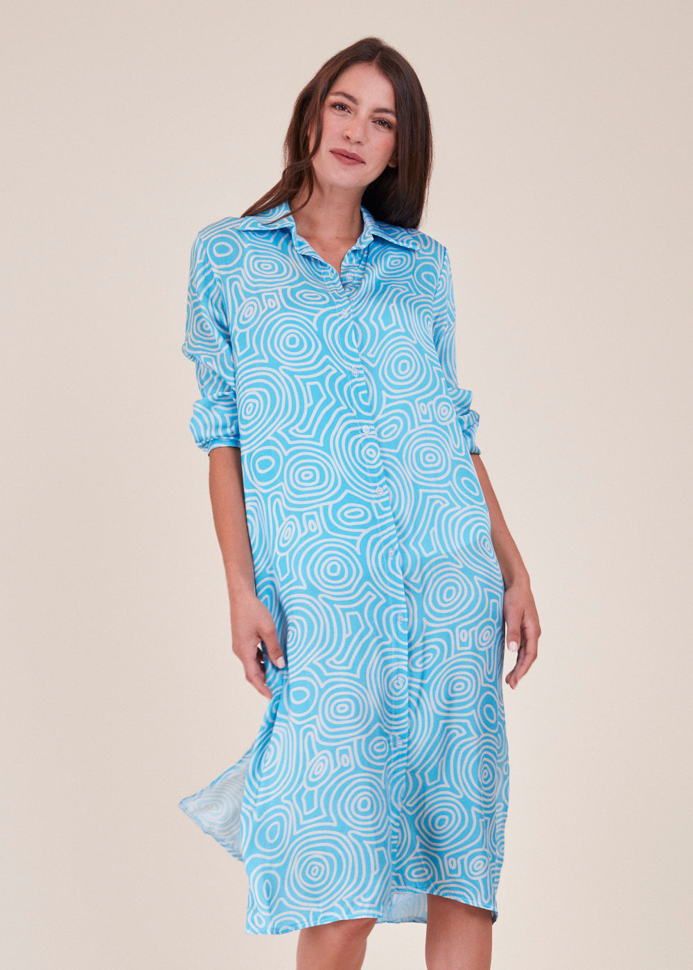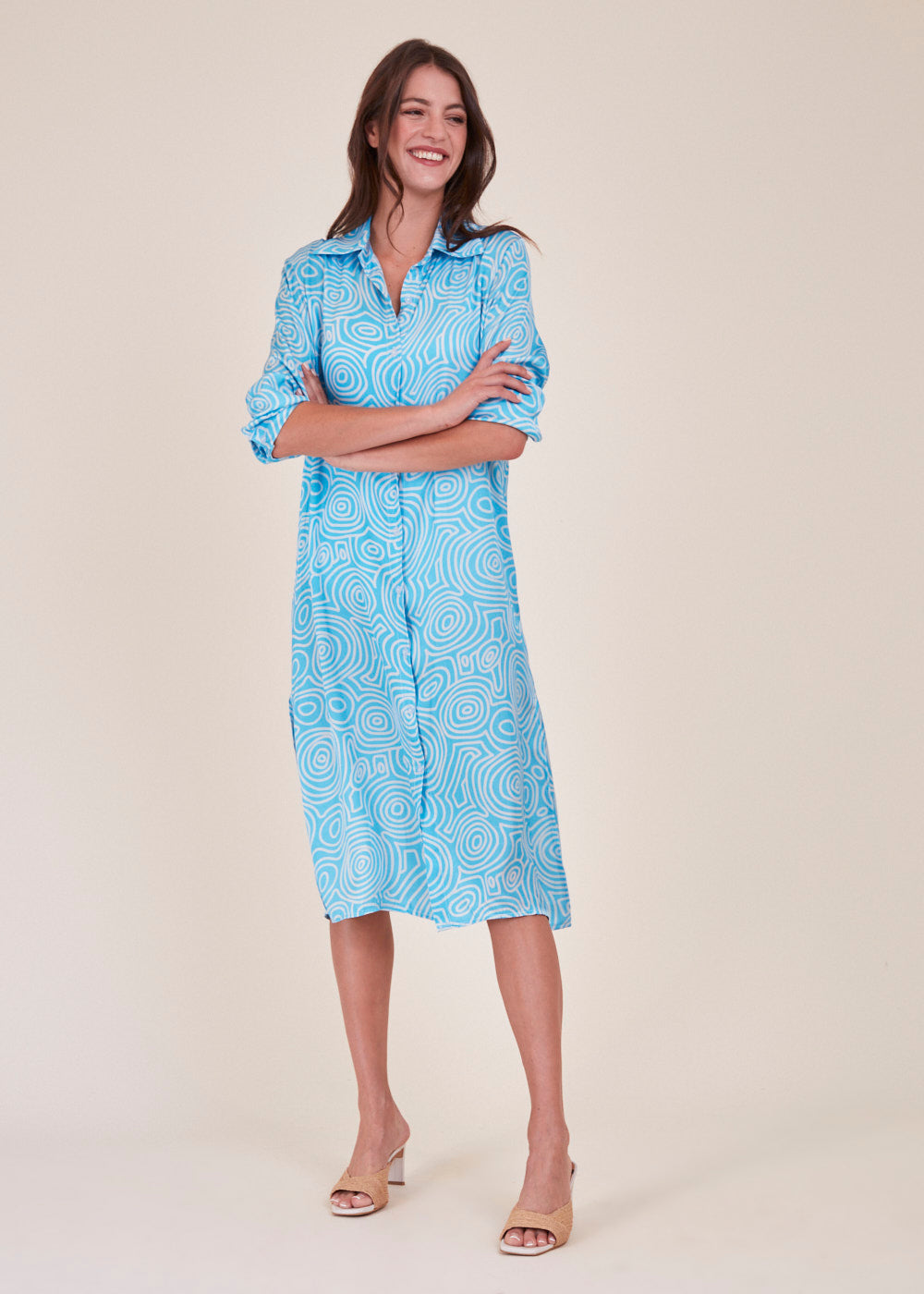 Wundervolles Midikleid mit durchgezogener Knopfleiste, Hemdkragen und seitlichen Schlitzen. Das Kleid hat lange Ärmel, die mit einem Knopf verschließbar sind. Der All-Over Print erstrahlt in der frischen Sommerfarbe und überzeugt durch seine Leuchtkraft. Die Schultern sind leicht überschnitten.
