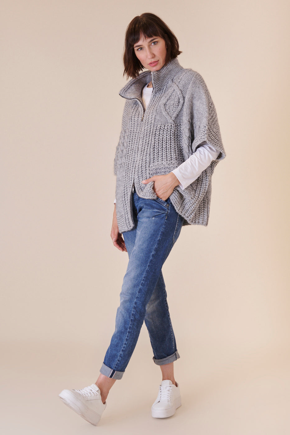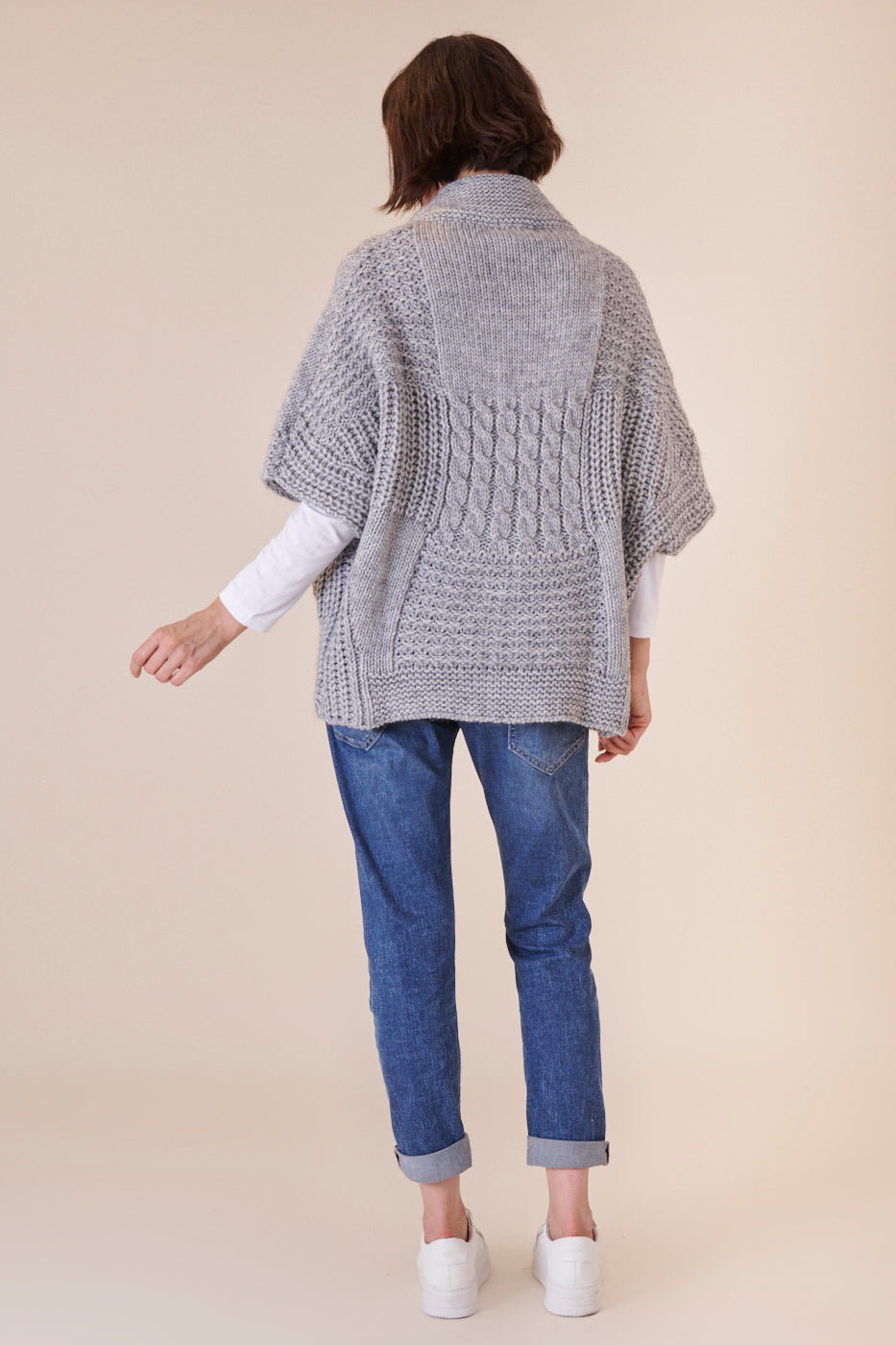 Unser geliebtes Strickcape mit kurzen Armen ist der perfekte Begleiter zum drüber werfen. Durch sein Unifarbenes Design lässt er sich wunderbar kombinieren und macht dabei noch eine richtig gute Figur. Mit diesem extravaganten Strickstück sind wir für alle Fashion-Fälle gewappnet.
