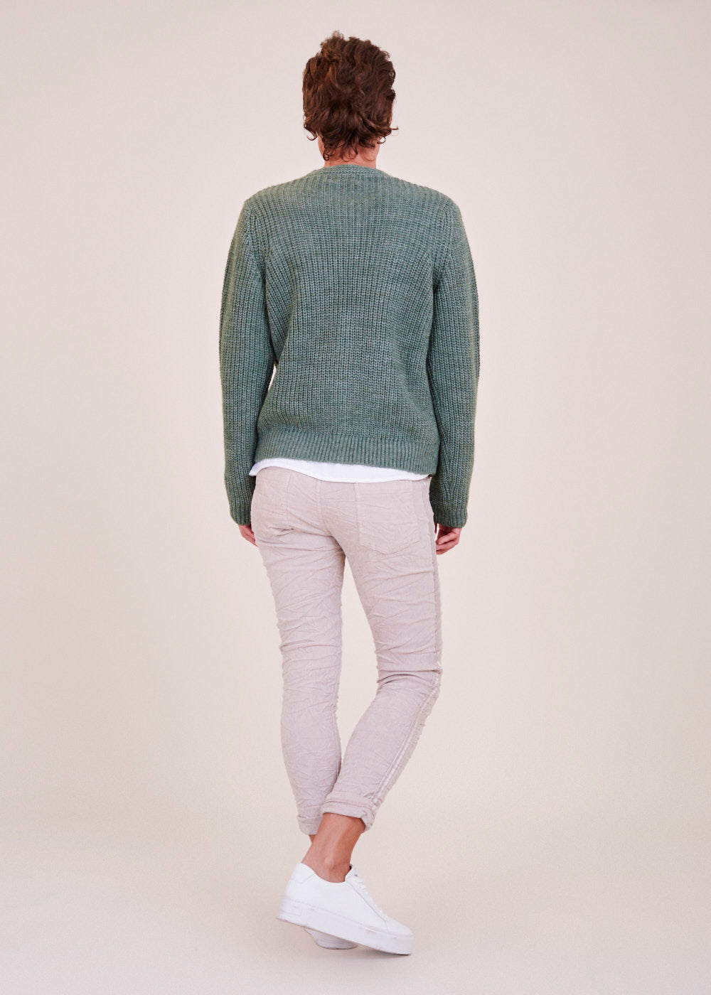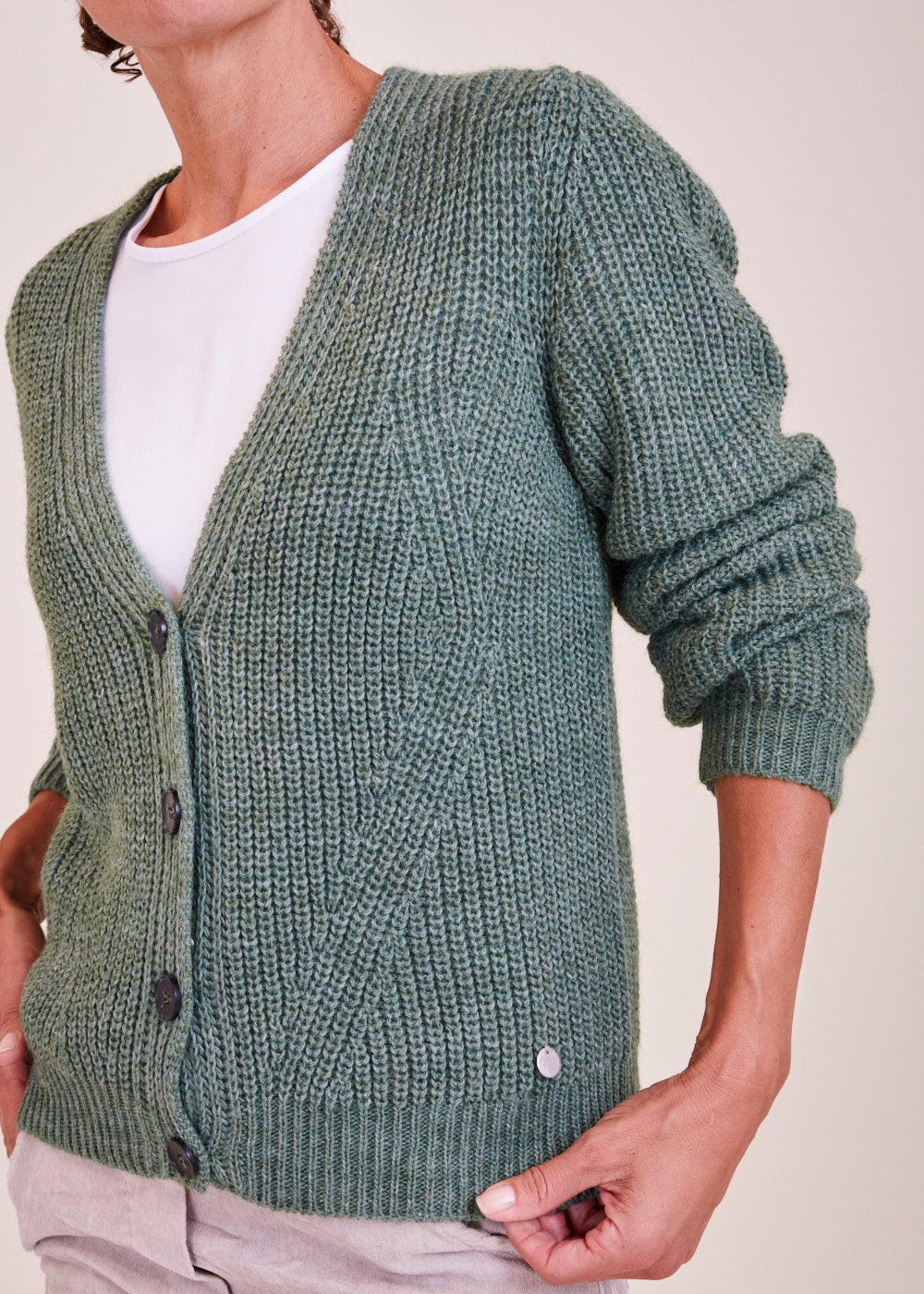 Kurz und kastenförmig geschnittene Strickjacke mit langen Armen in einem großartigen Grün Ton. Sie hat ein Rippenbündchen an den Ärmeln und am Saum. Durch die vier besonderen Frontknöpfe lässt sich diese Jacke wunderbar geschlossen tragen. Kuschelig weicher Tragekomfort mit absoluter Wohlfühlgarantie.