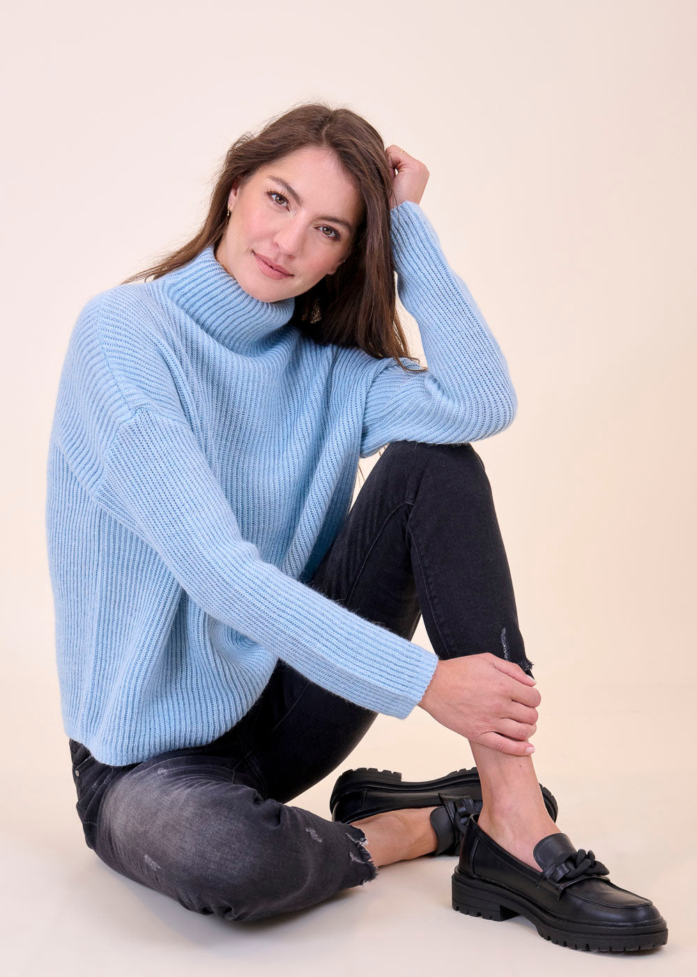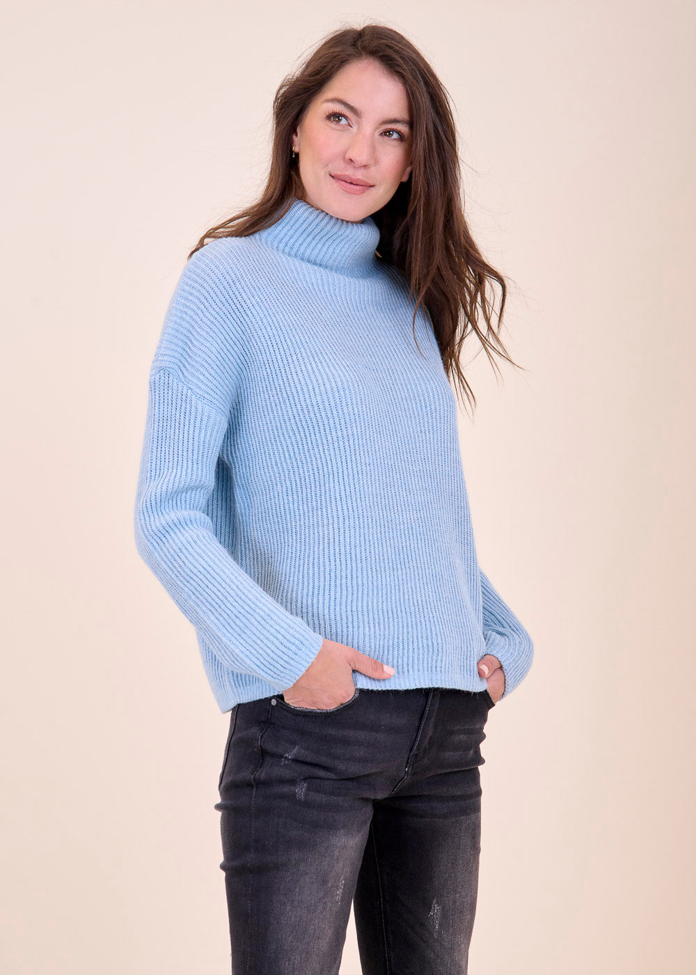 Strickpullover mit Rollkragen aus einem angenehmen Garn. Er hat überschnittene Schultern und eng geschnittene Arme. Der perfekte Pullover für kältere Tage.