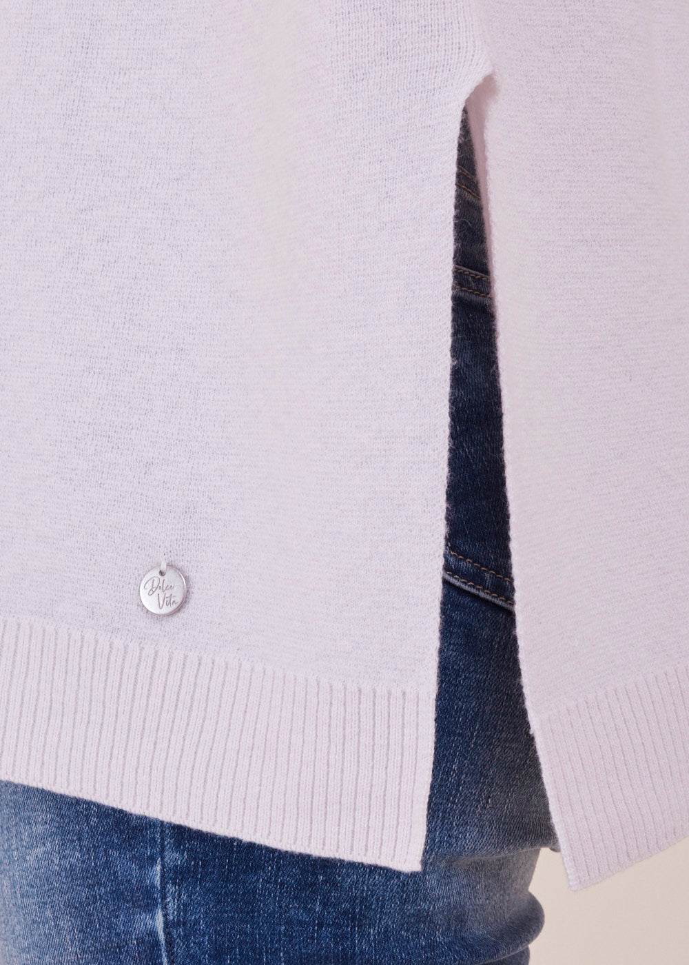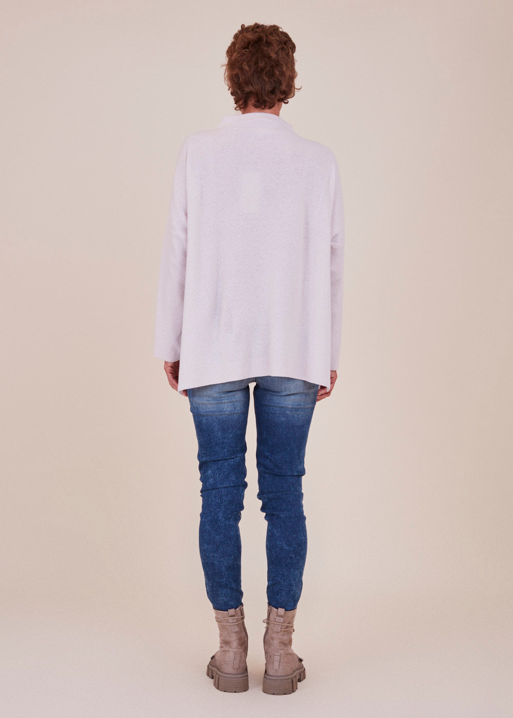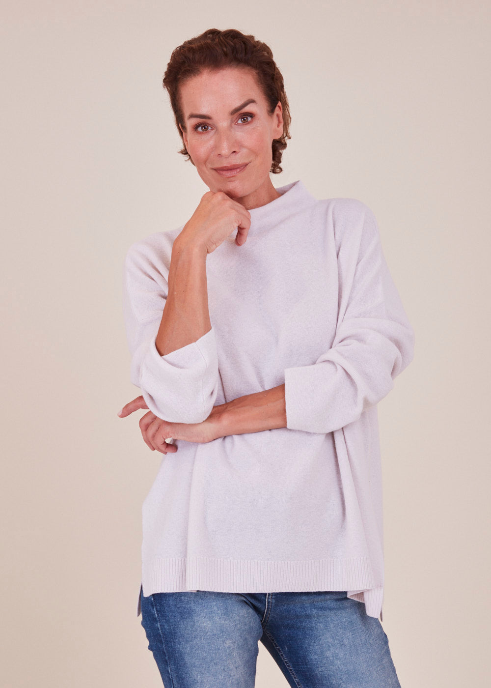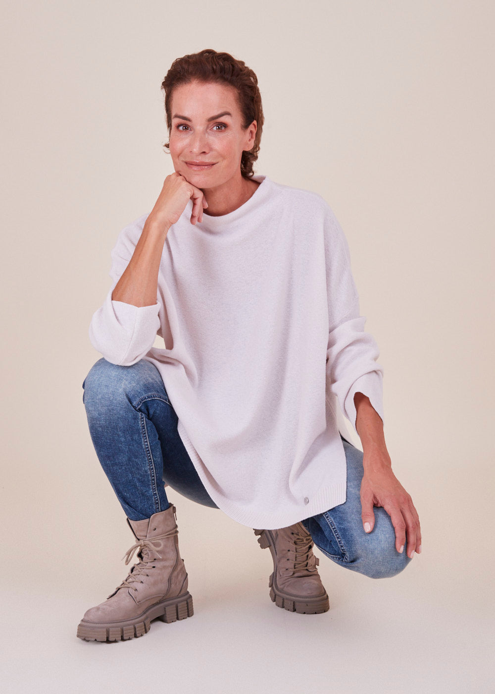 Lässig geschnittener Pullover mit Stehkragen. Er hat einen kastenförmigen Schnitt und ist mit Schlitzen an den Seiten versehen. Das Rippenbündchen am Saum, sowie das kleine Metallplättchen auf der rechten Seite machen den Pullover zu einem besonderen Hingucker. Ein besonderer Pullover mit vielseitigen Kombinationsmöglichkeiten.