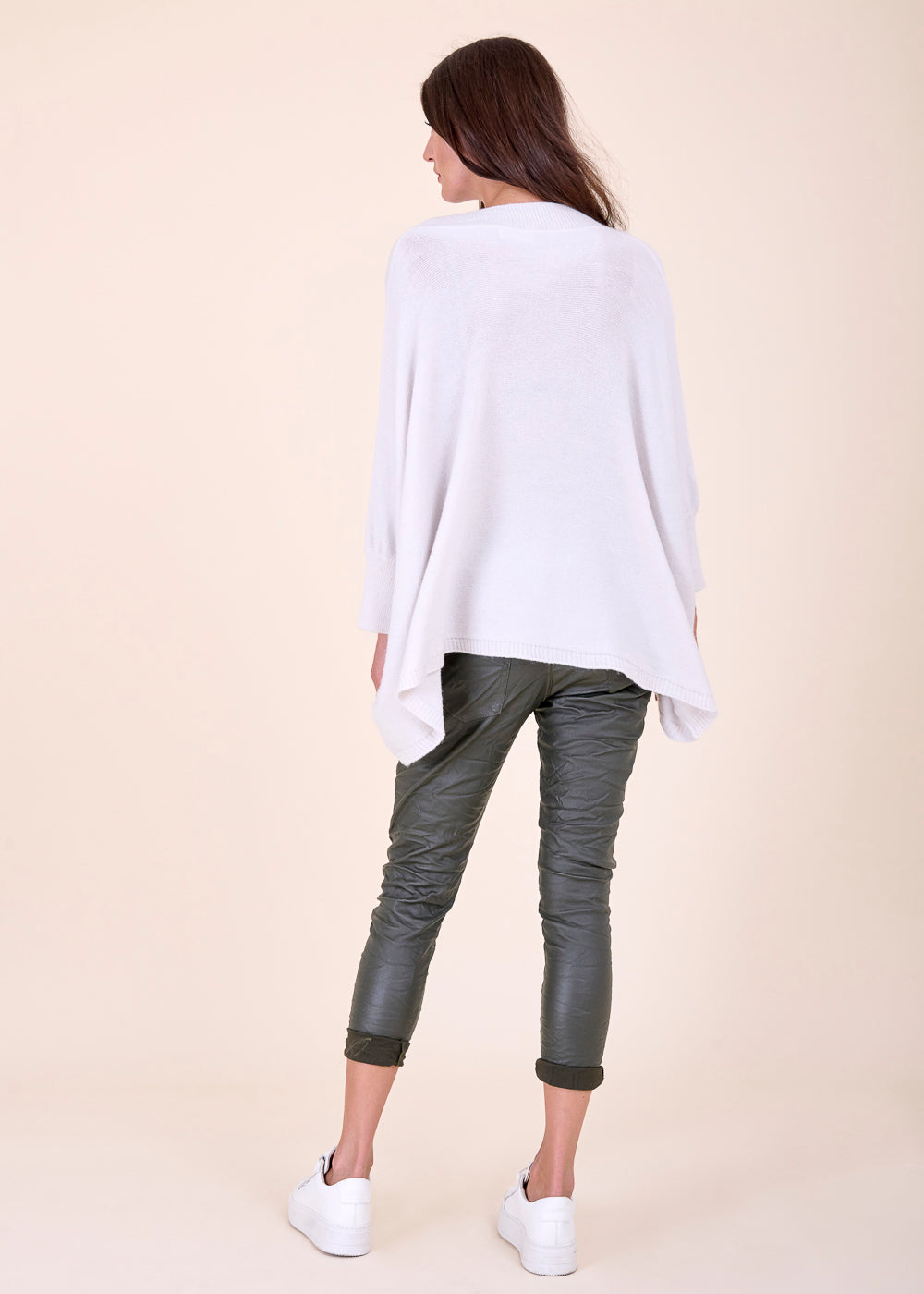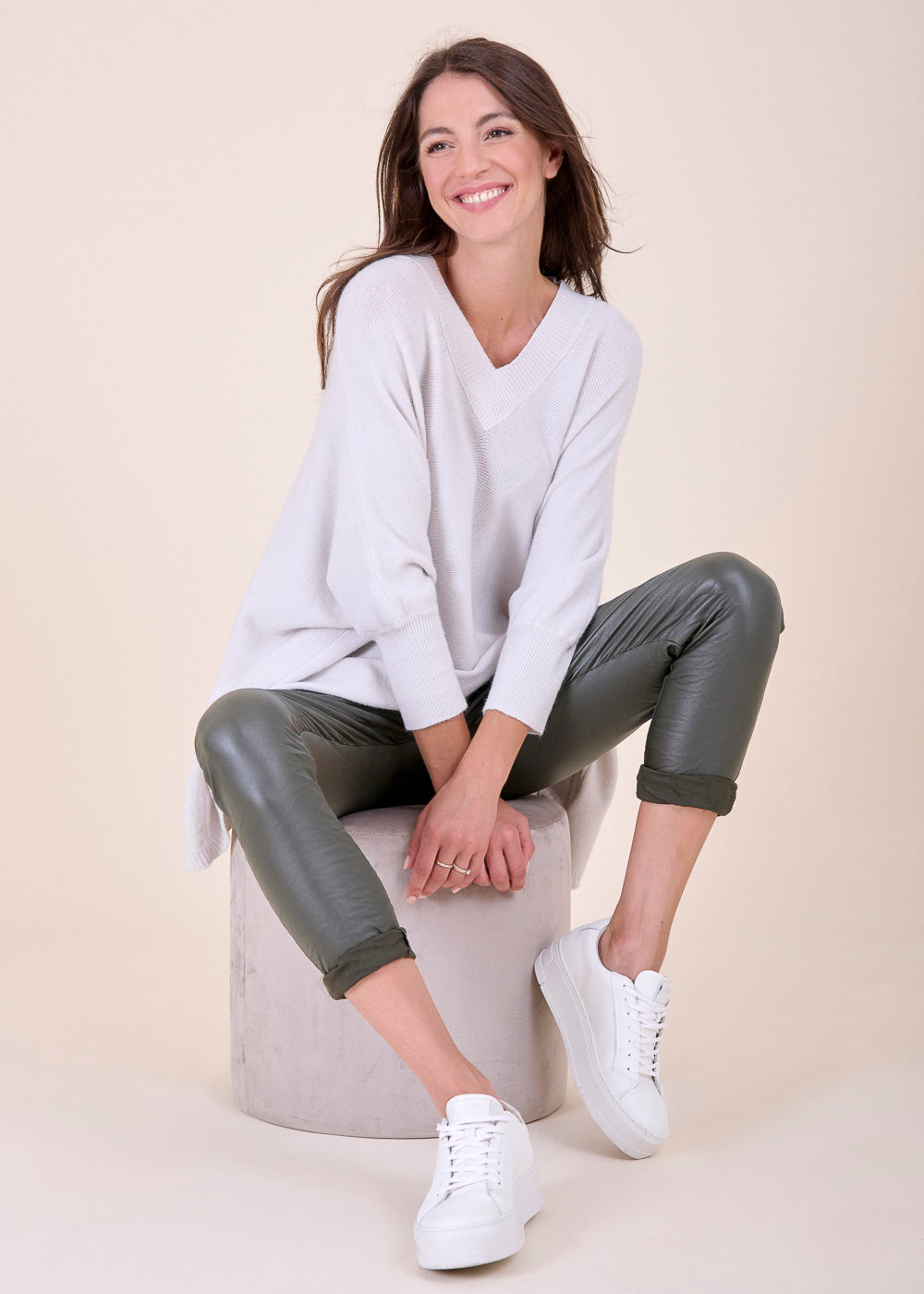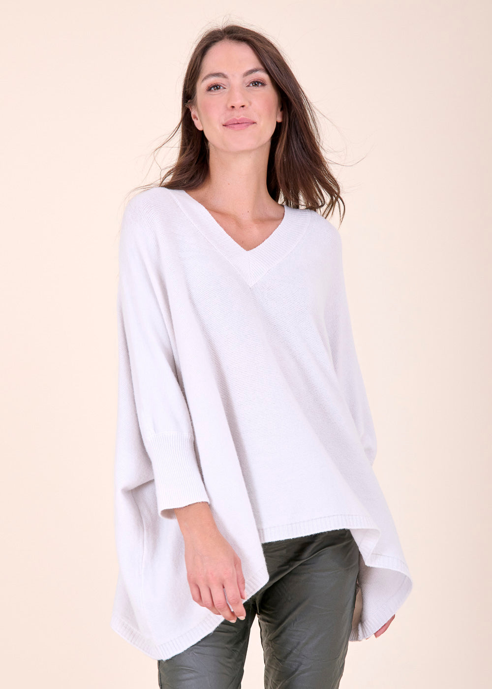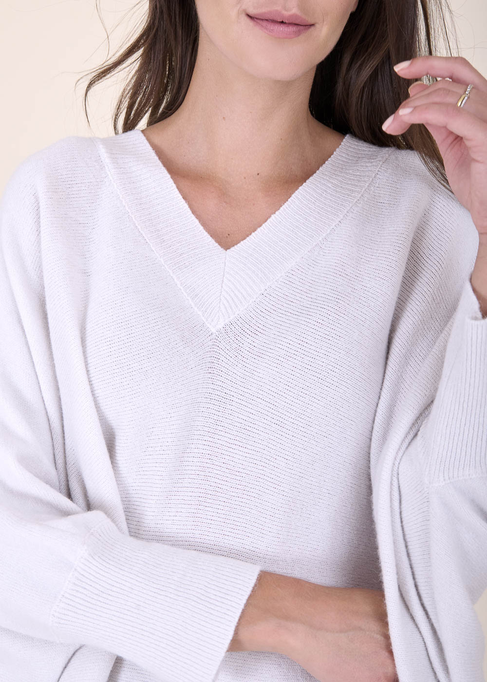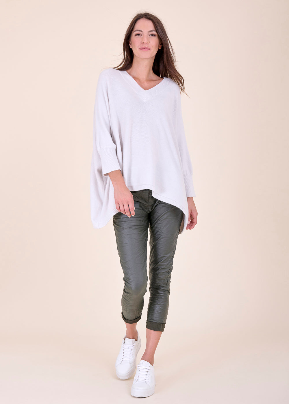 Unser gemütlicher V-Ausschnitt Pullover mit einem halben Arm. Er ist lässig, kastenförmig geschnitten und hat besondere Rippendetails an den Ärmeln, am Saum und im V-Ausschnitt Bereich. Ein großartiger Begleiter für den Herbst.