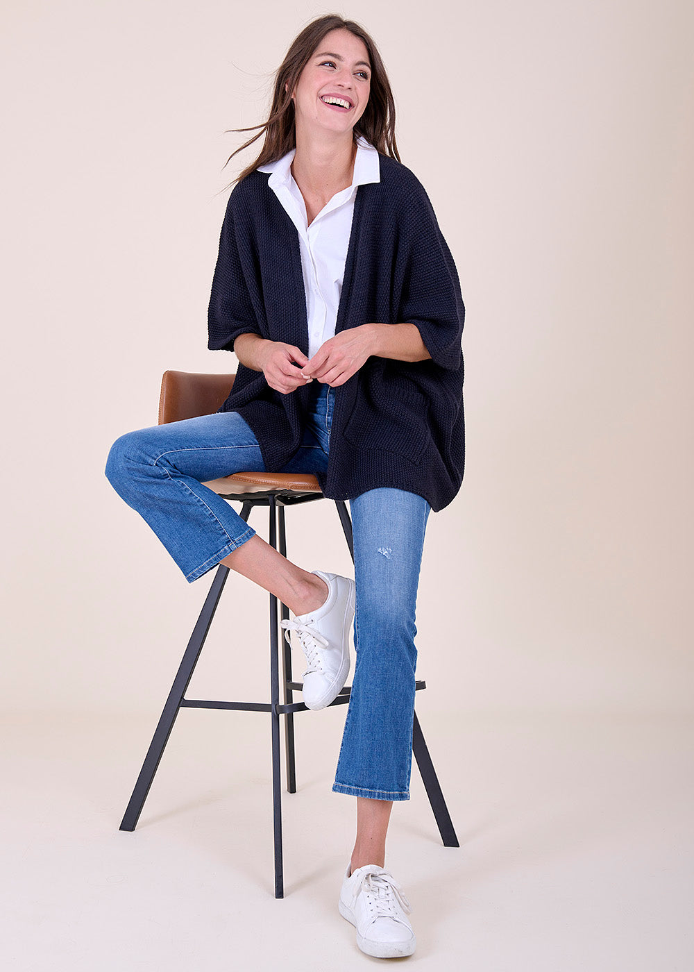 Wundervoller Mantella aus Strick in tiefem Blau mit seitlichen Eingriffstaschen. Ein wunderbarer Kombinationsartikel, der sich auch toll über ein Kleid tragen lässt.