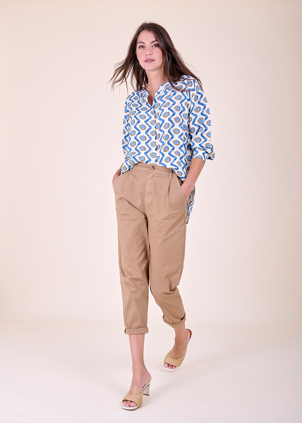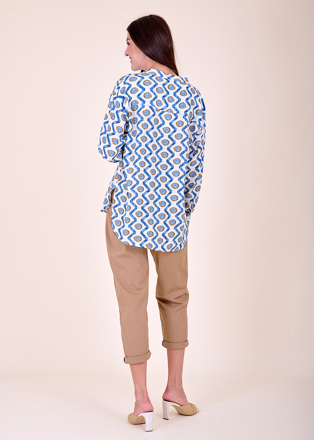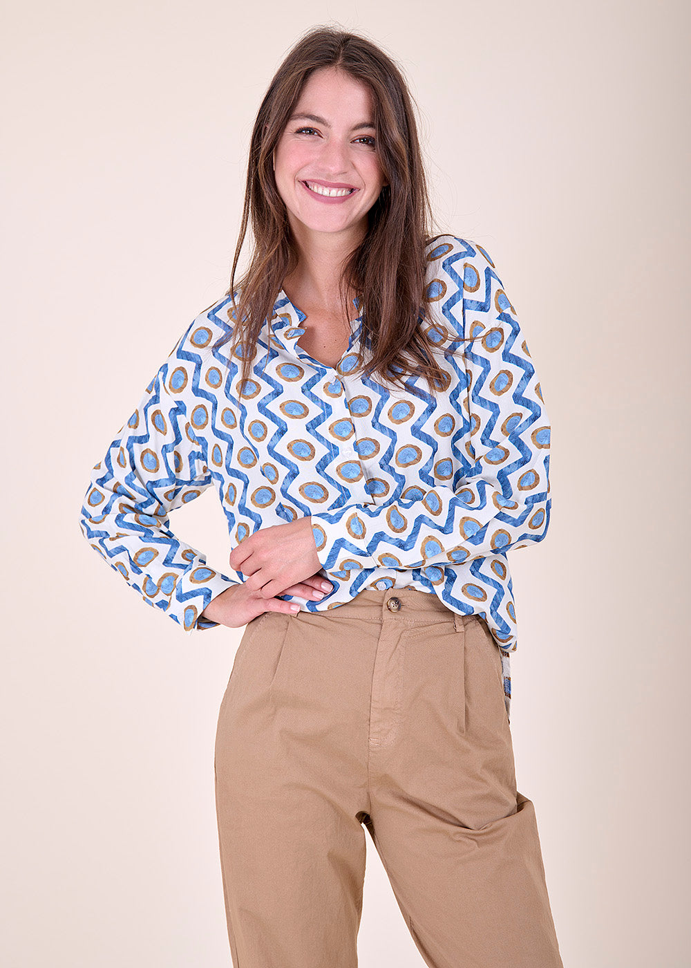Viskosebluse im All-Over-Print mit langen Ärmeln. Die Bluse hat einen kleinen Stehkragen und einen leichten V-Ausschnitt, der in eine durchgezogene Knopfleiste mündet. Der Schnitt der Bluse ist gerade.