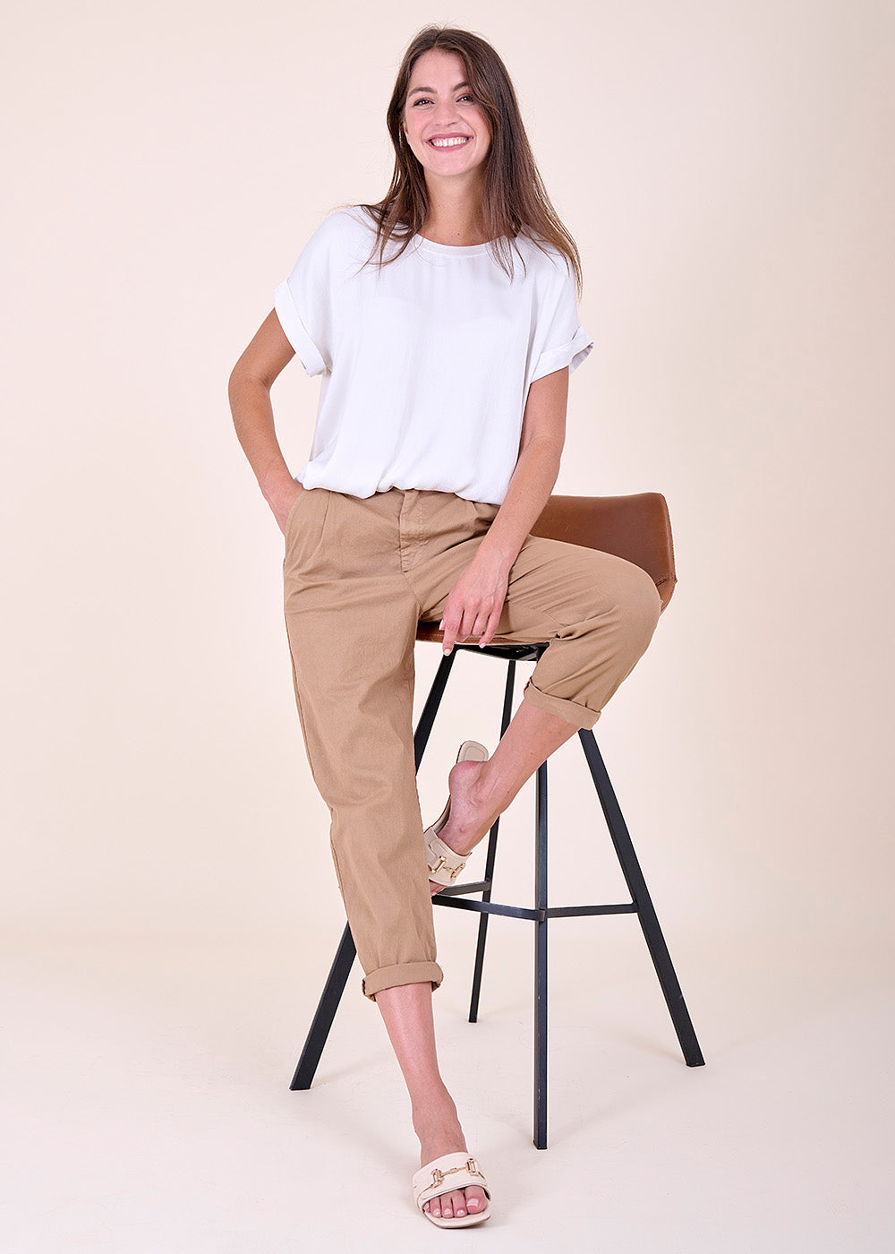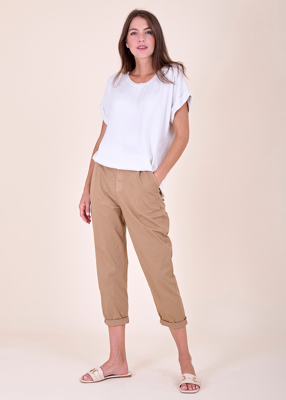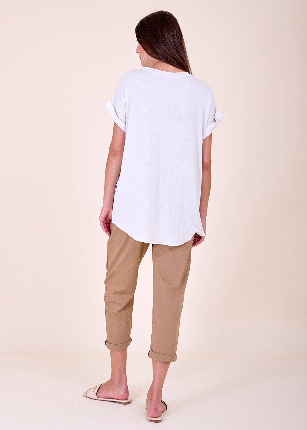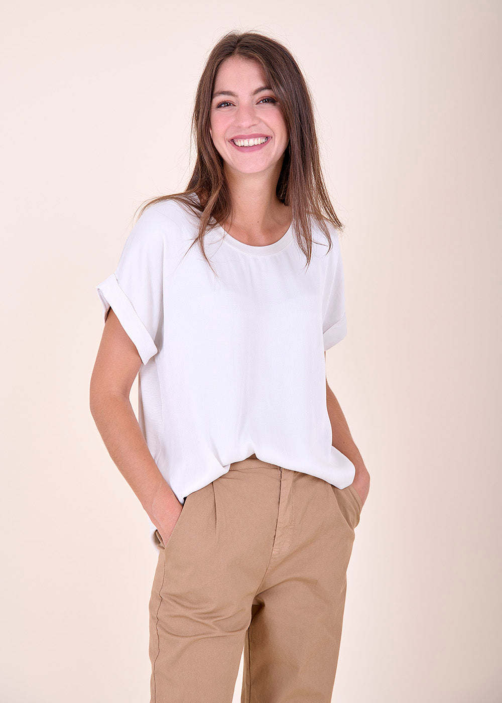 Wundervolles T-Shirt mit Rundhalsausschnitt und überschlagenen Ärmeln. Das Shirt besteht aus einem Materialmix, dass auf der vorderen Seite glänzend erscheint und auf der Rückseite durch bequeme Jersey-Qualität überzeugt.