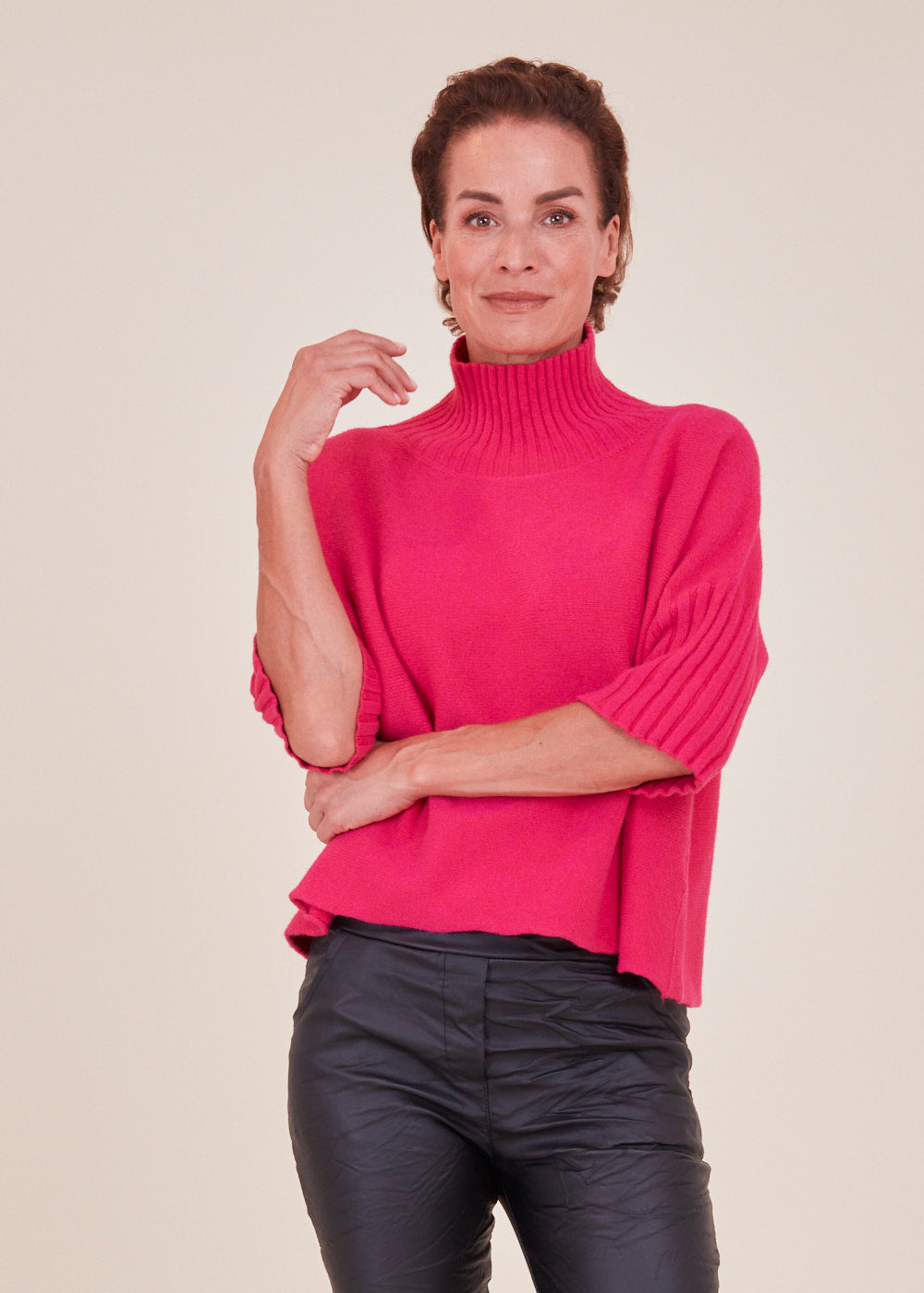 Kurz geschnittener Strickpullover mit Rollkragen aus unserem Kuschelgarn. Er hat ein Rippenbündchen am Kragen und an den Ärmeln. Mit kurz geschnittenen Armen.