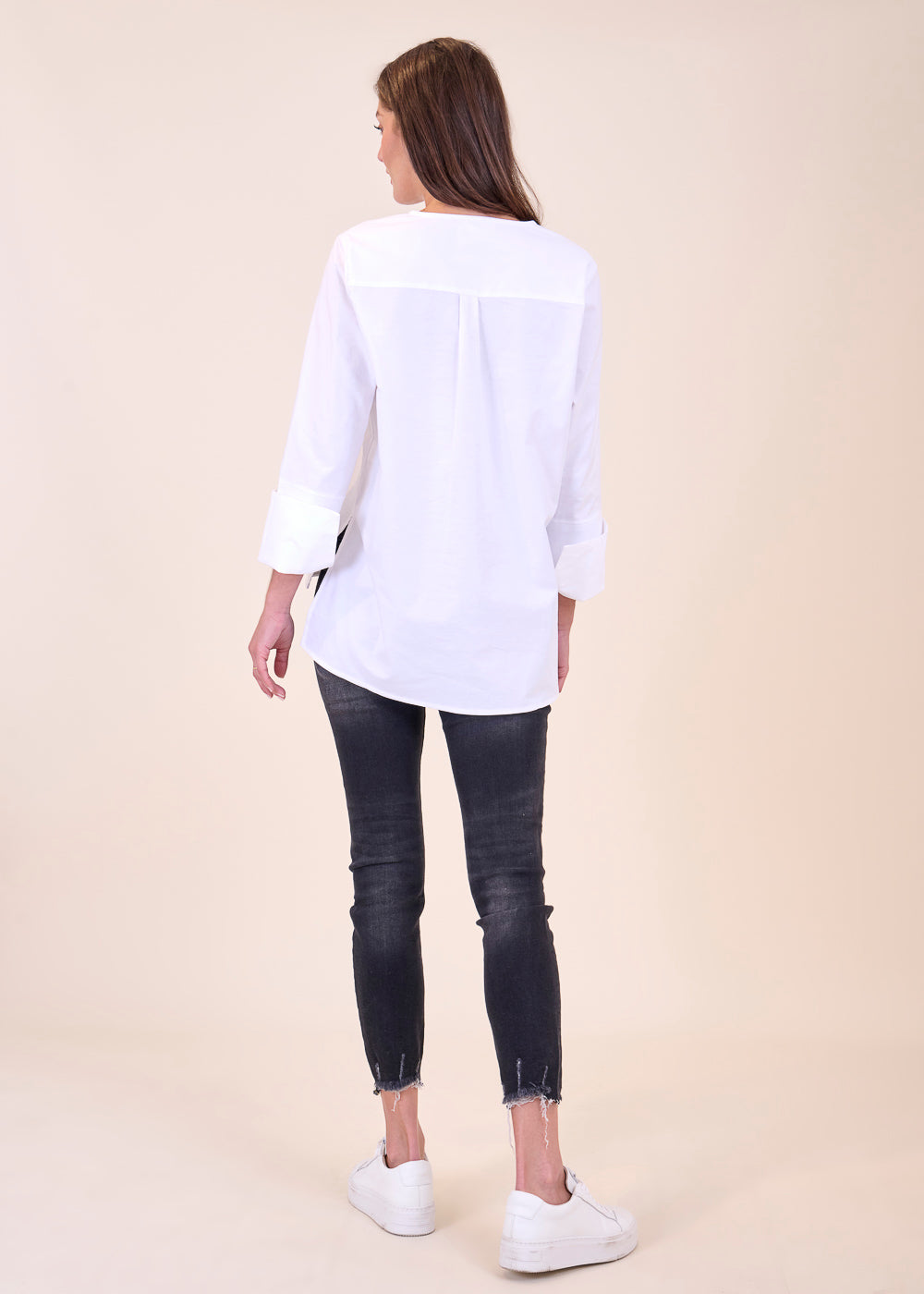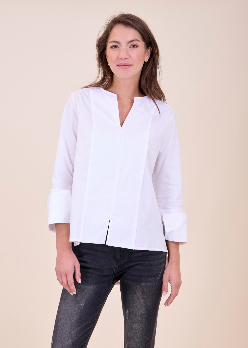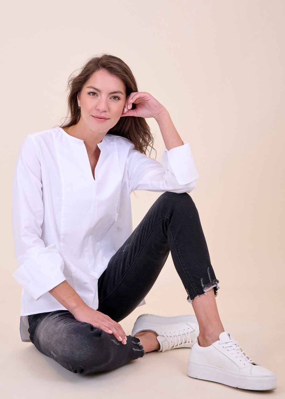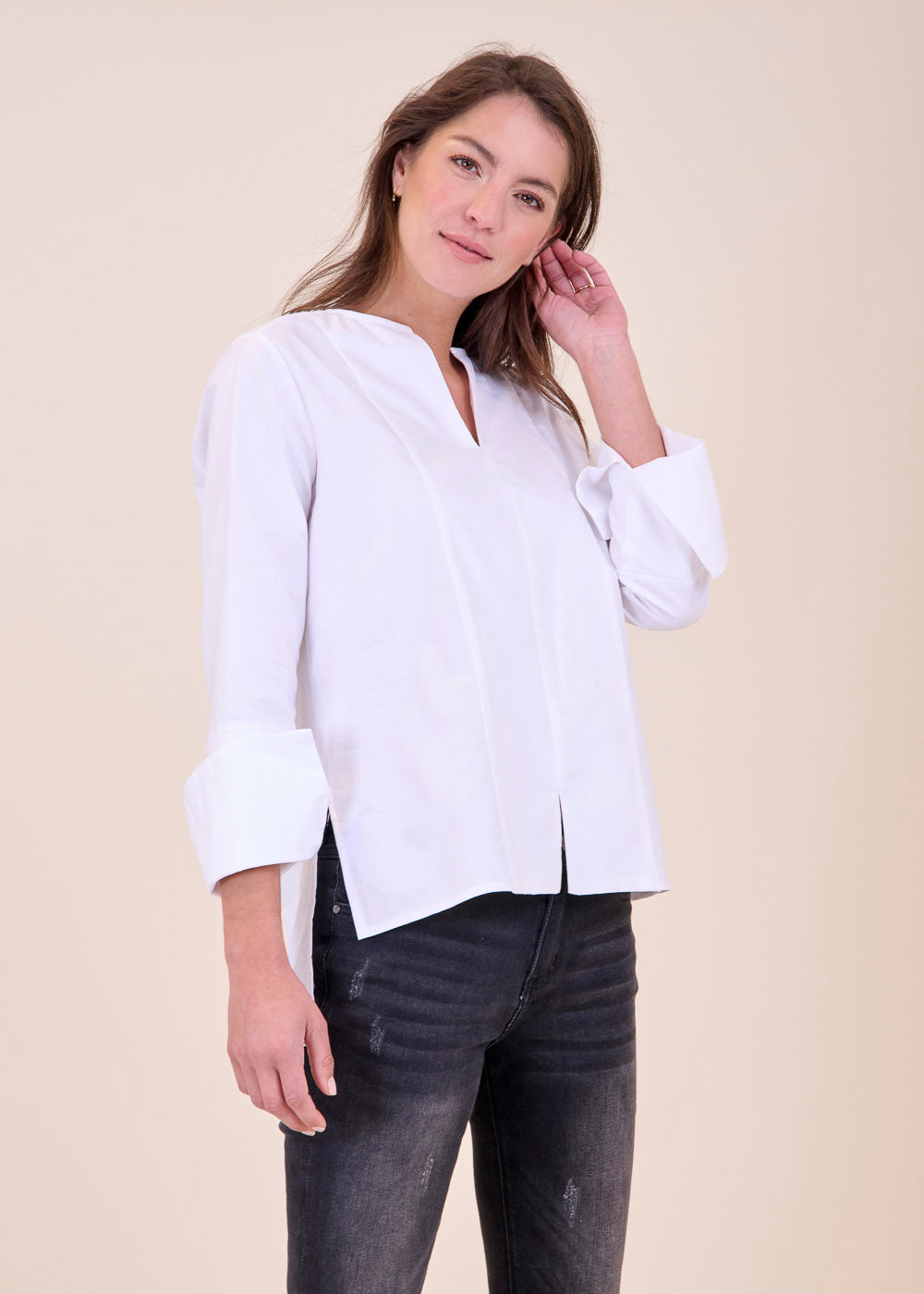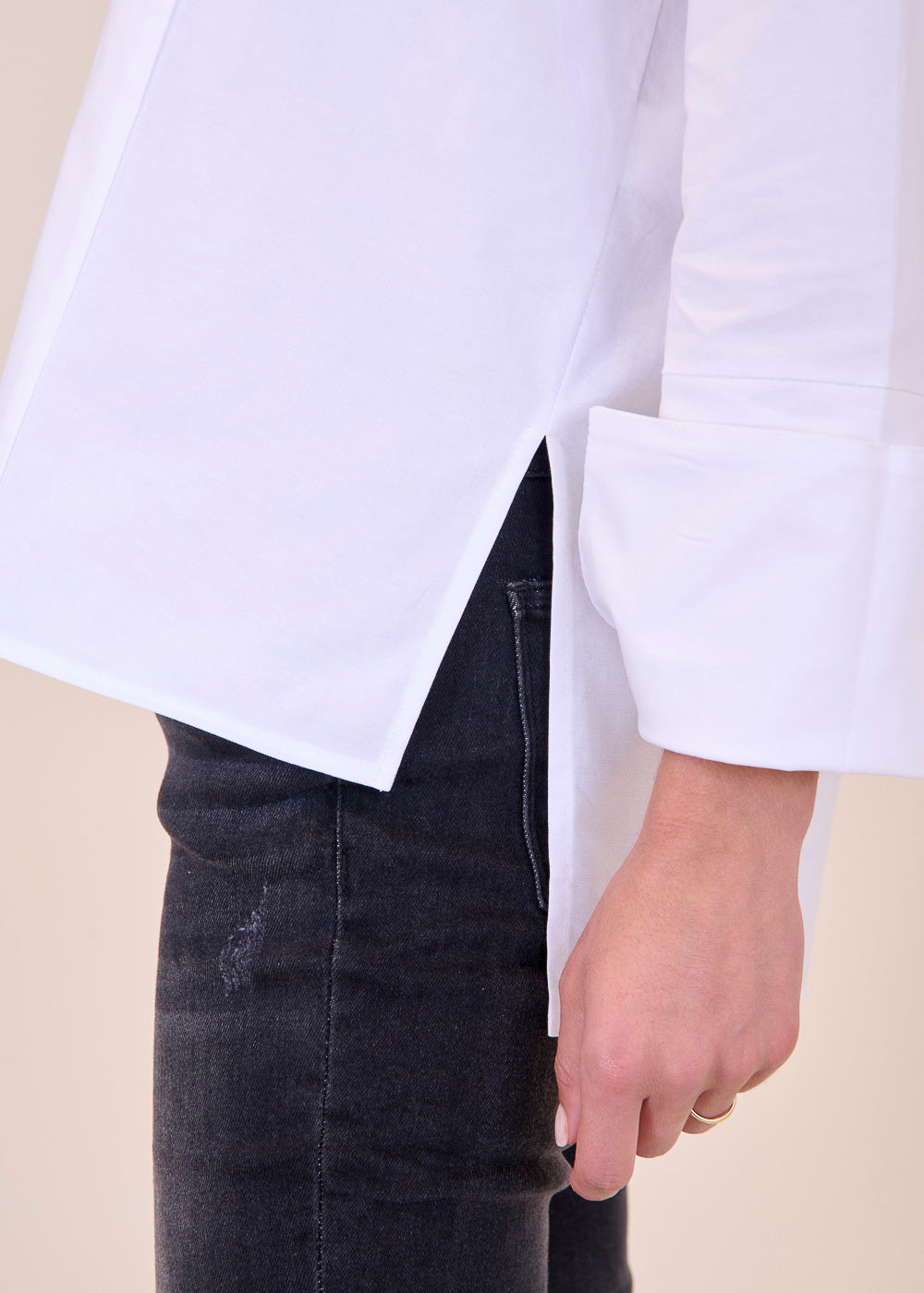 Fantastische Fashion-Bluse mit Schlitzen am Dekoltée, am Bund und an den Seiten. Die Bluse hat einen asymmetrischen Schnitt, der sich nach Hinten verlängert und lange Ärmel, die glockenförmig auslaufen. Ein umwerfendes Must-Have für echte Modeliebhaber!
